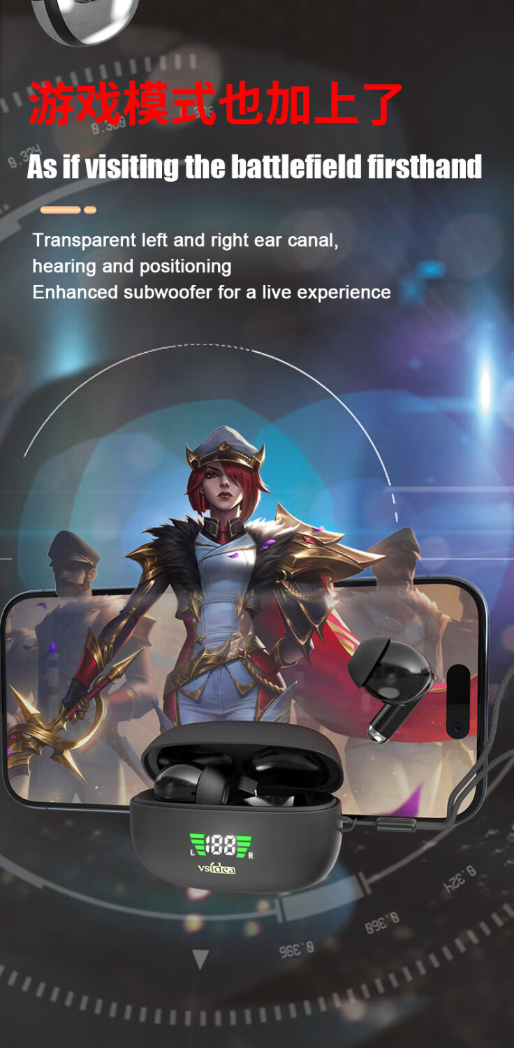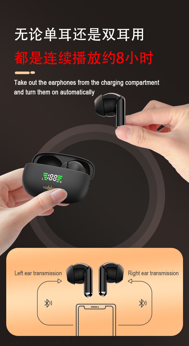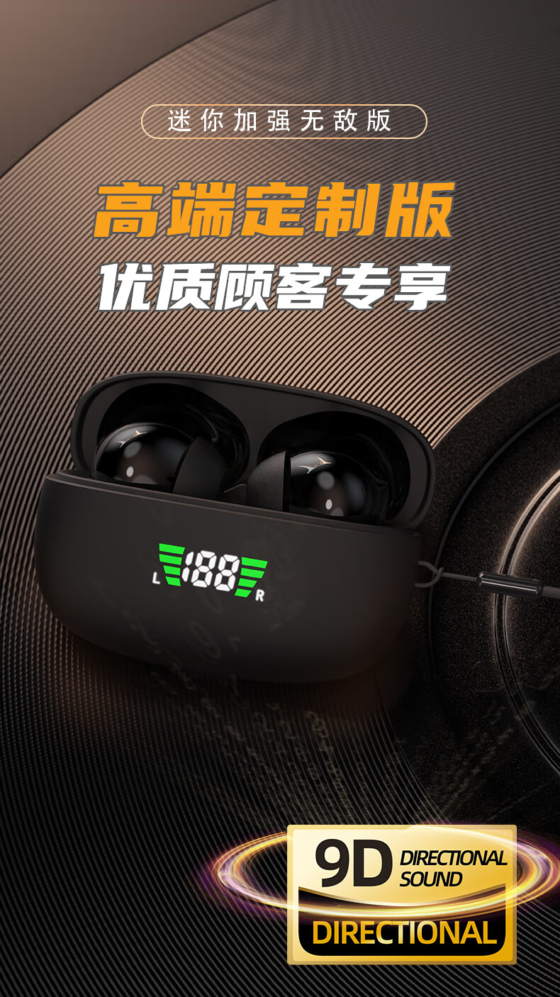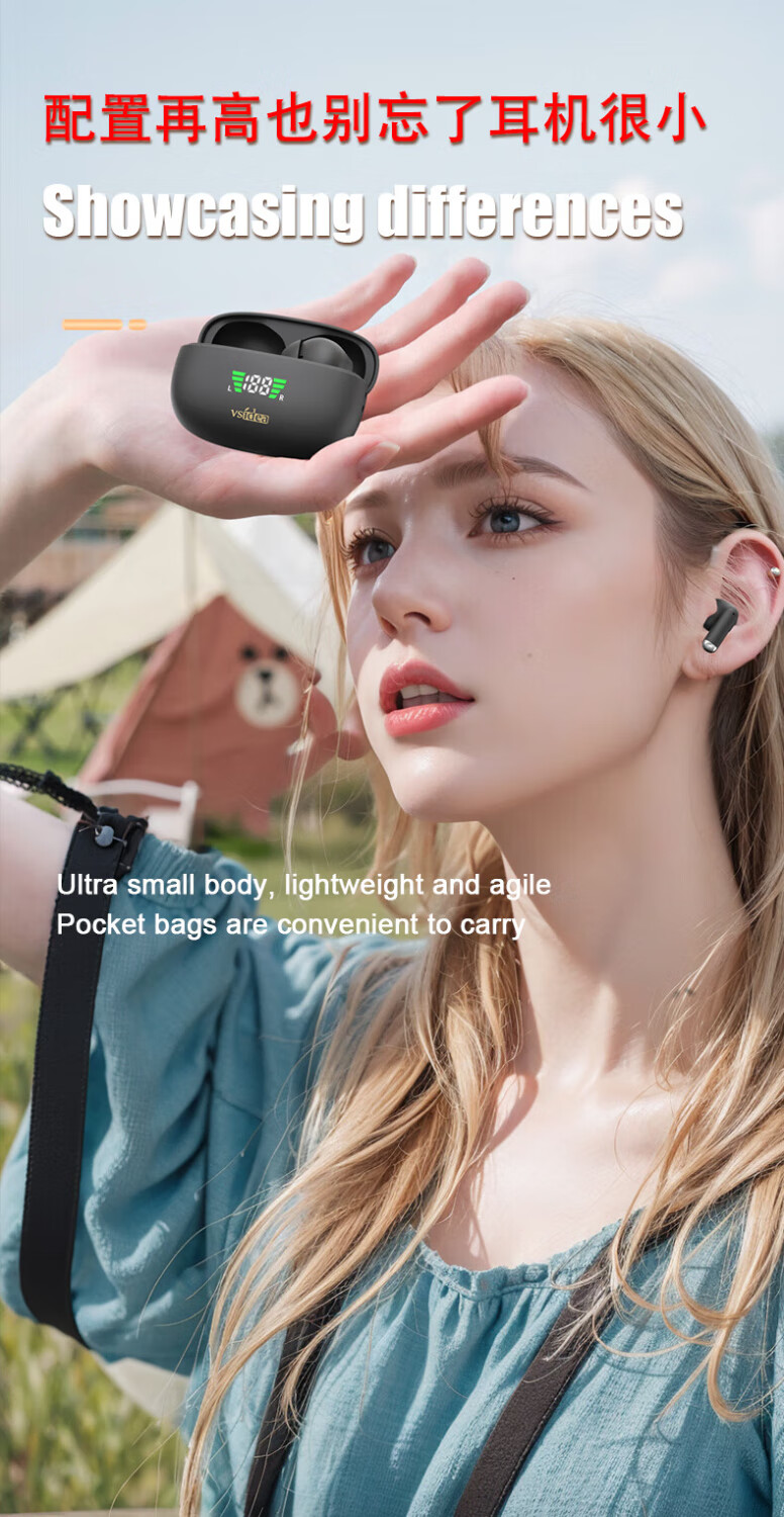 vsidea超重低音炮无线耳机蓝牙5.4迷你半入耳式HIFI立体声环绕大音量长续航超小可爱定制特供版 黑色(有数显)