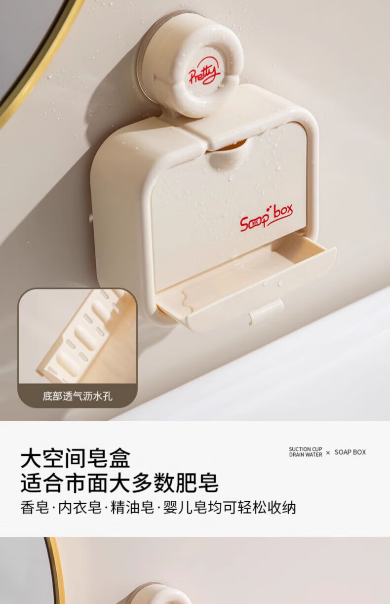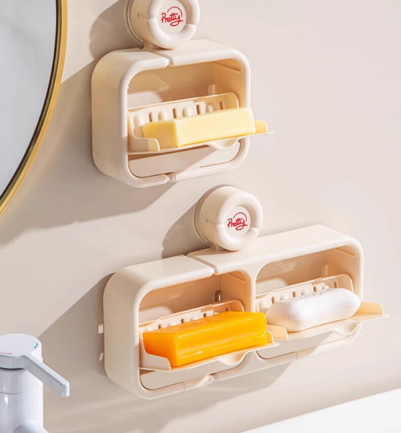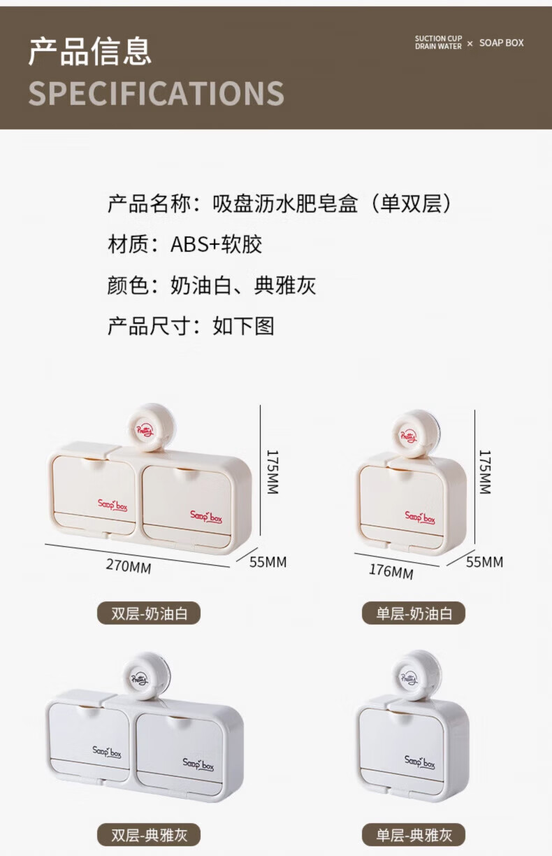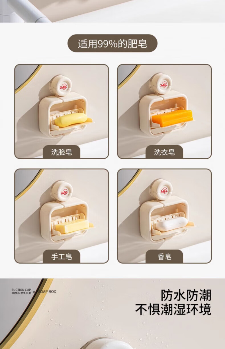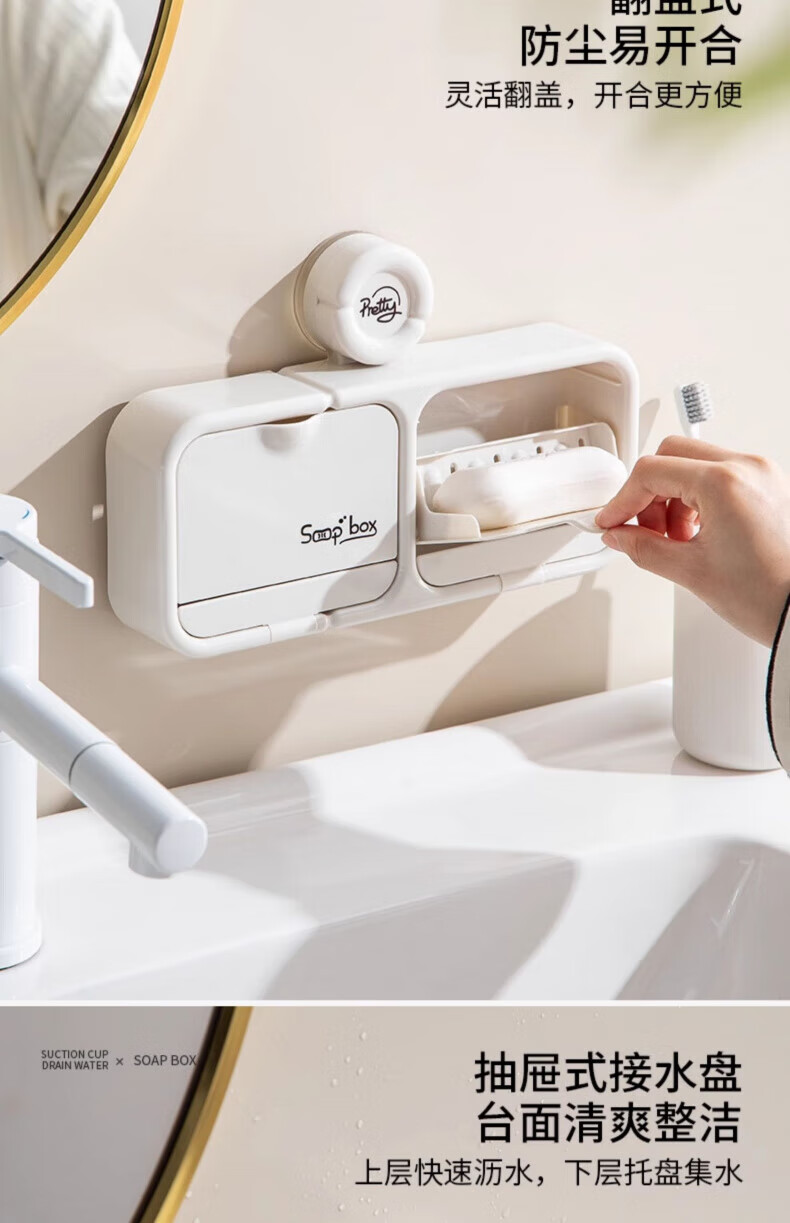 AILUKI日本高端吸盘翻盖沥水肥皂盒壁挂式免打孔置物架沥水盒家用香皂盒 典雅灰【双格】