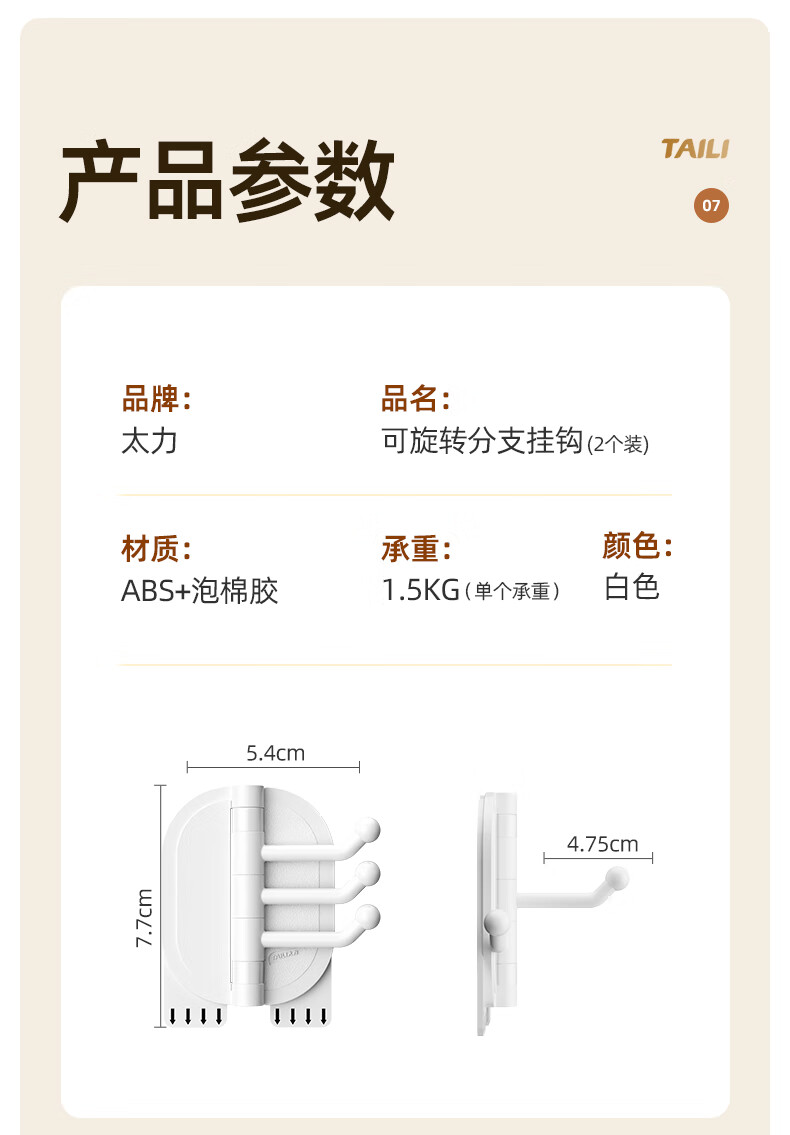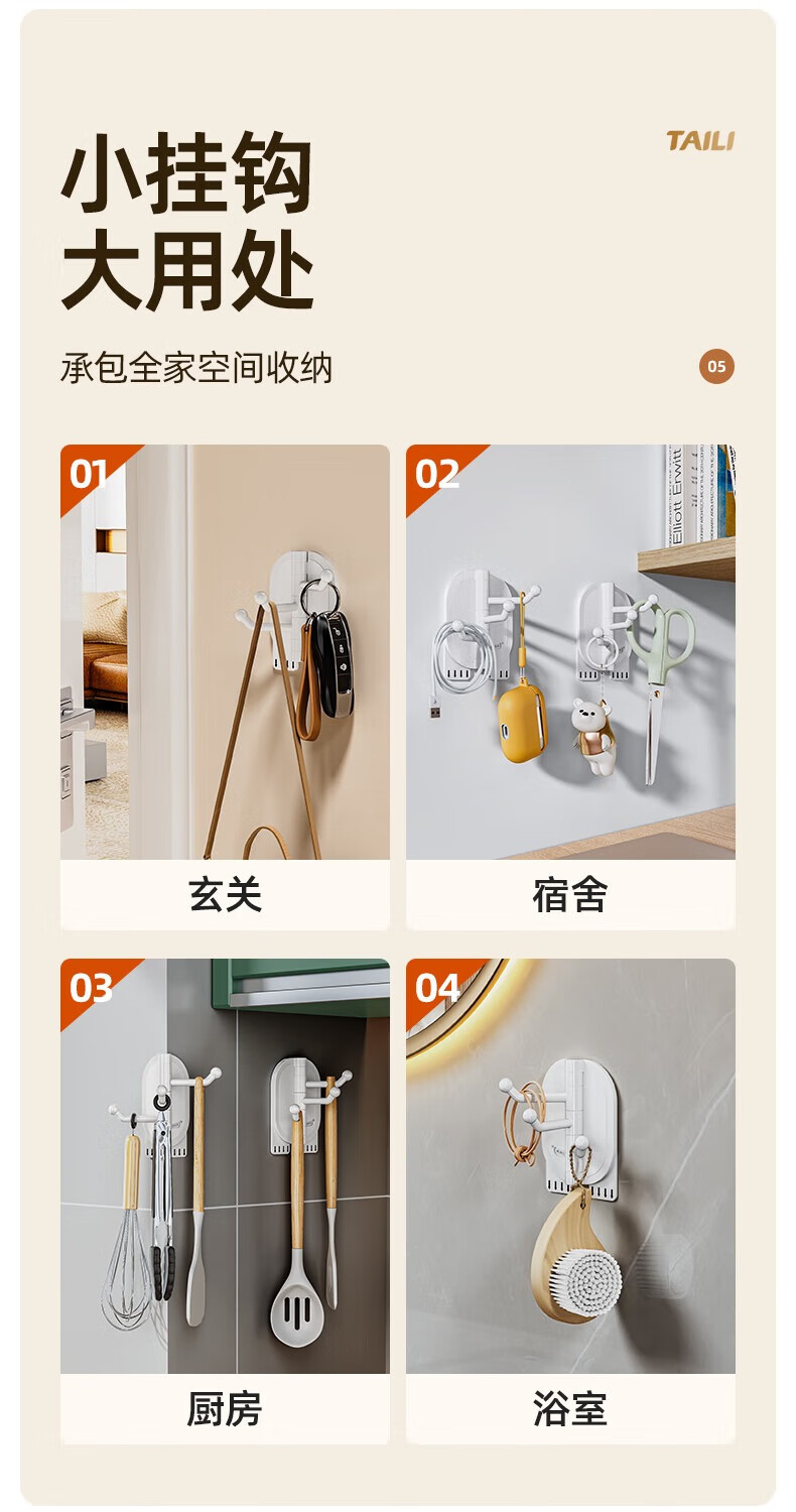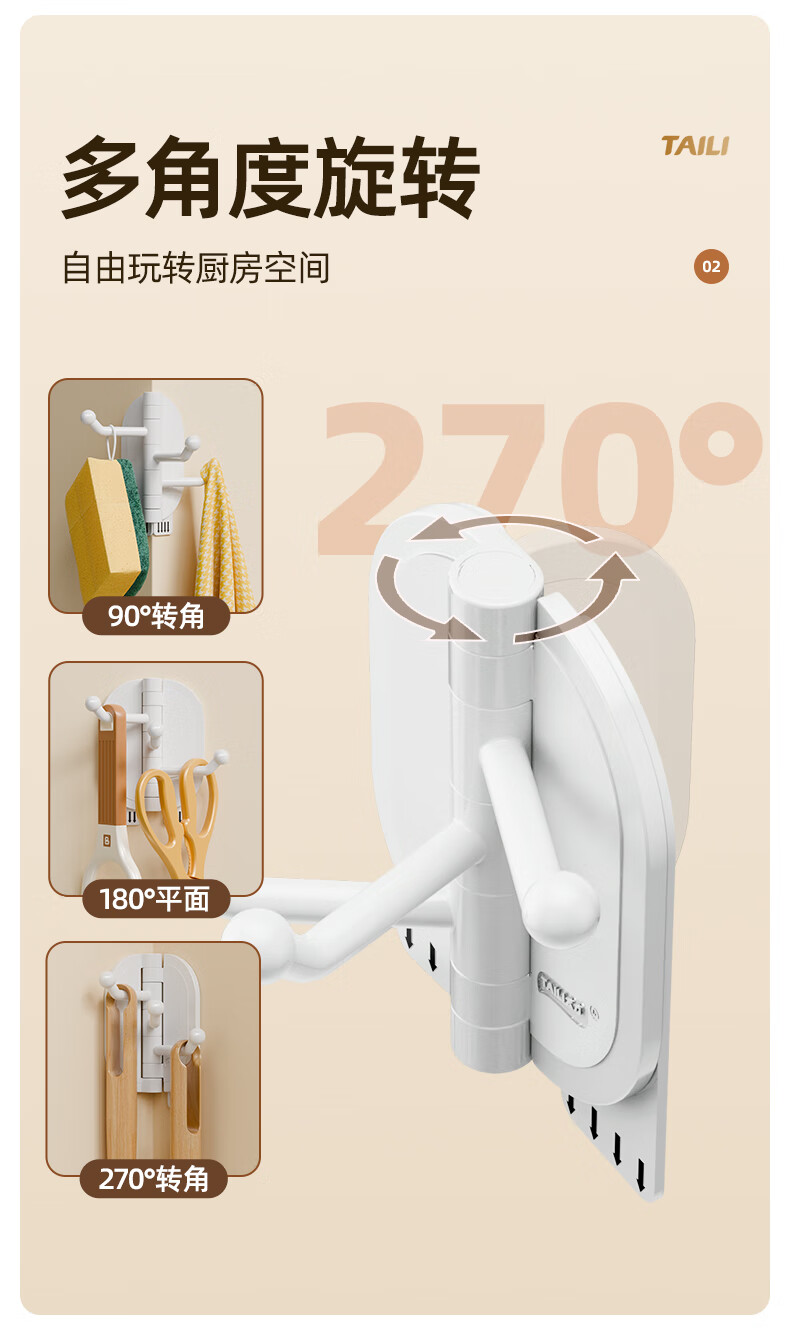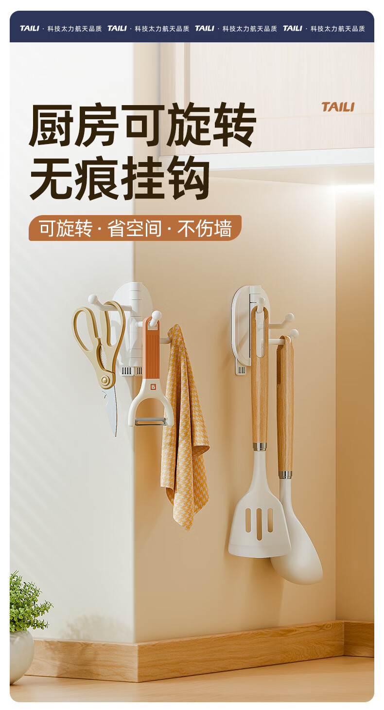 太力可旋转挂钩厨具厨房无痕粘钩免打孔免钉胶上墙角挂钩多功能置物架 【无痕收纳】可旋转挂钩2个