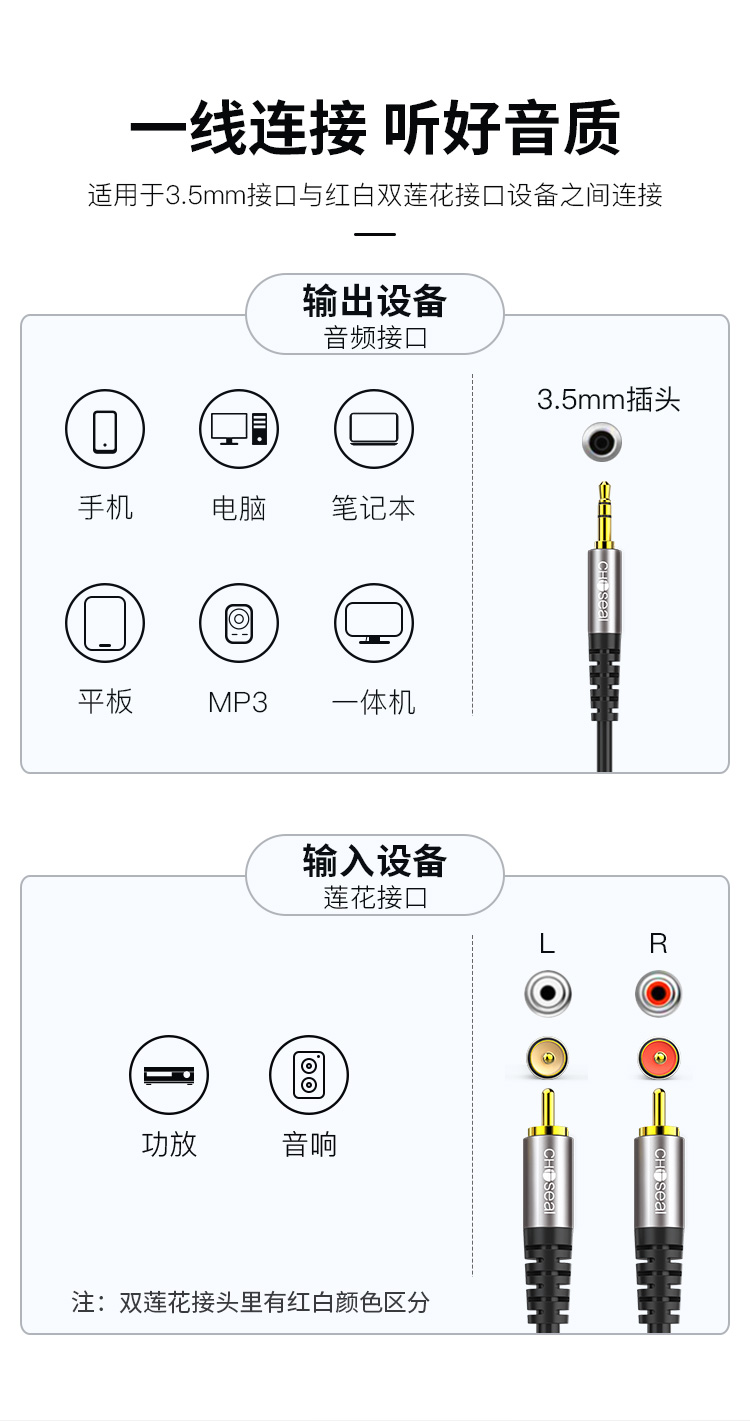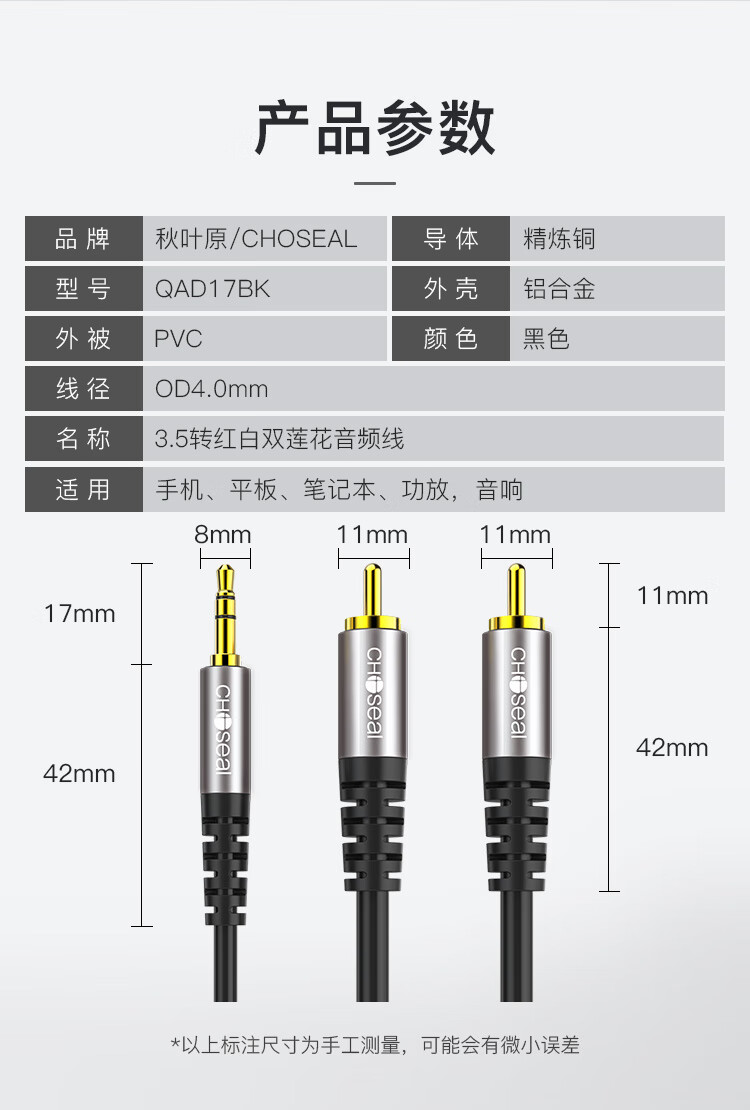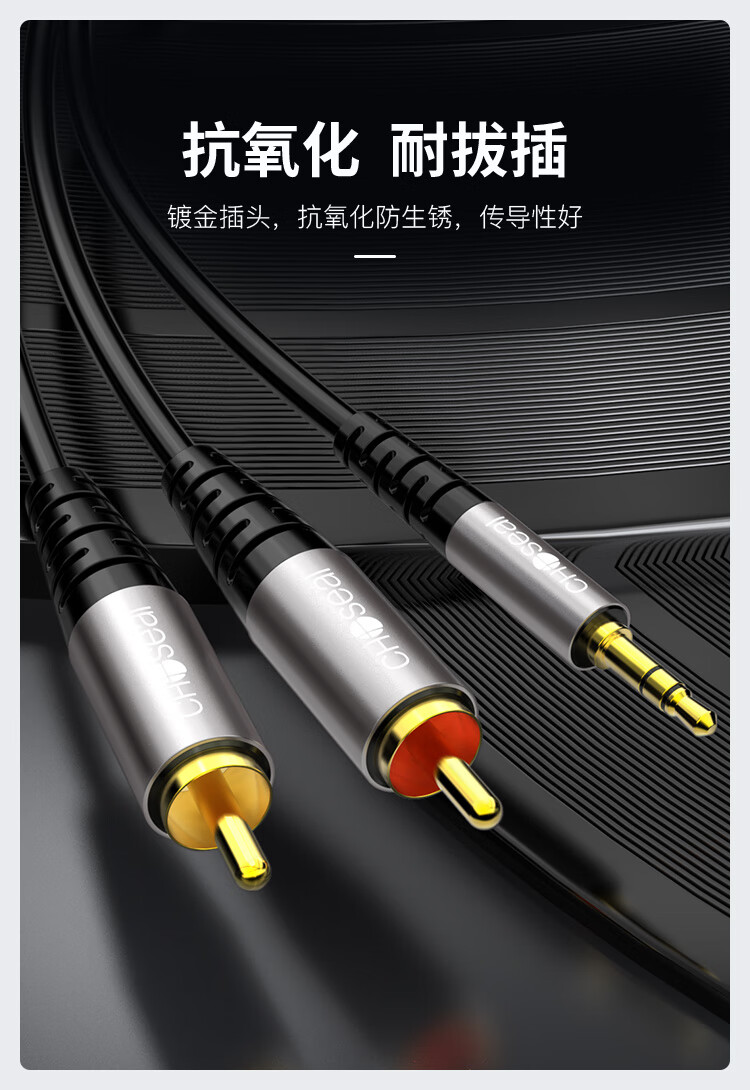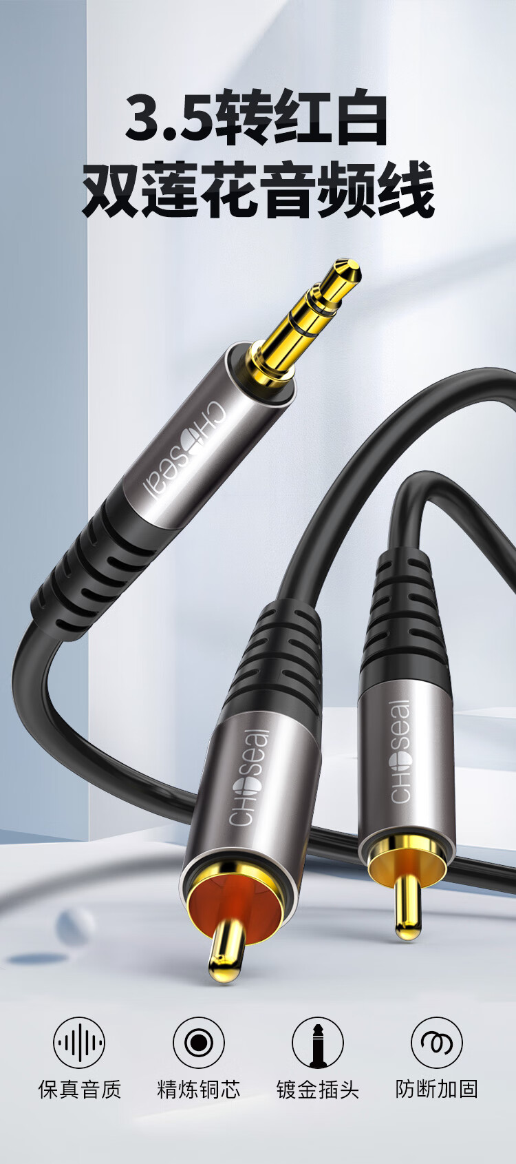 秋叶原(CHOSEAL)3.5mm转双莲花音频线 铝合金外壳 一分二红白2RCA公对公连接线 手机电脑音响转接线 5米 QAD17BKT5