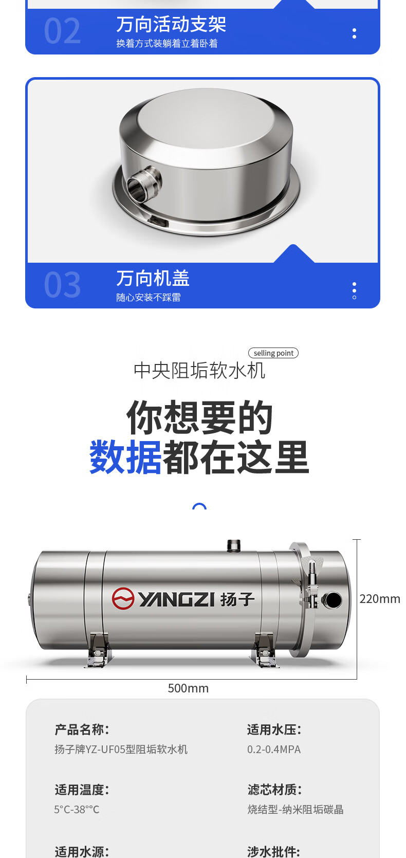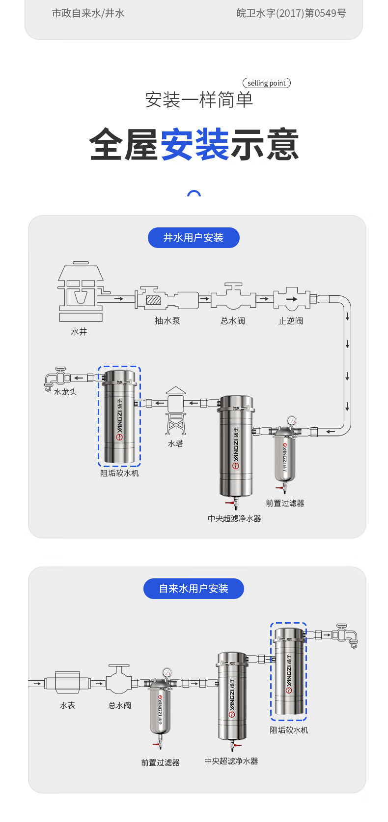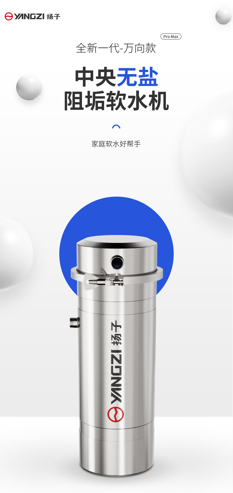 扬子大流量阻水垢水碱无盐软水机全屋中央净水器家用不锈钢直饮超滤净水机厨下式自来水前置过滤器 5吨/1寸万向【顶配特厚阻垢软水款】 304不锈钢 接口PPR版