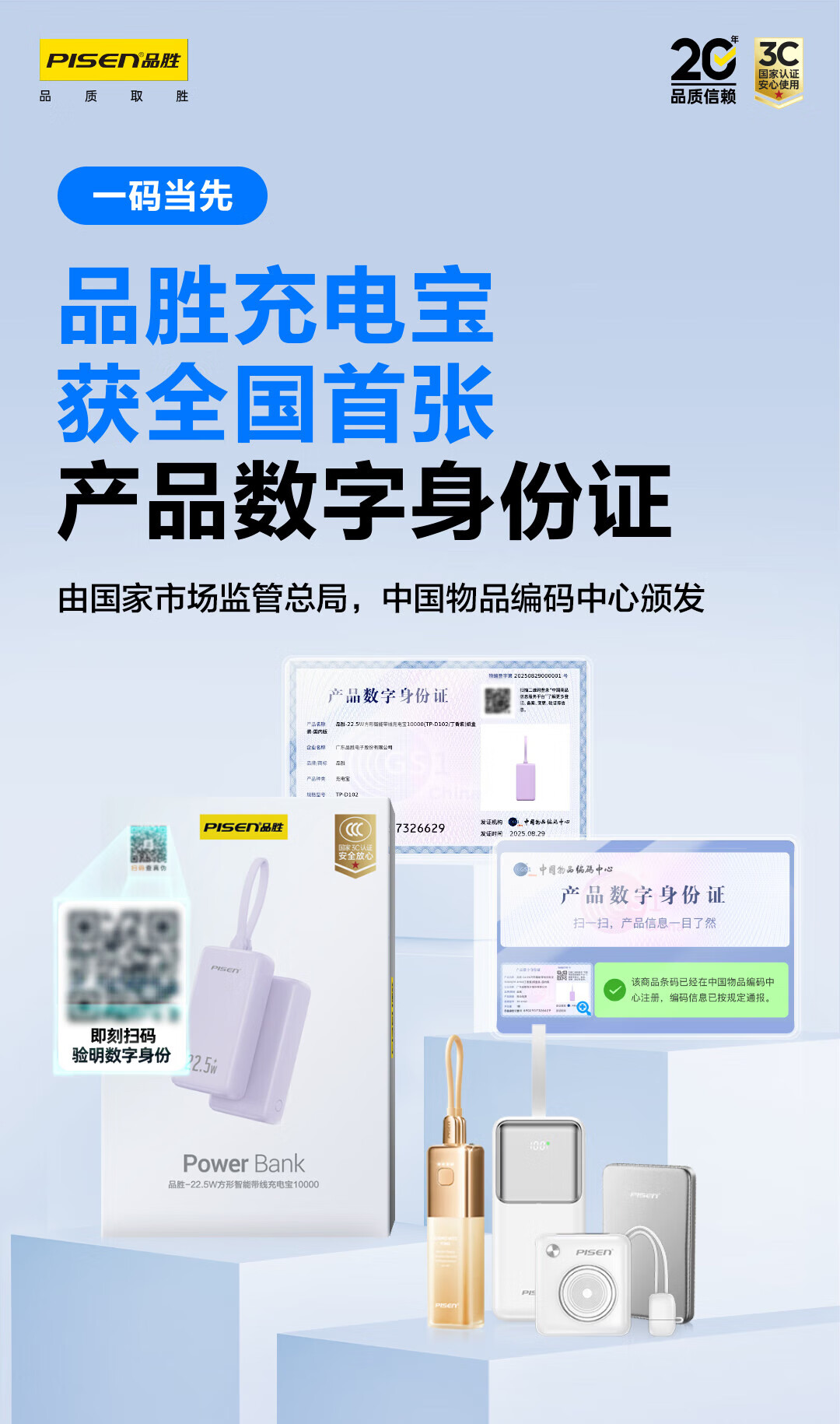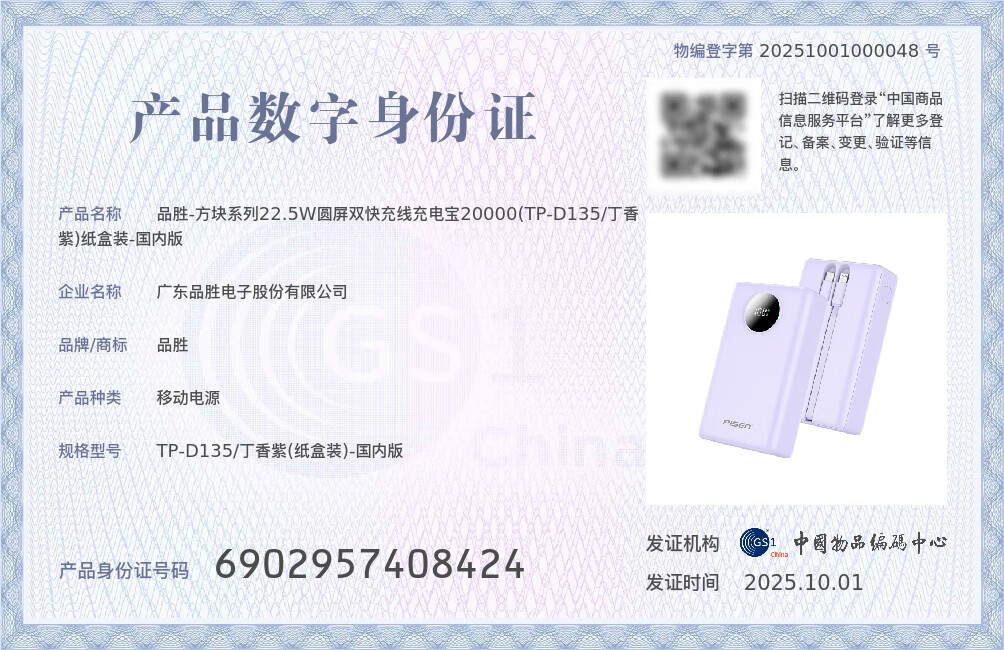 品胜【3C认证】充电宝自带双线20000毫安大容量可上飞机22.5W快充移动电源适用苹果17promax小米华为紫