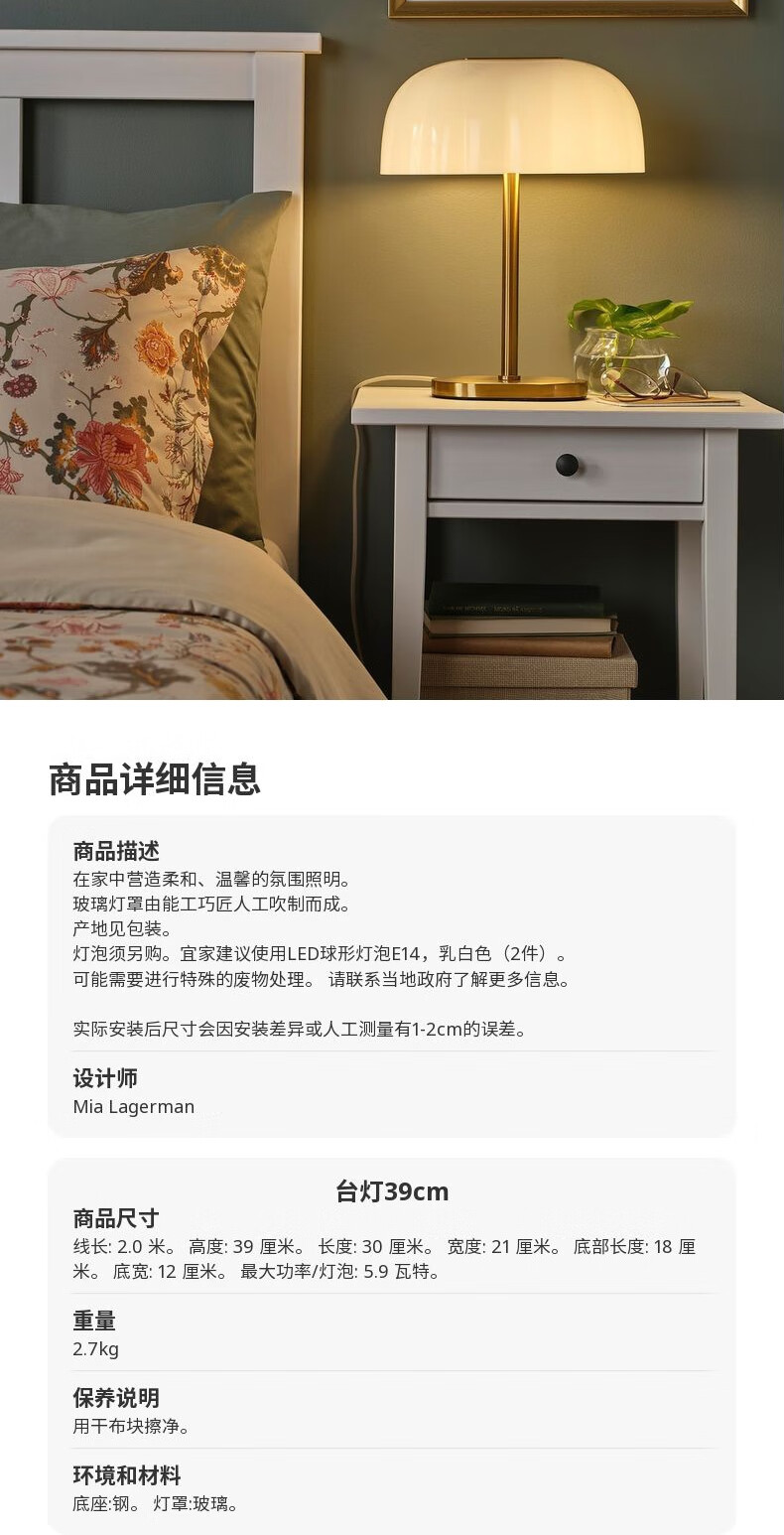 宜家(IKEA)【新品】AKTERSPRING阿特斯普林台灯照明灯小夜灯床头灯 【新品】台灯39cm