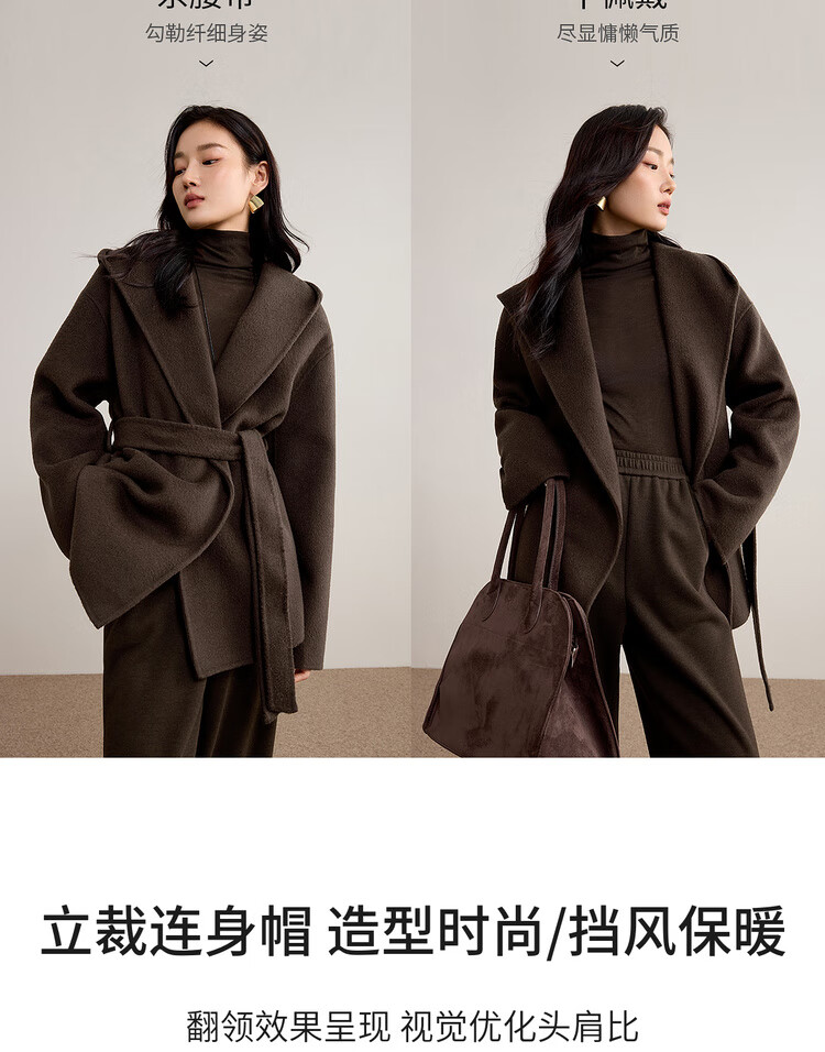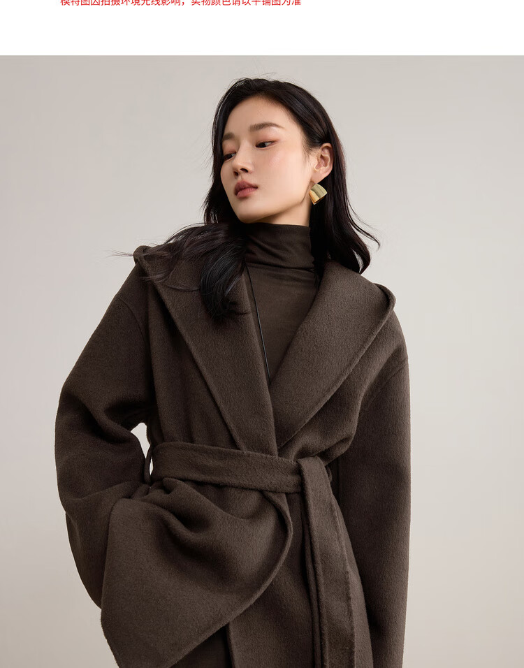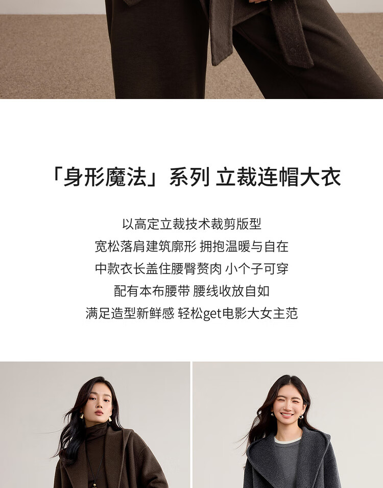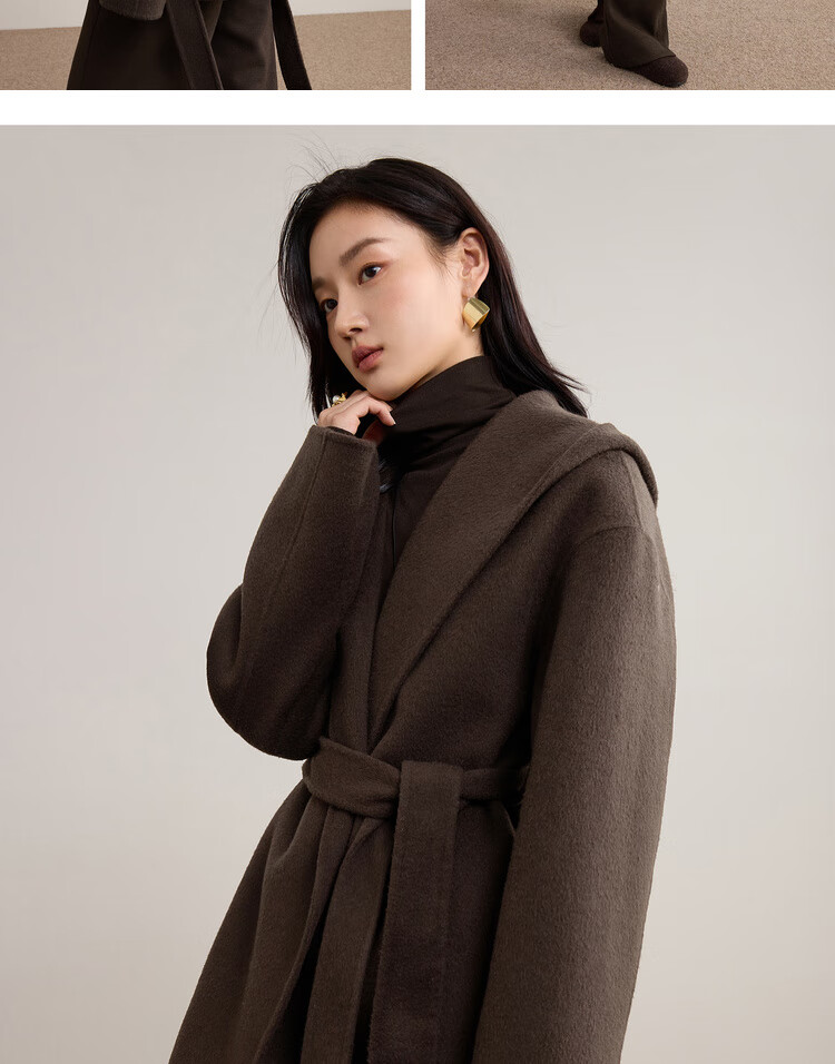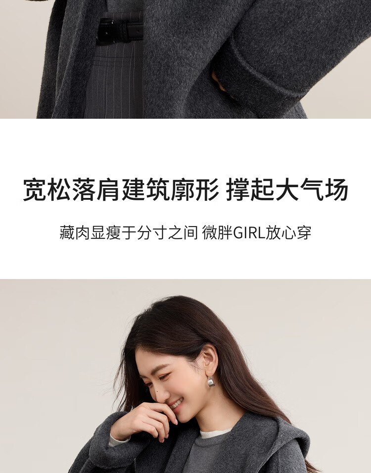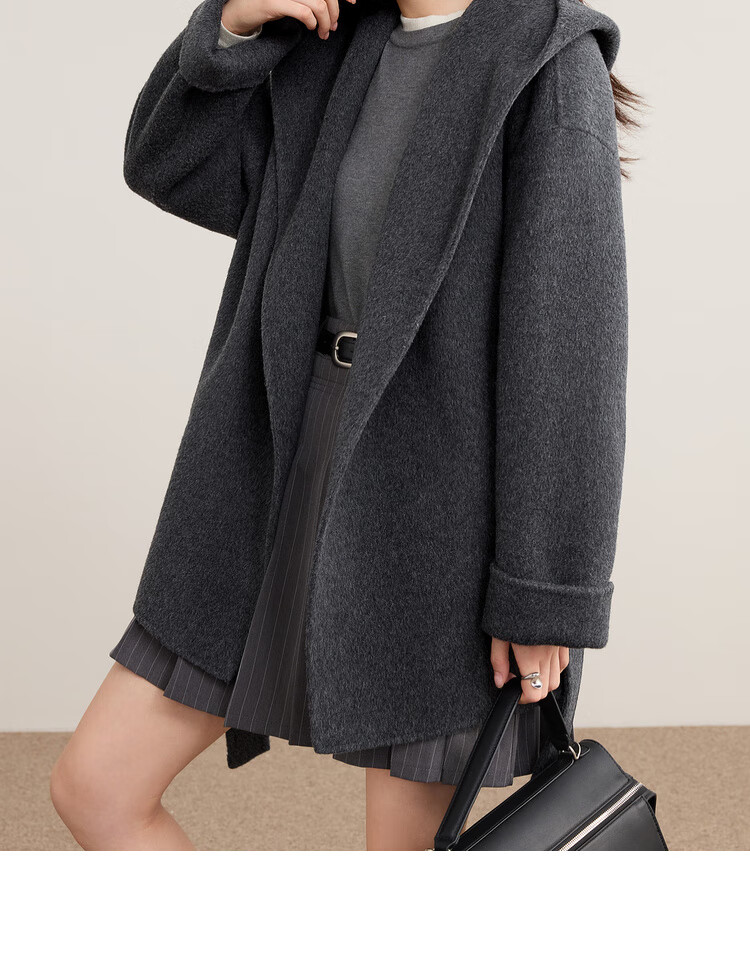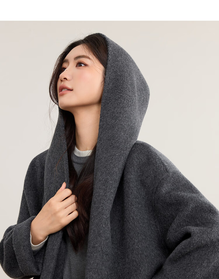 尚都比拉英伦风纯羊毛毛呢大衣女冬季保暖厚款双面呢外套连帽宽松中款大衣
