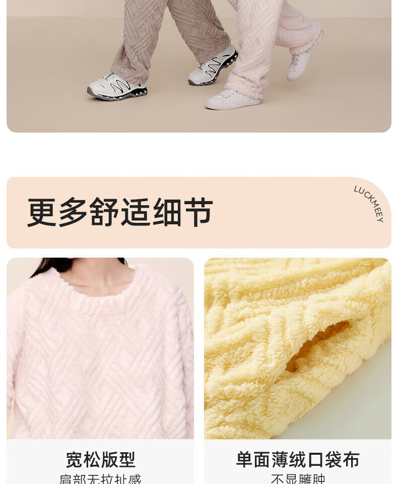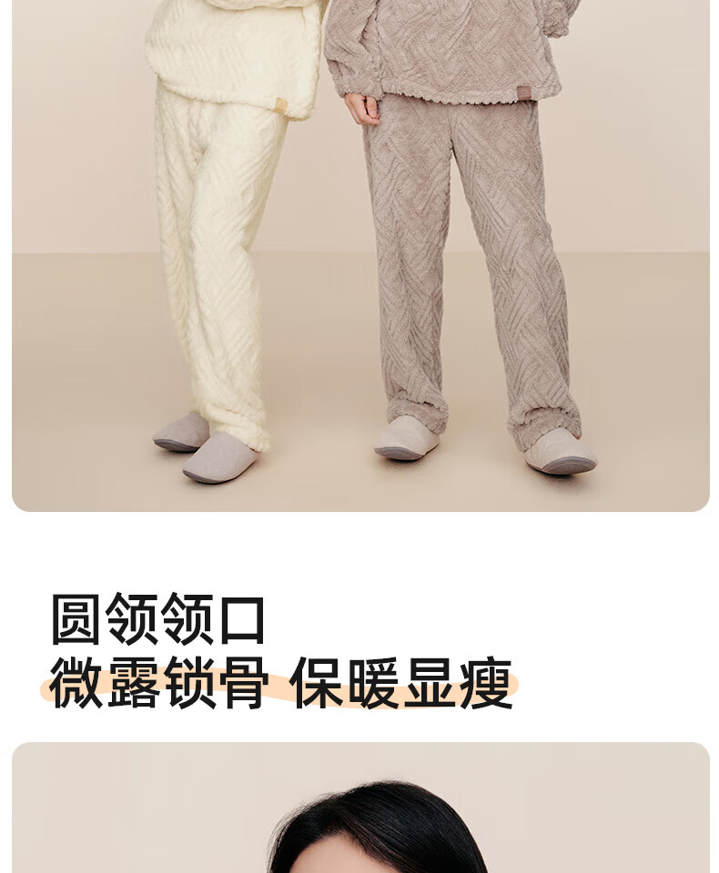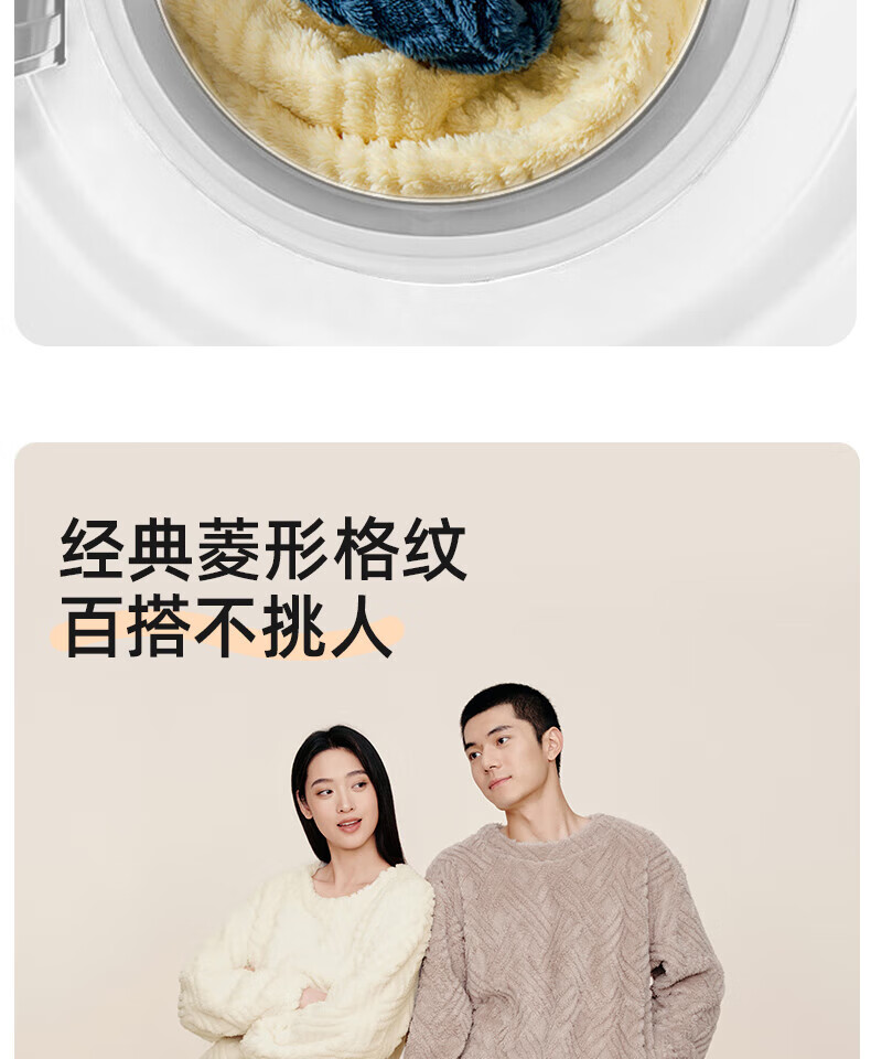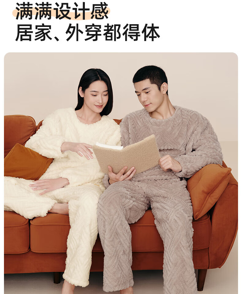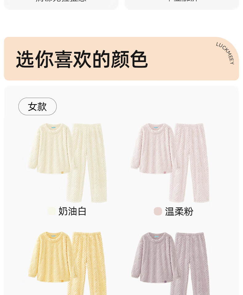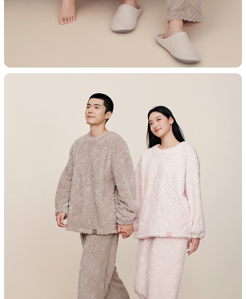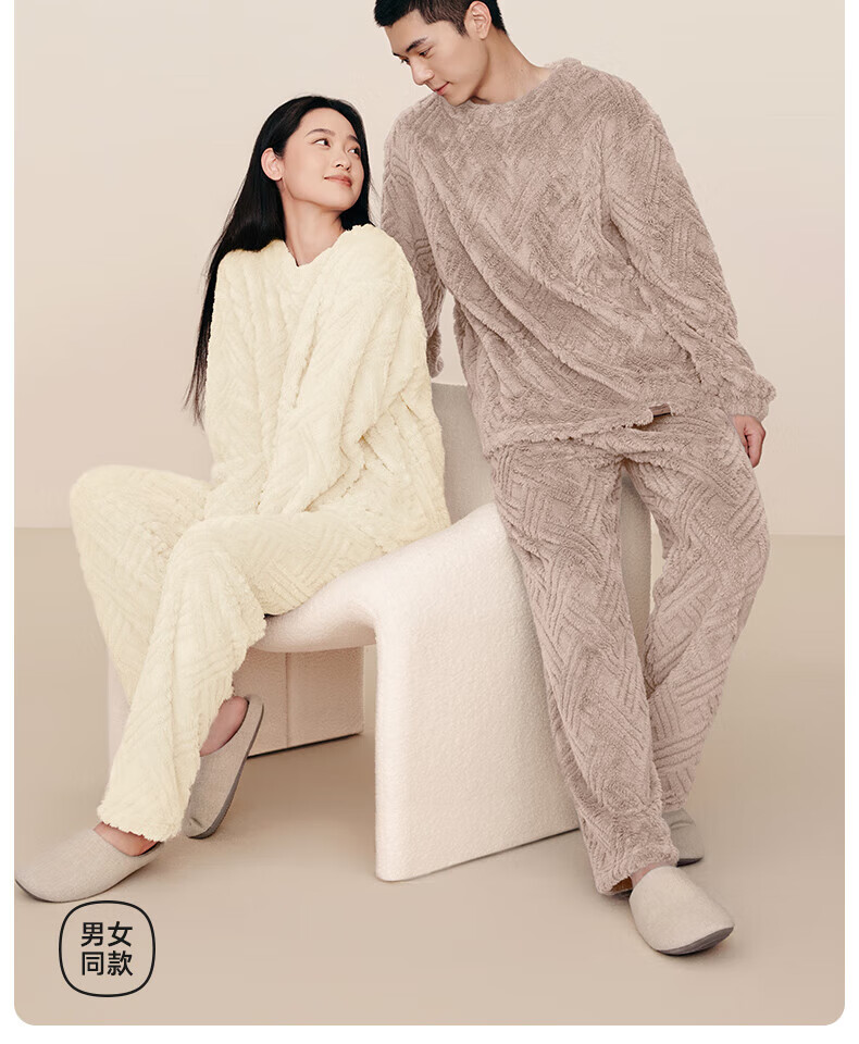 幸棉(LUCKMEEY)女秋冬家居服菱格麻花长毛绒情侣套装可外穿保暖柔软长袖圆领睡衣 奶油白(女款) L (女100-130斤/男100-130斤)