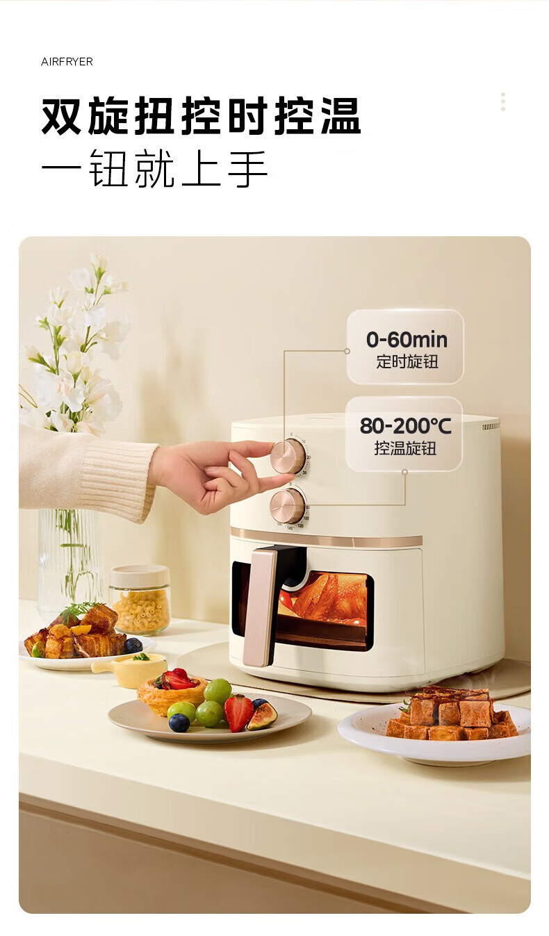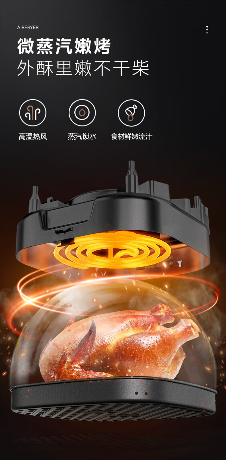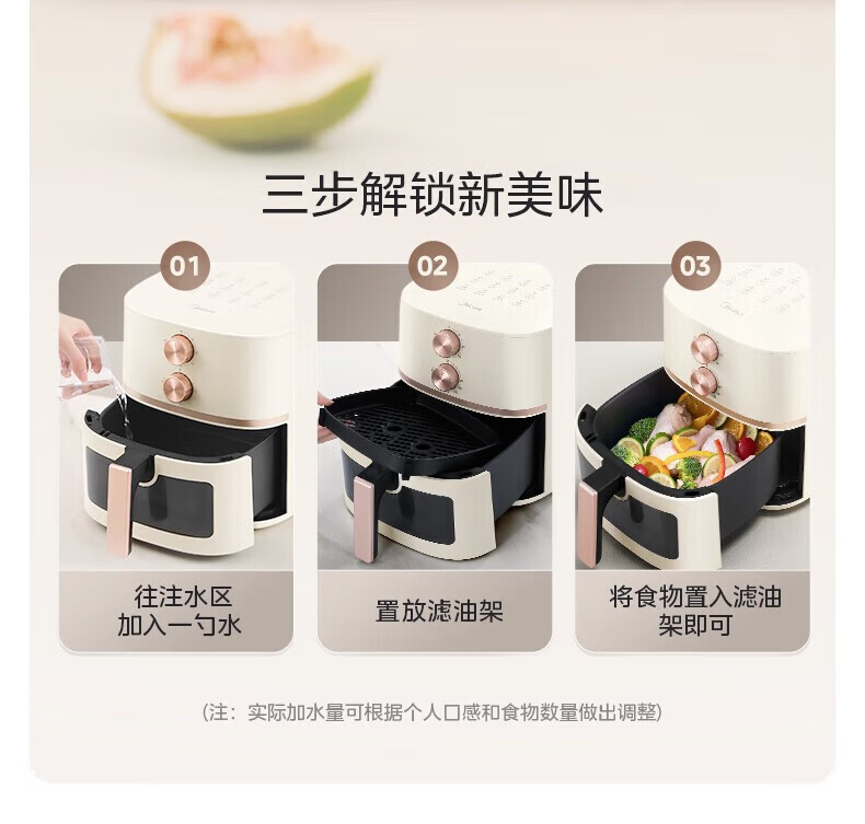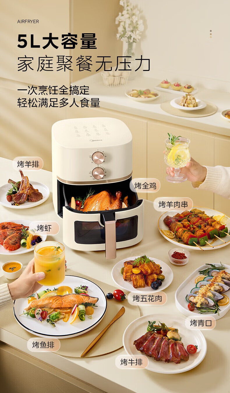 美的(Midea)空气炸锅家用 5升可视不用翻面 微蒸汽多功能智能双旋控温电炸锅 可视窗口 电炸锅 5L 【不用翻面 蒸汽嫩炸】