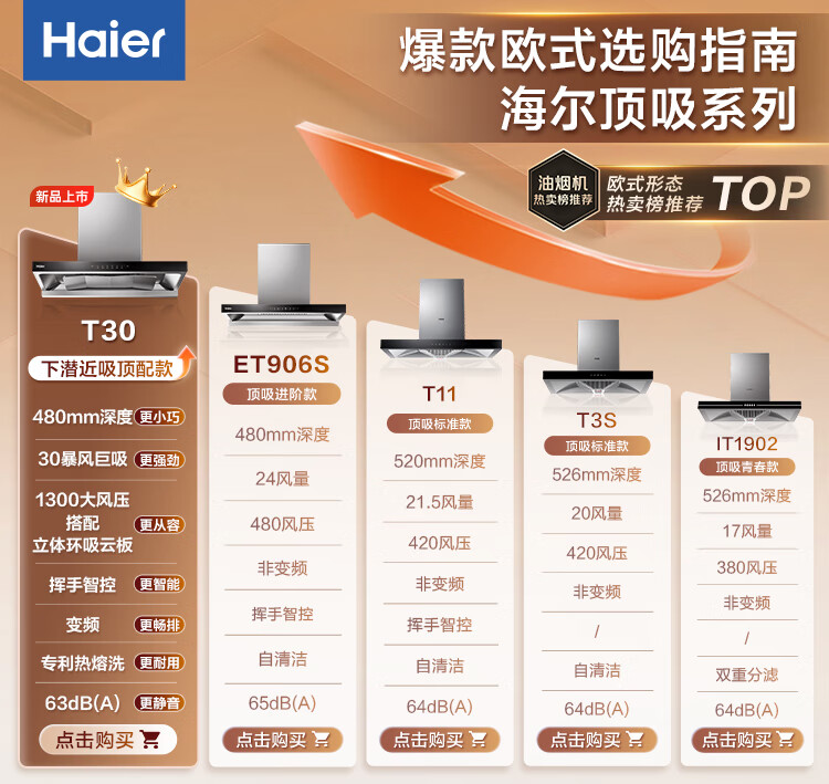 海尔(Haier)抽吸排油烟机顶吸欧式家用吸油烟机 20风量大吸力自清洁触屏智控以旧换新国家补贴20%可配燃气灶