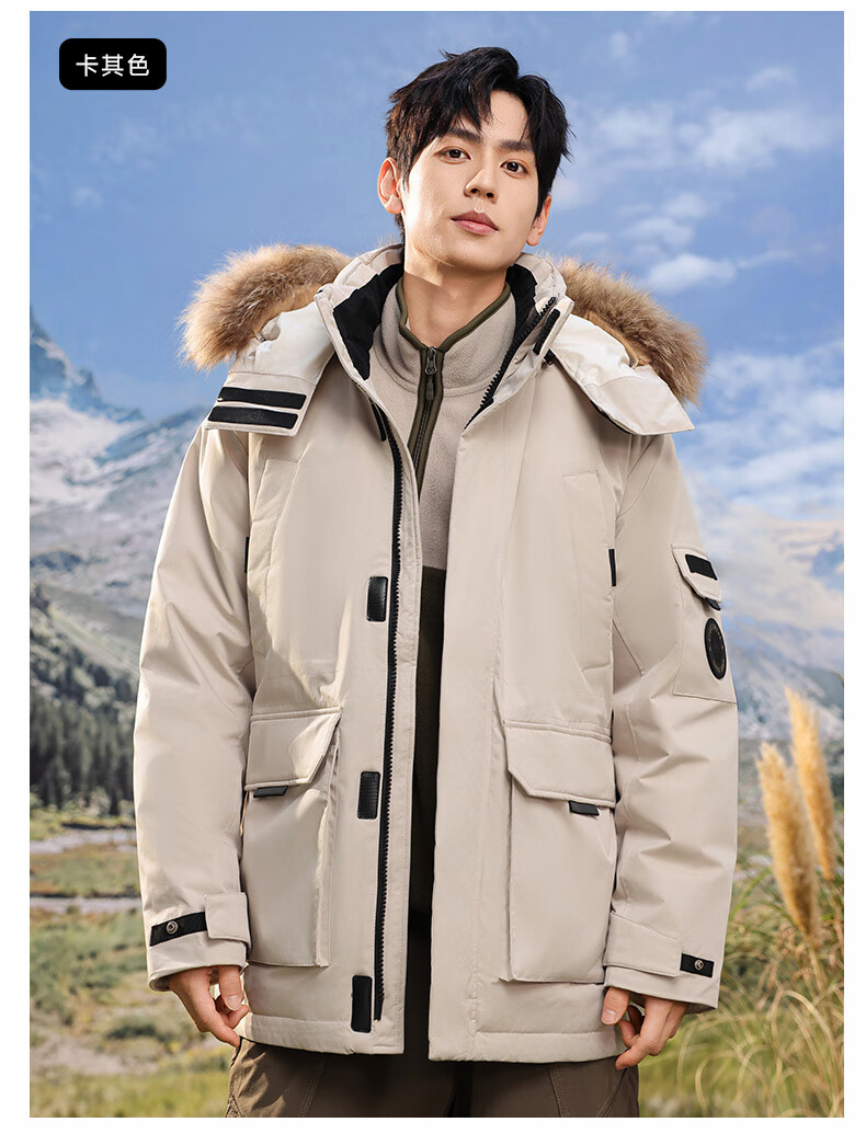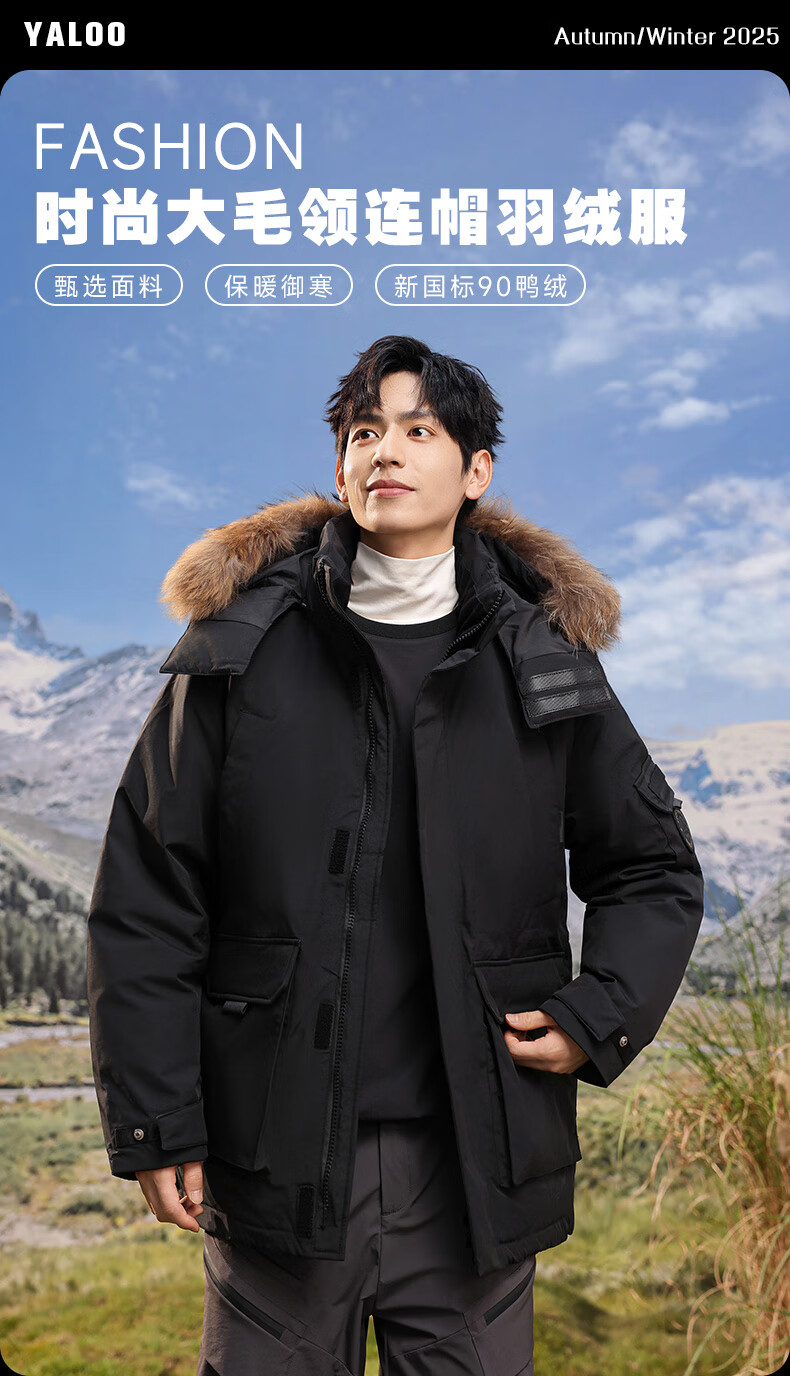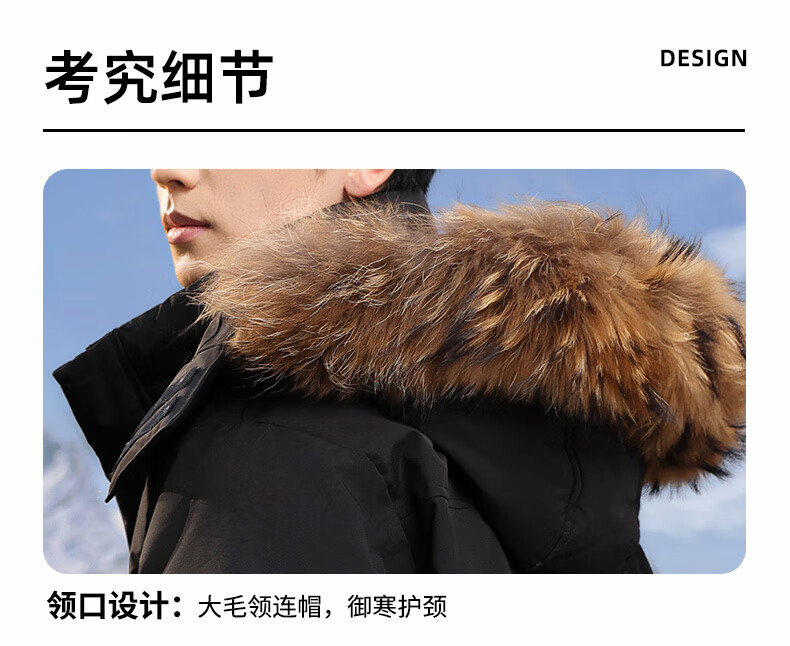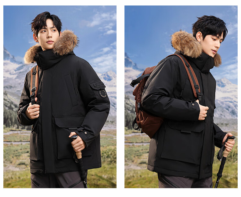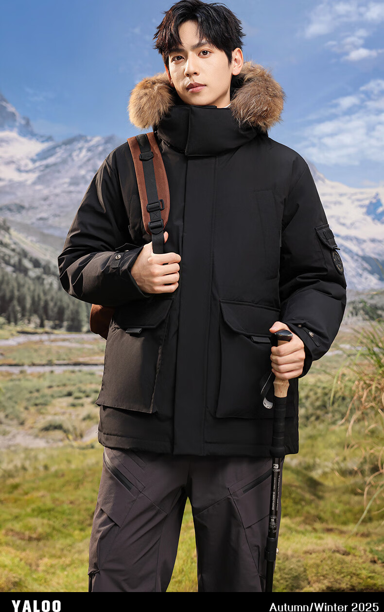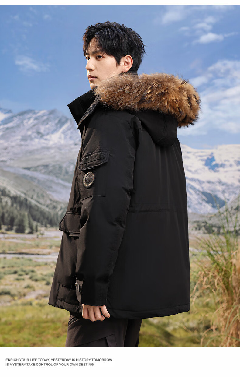 雅鹿羽绒服男士中长款冬季新款可拆卸帽加厚貂子毛领户外工装保暖外套 黑色 L /175