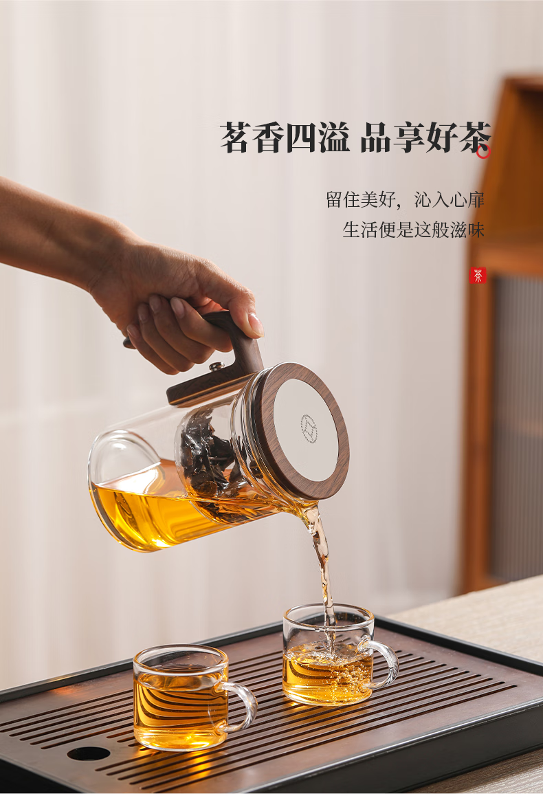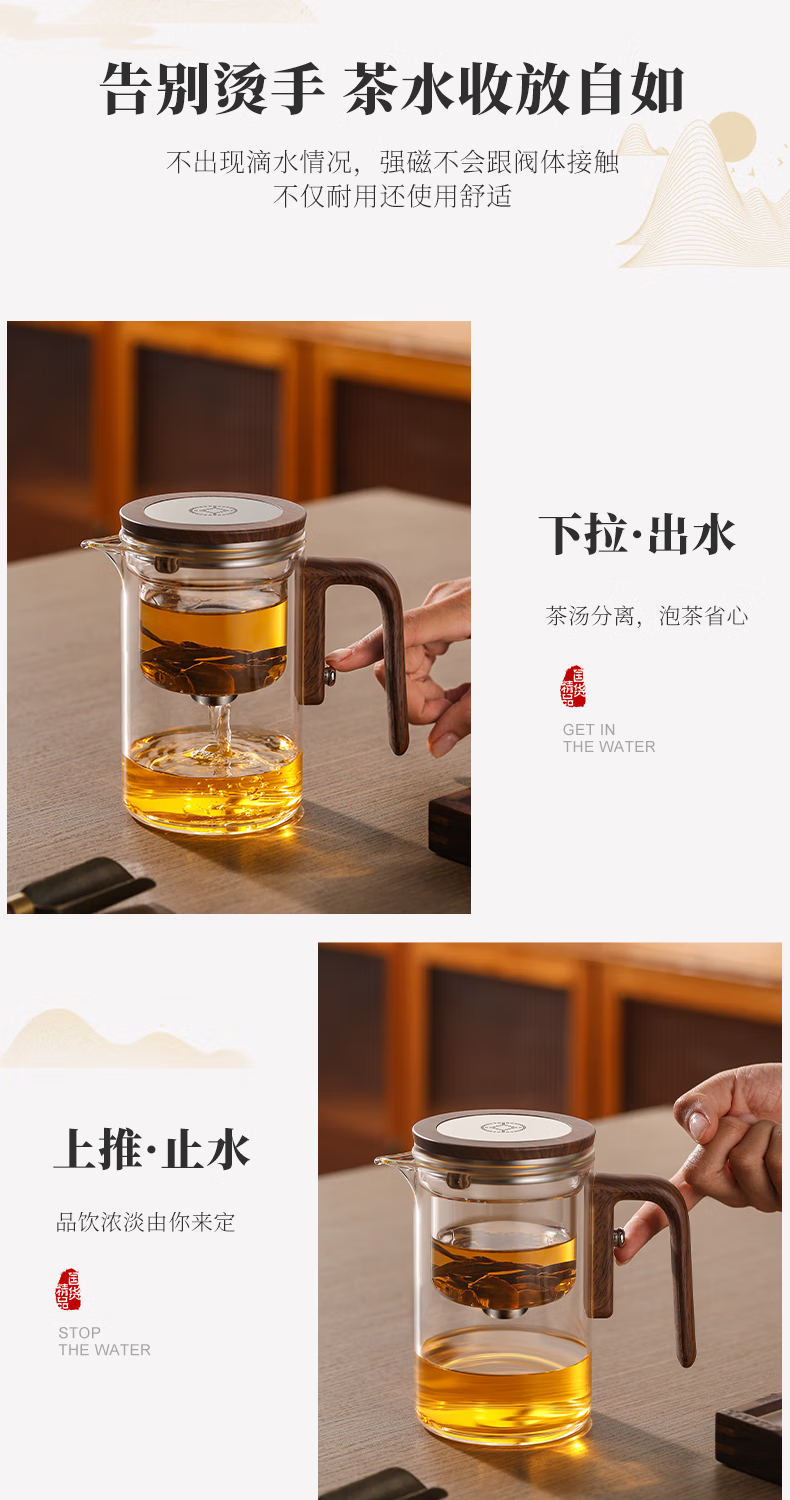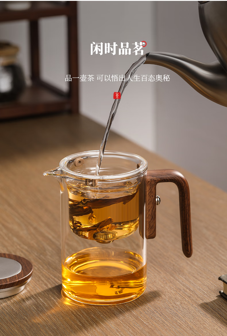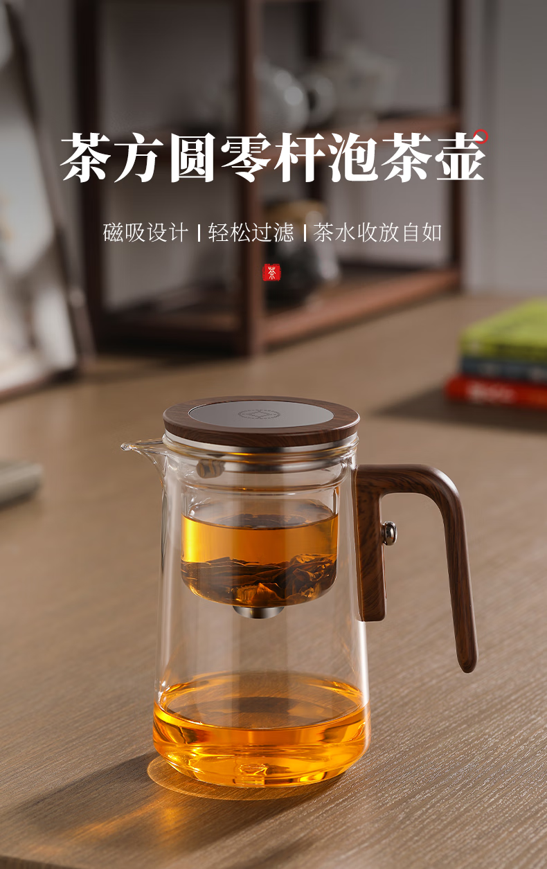 茶方圆零杆泡茶壶磁吸飘逸杯全玻璃内胆一键茶水分离办公家用懒人泡茶具 【第4代透明款】木色(单壶) 600ml