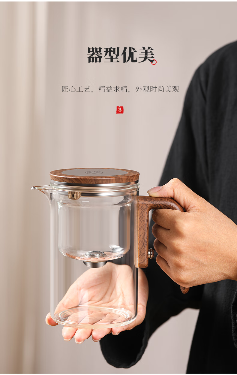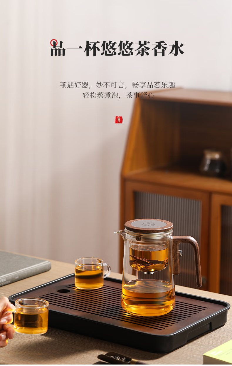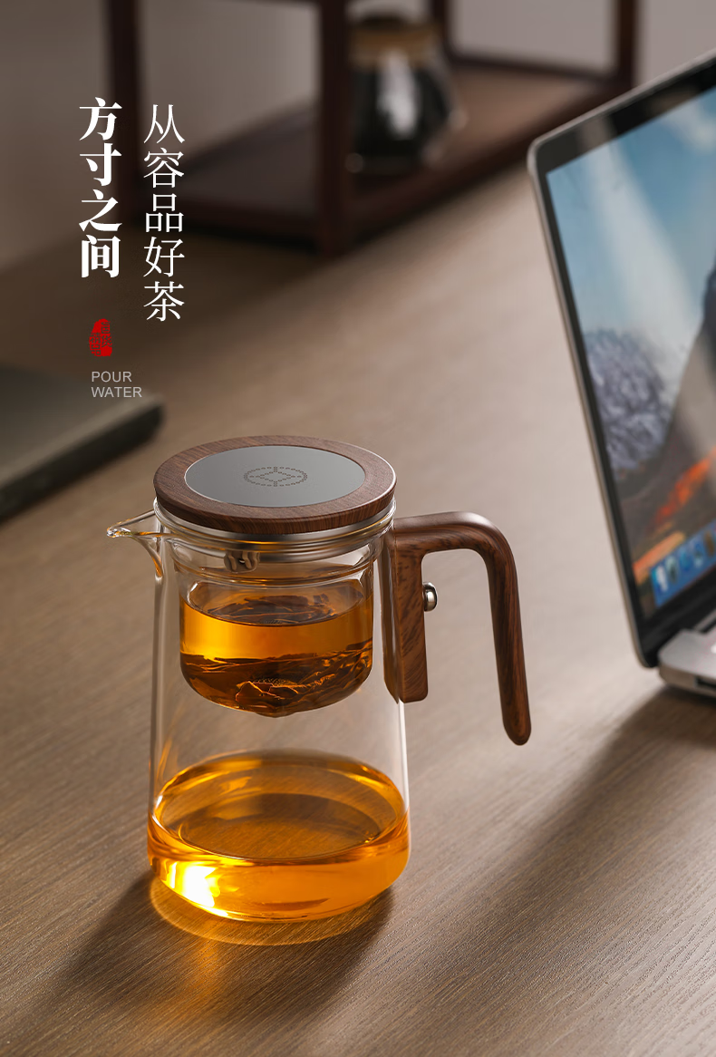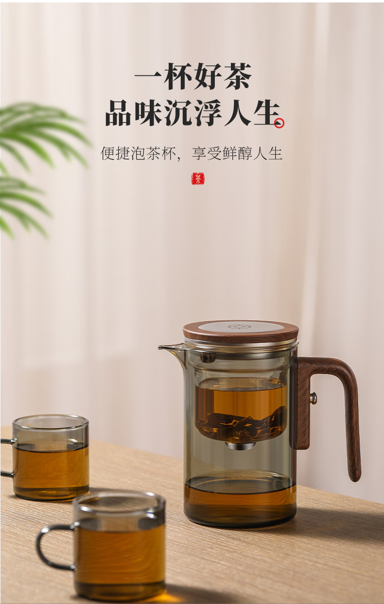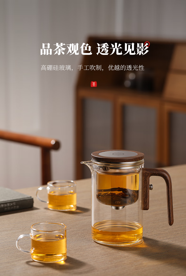 茶方圆零杆泡茶壶磁吸飘逸杯全玻璃内胆一键茶水分离办公家用懒人泡茶具 【第4代透明款】木色(单壶) 600ml