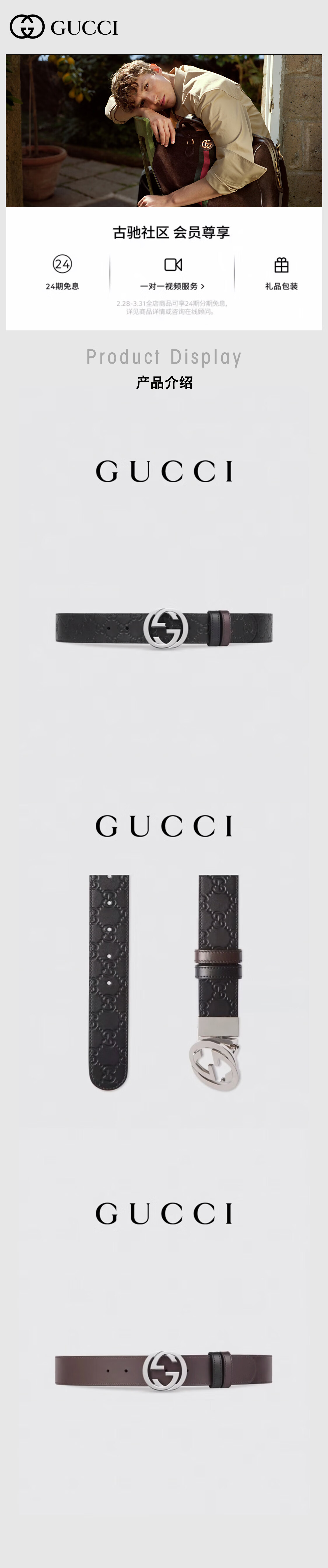 GUCCI 新款 古驰男皮带奢侈品 腰带 3.7厘米 G搭扣 双面 礼物礼盒 黑色 100