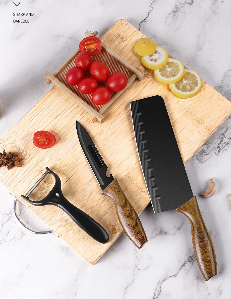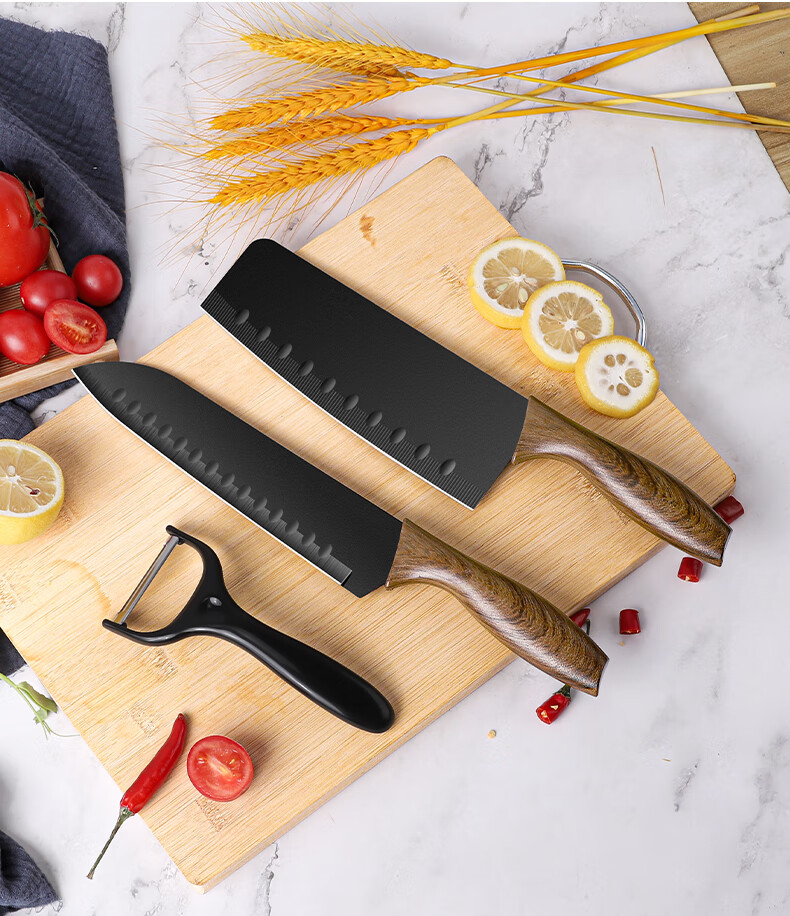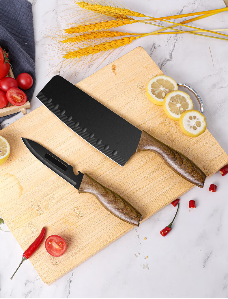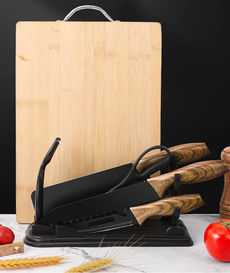 切菜刀菜板二合一家用厨房刀具案砧板套装全套厨具辅食工具水果刀 斜尾木纹三套装