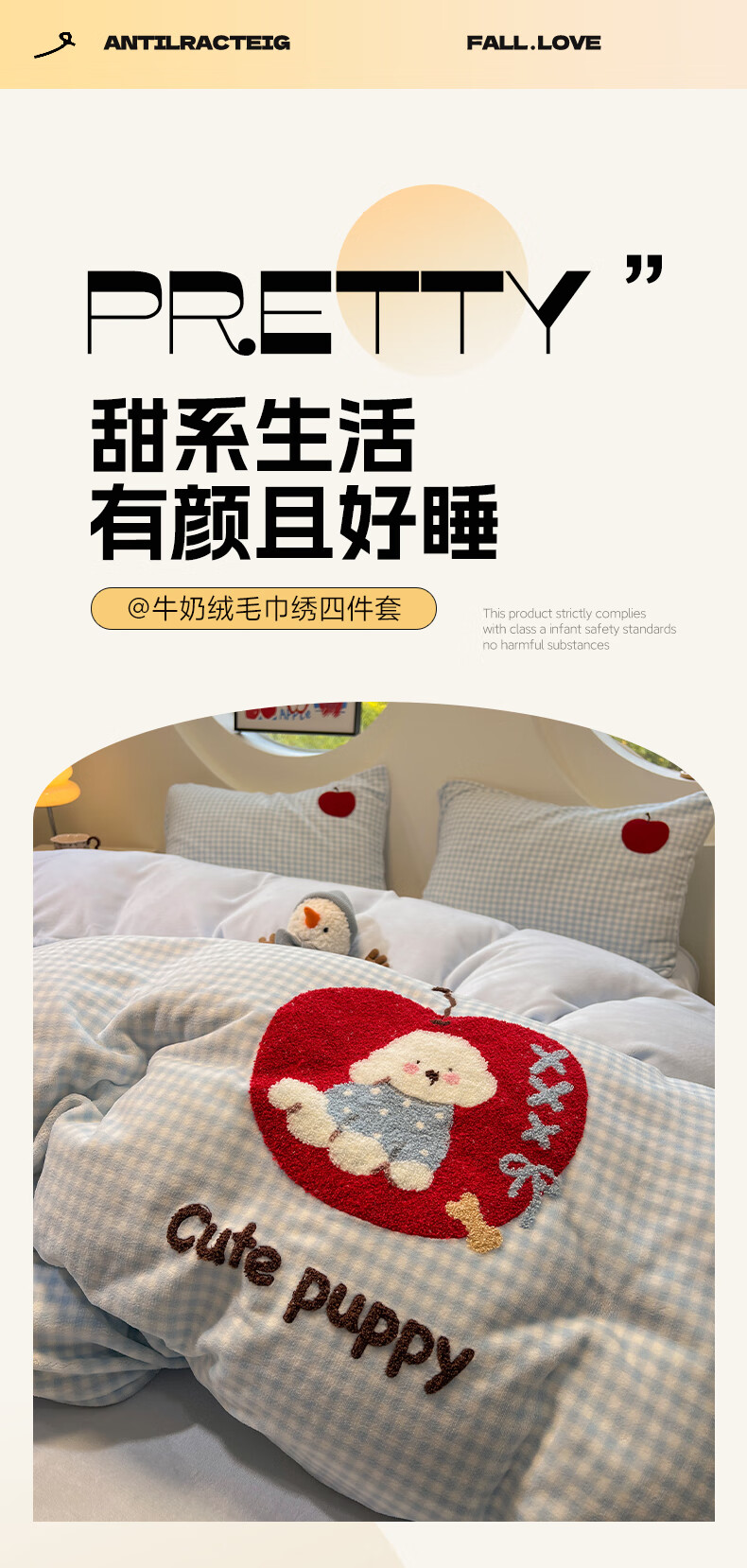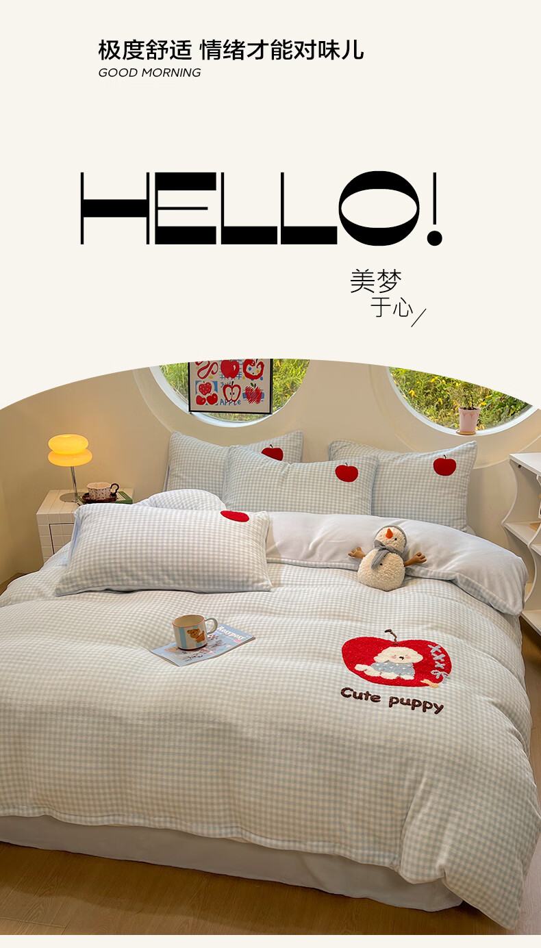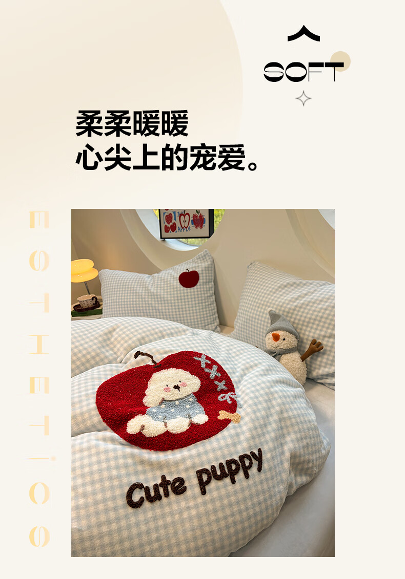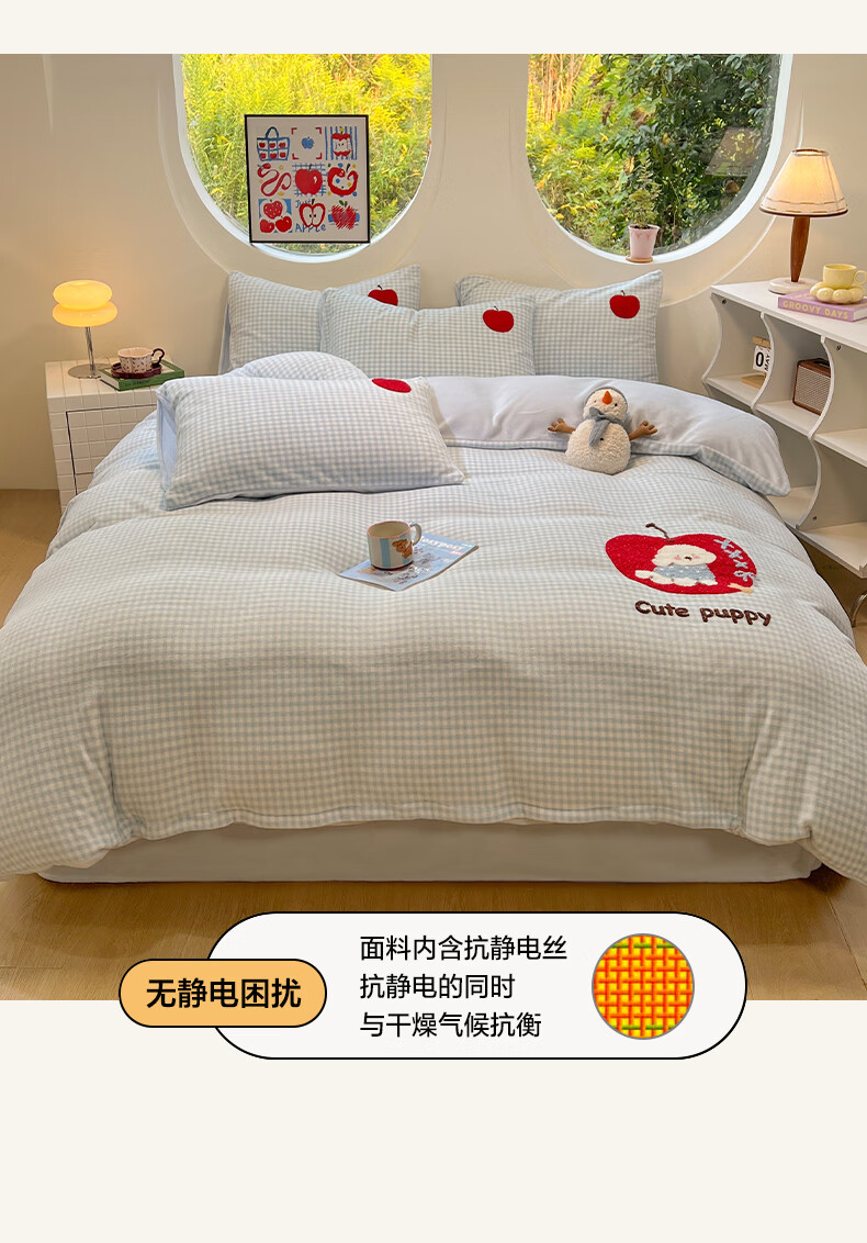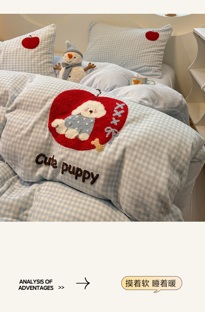 苏萱秋冬季苹果狗毛巾绣牛奶绒四件套加厚珊瑚绒面被套三件套床上床品 蓝格苹果狗 1.8m 床单款 四件套-被套200x230cm
