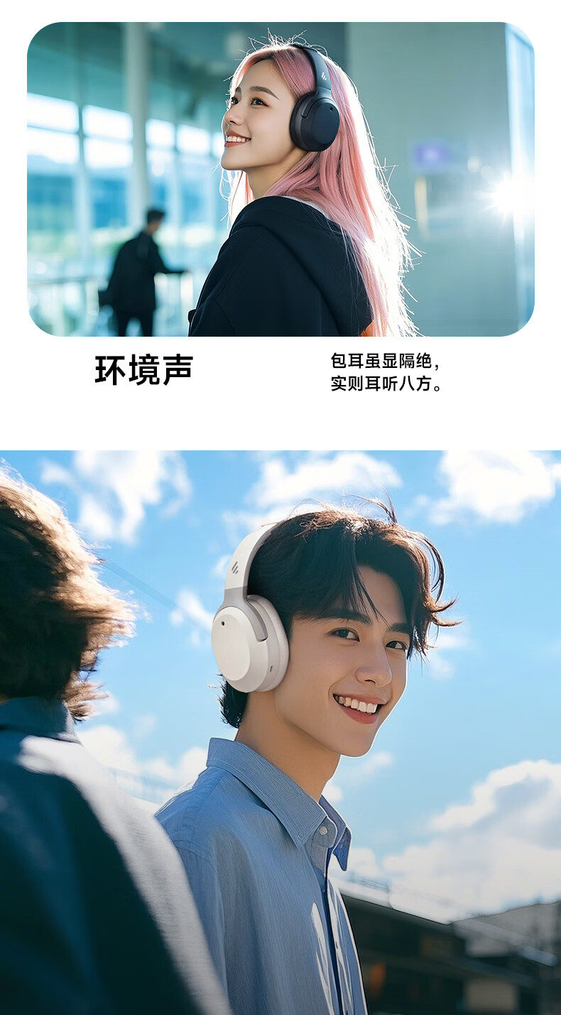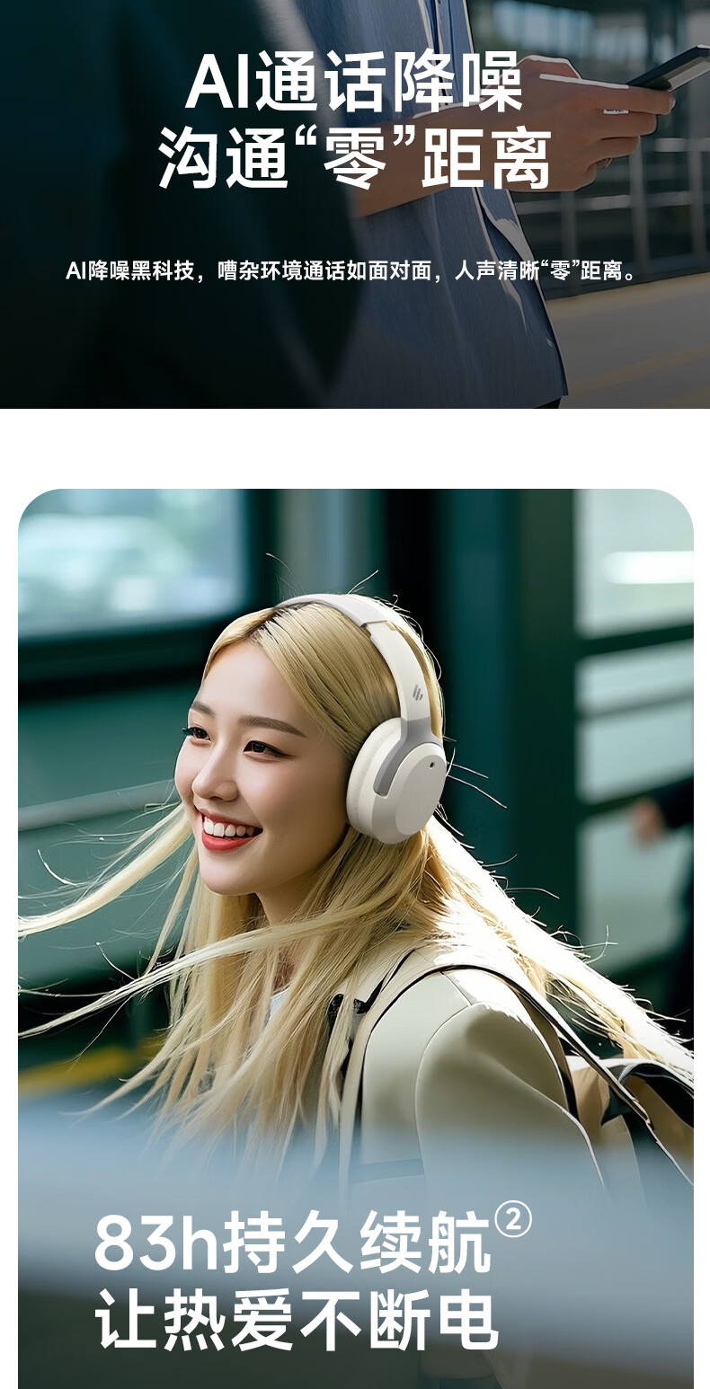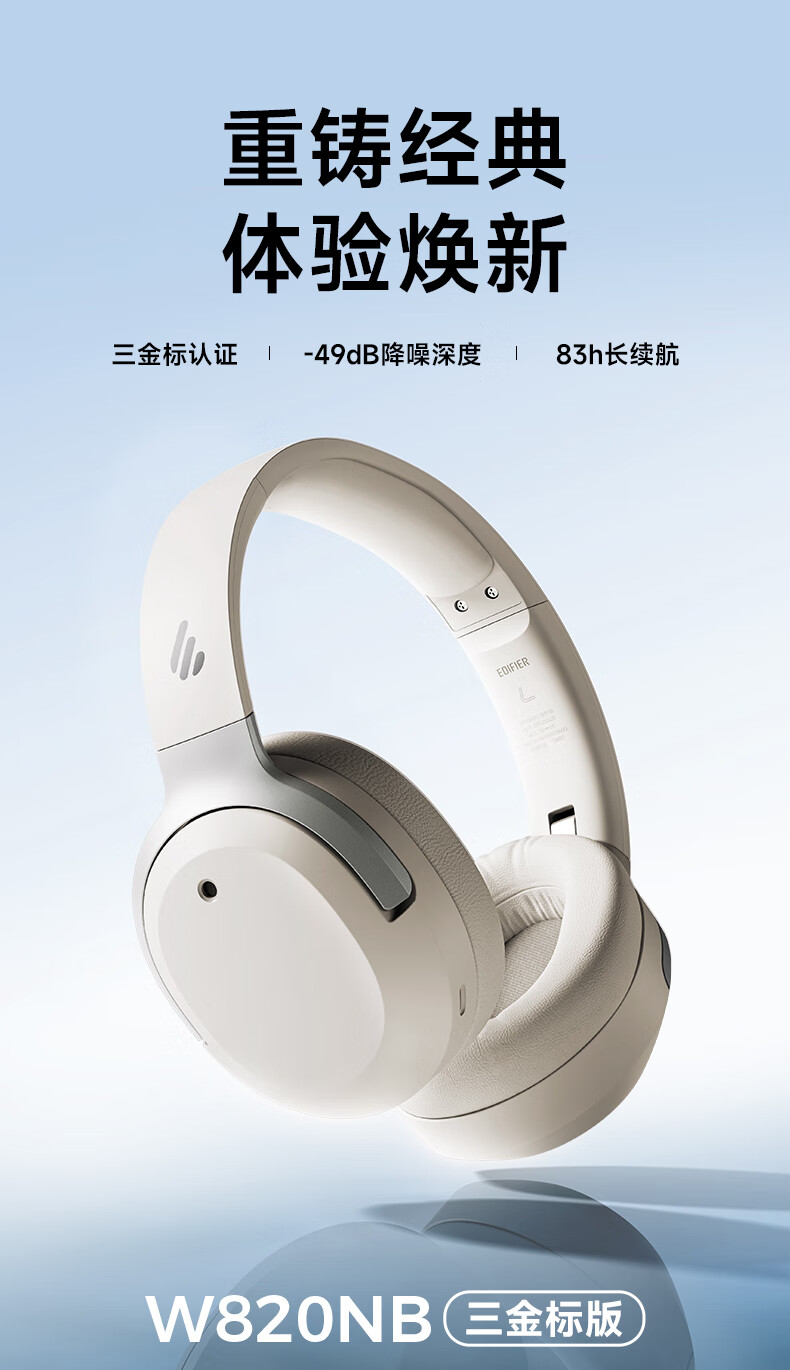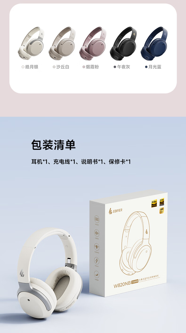 漫步者(EDIFIER)W820NB三金标版 头戴式主动降噪蓝牙耳机 手机电脑笔记本耳机 83小时续航 皓月银