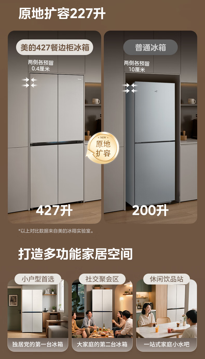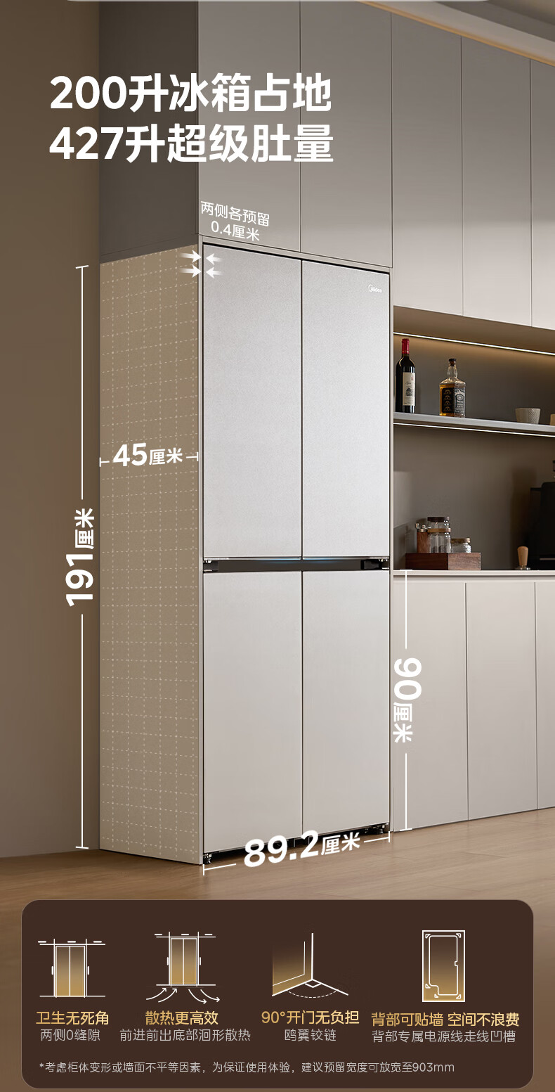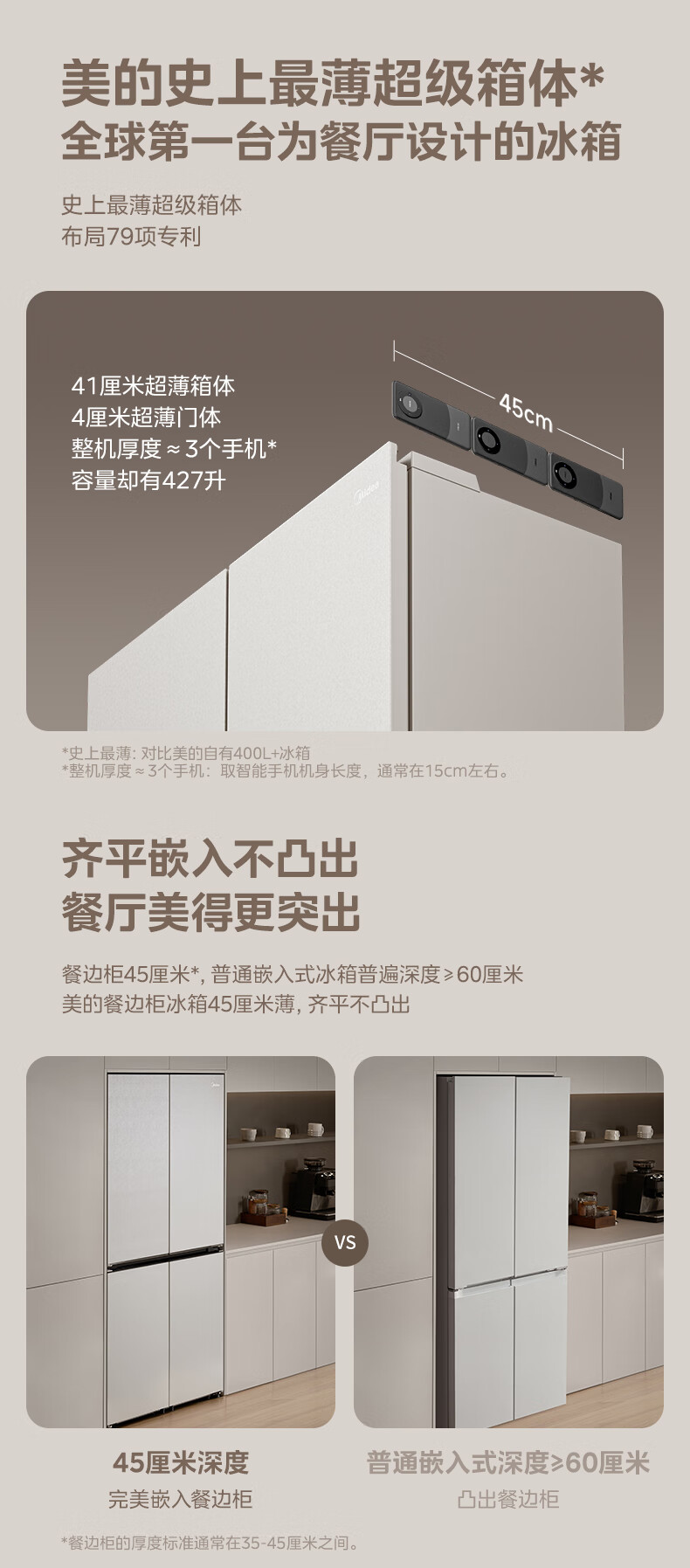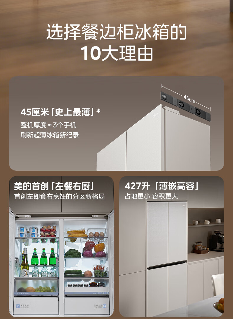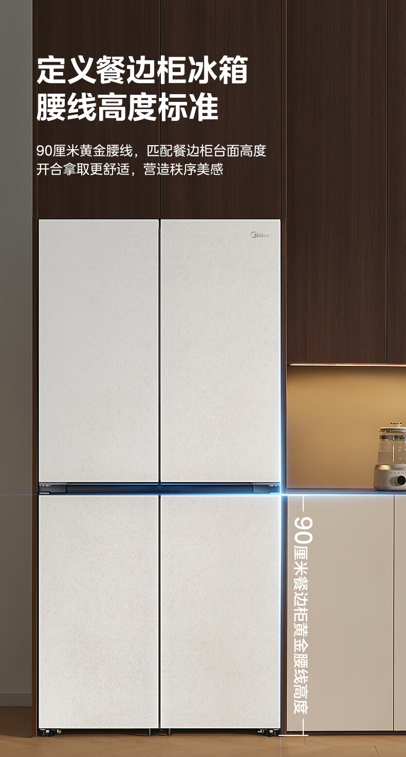 美的(Midea)首创45cm超薄嵌入餐边柜家用客厅冰箱左餐右厨大容量底部散热十字四开门国家补贴BCD-427WUSGPZM