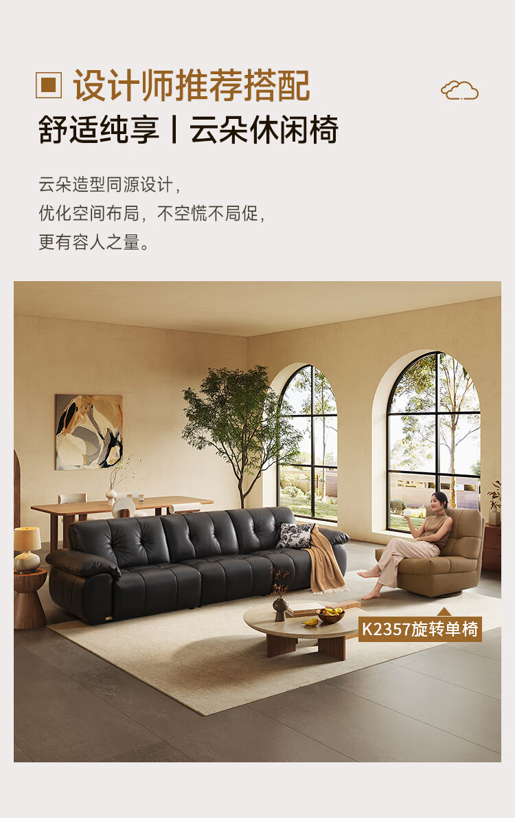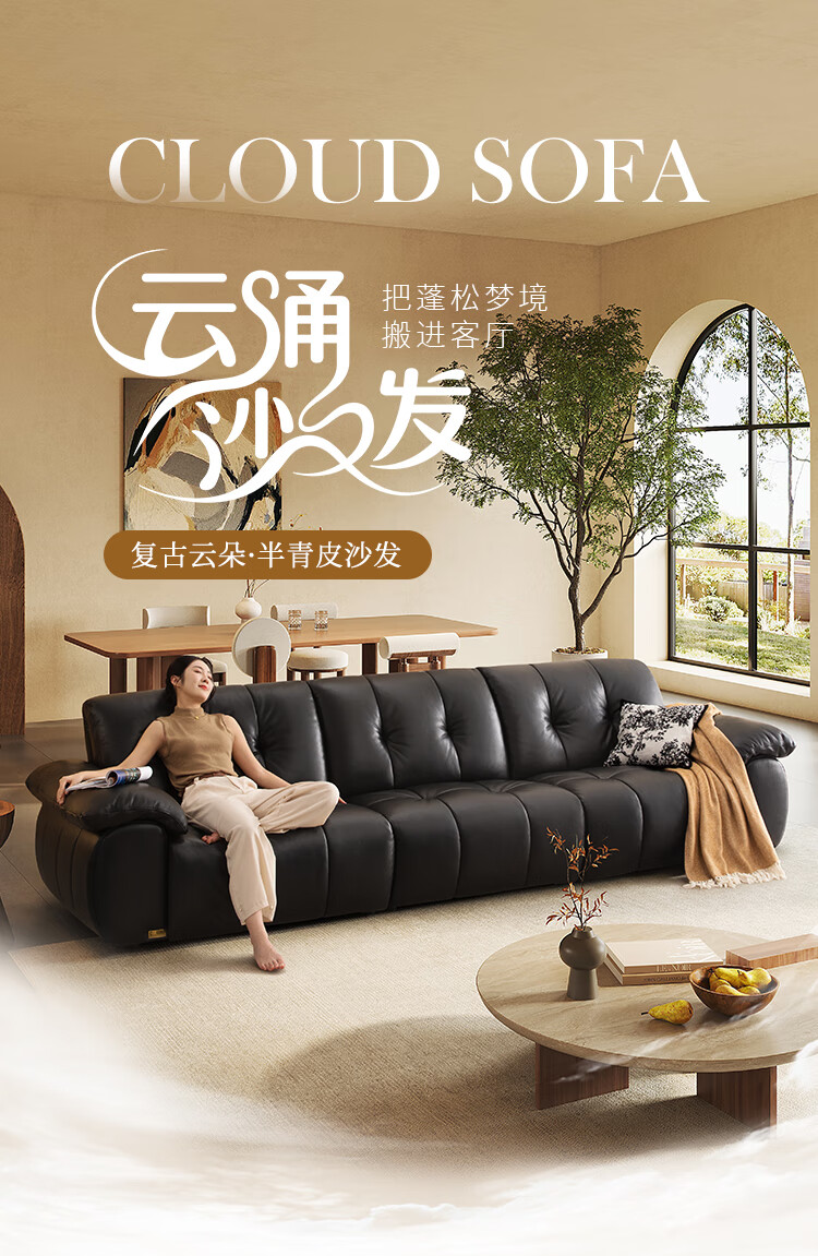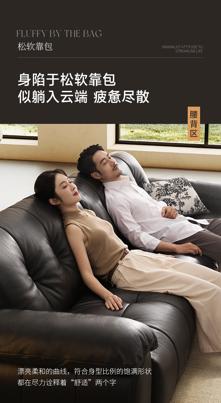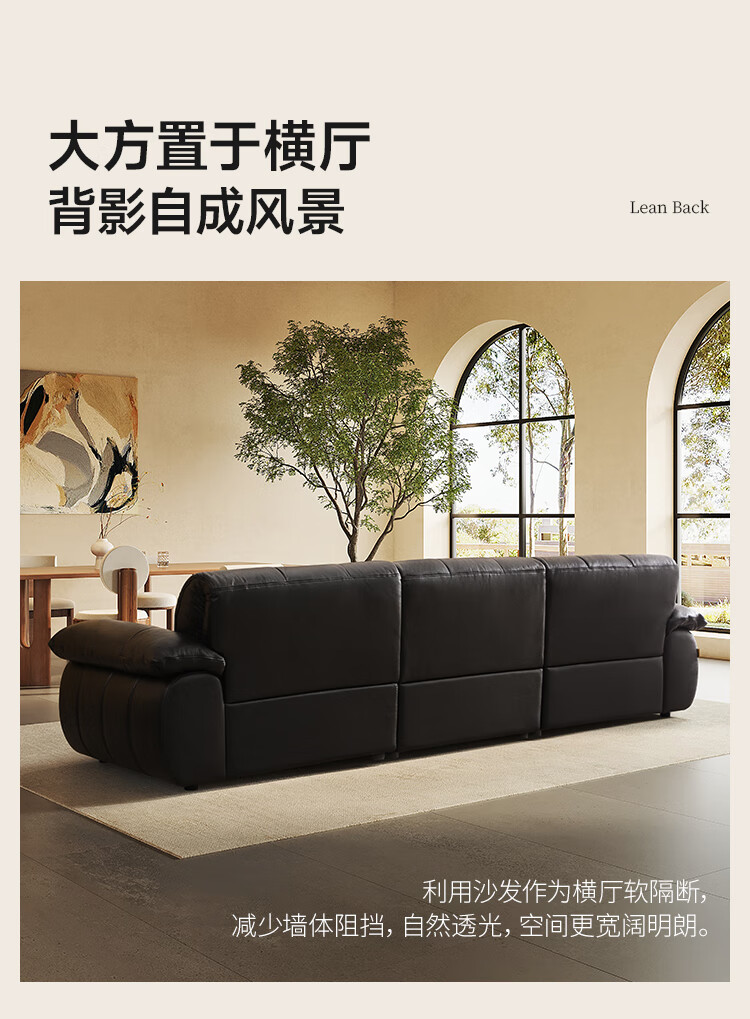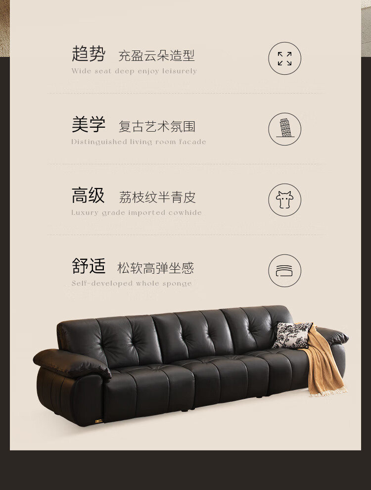 芝华仕大黑牛真皮沙发复古云朵客厅2025新款半青皮沙发3176B 玛瑙黑-2.45M-进口厚实半青皮 延期发货(详询客服)