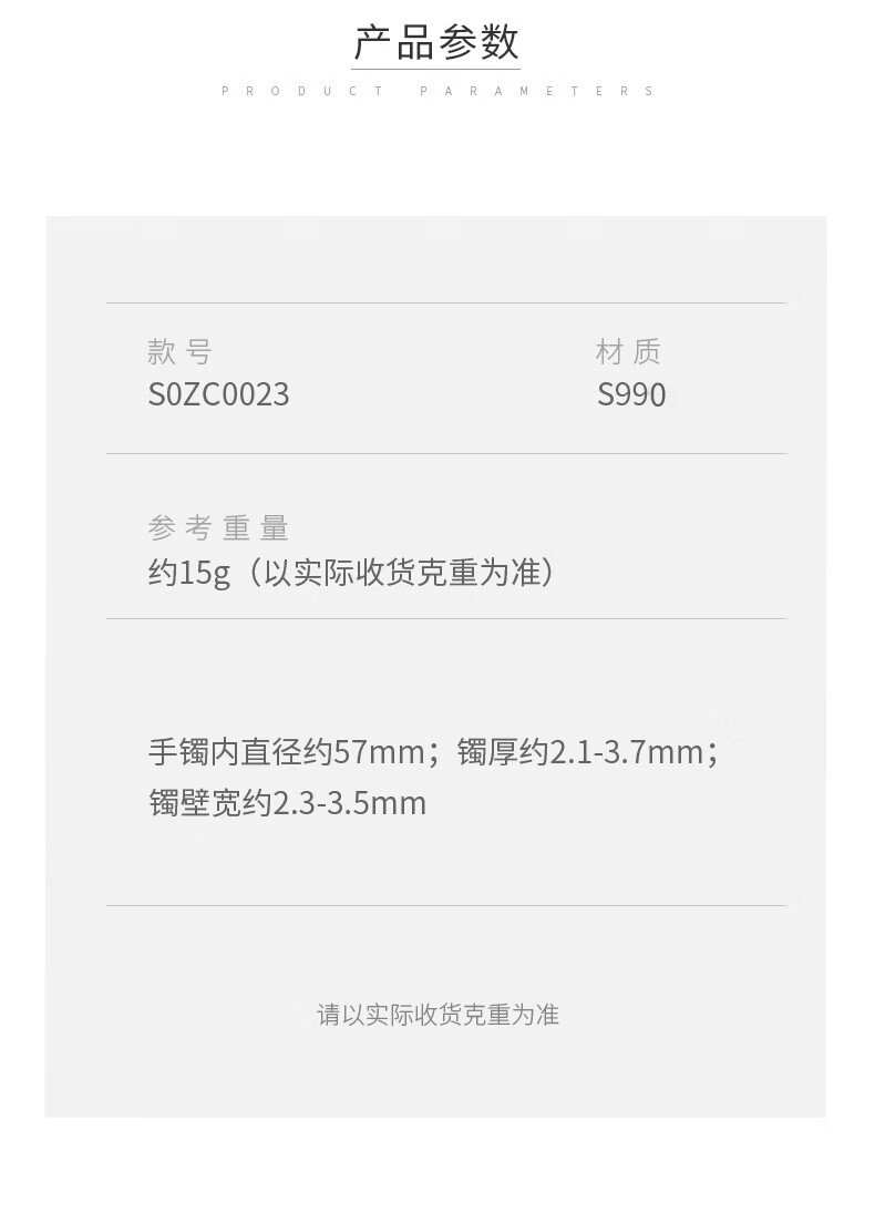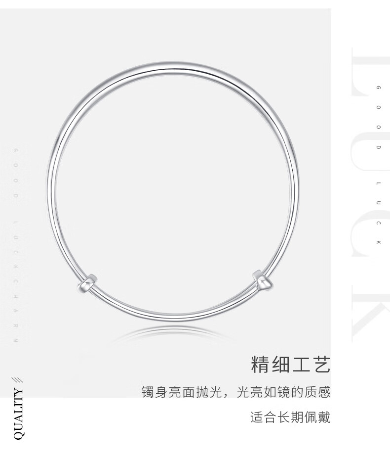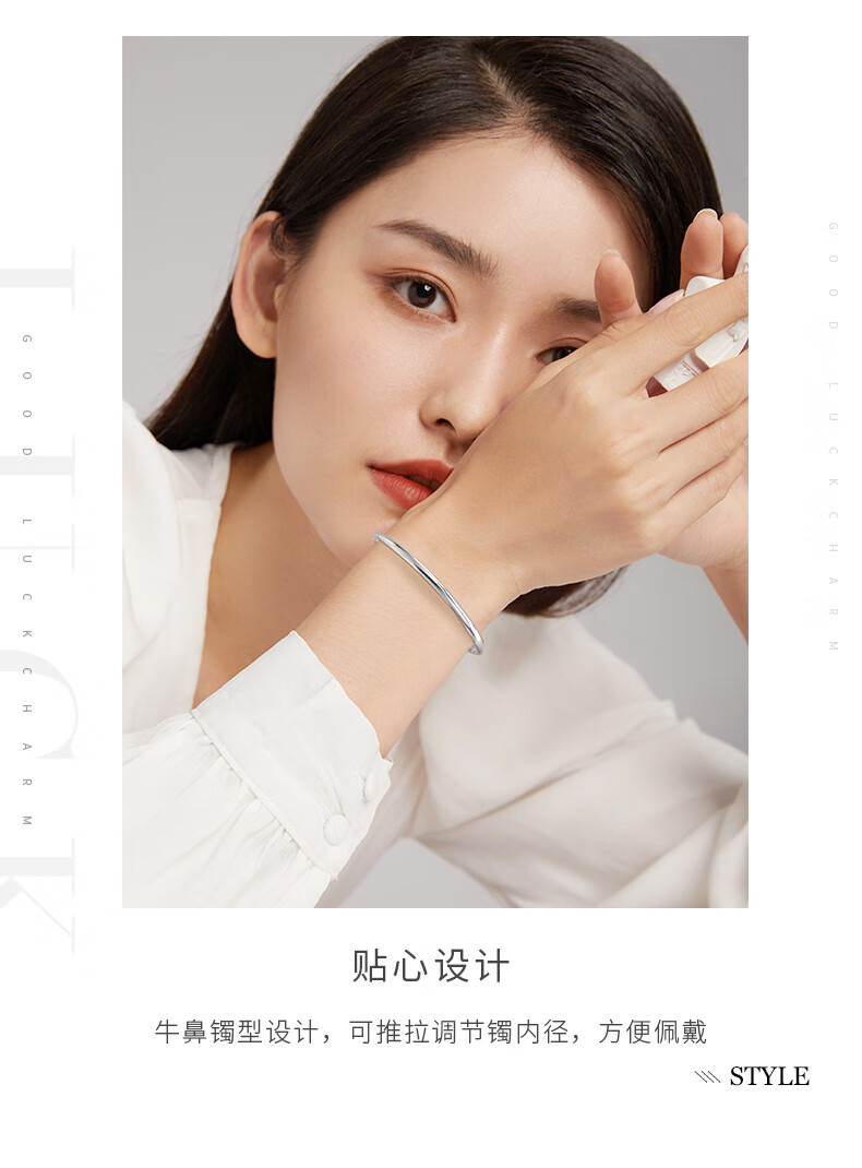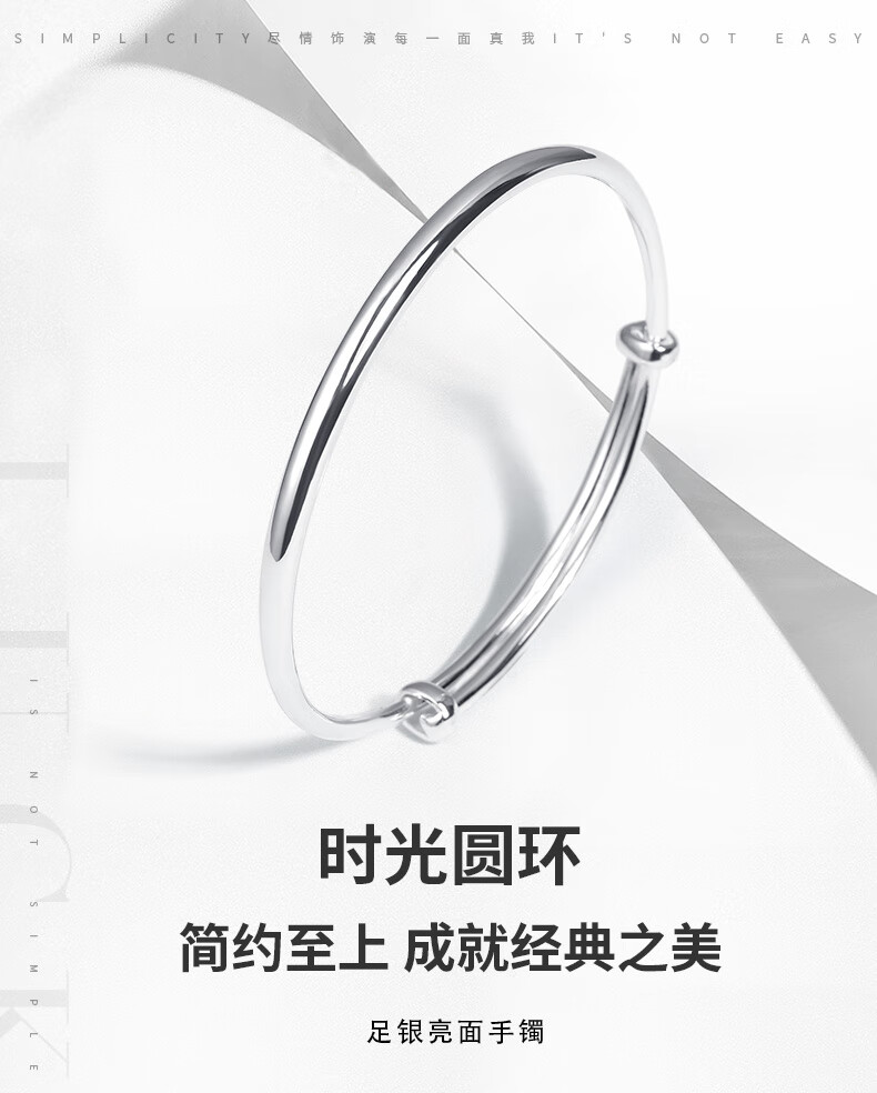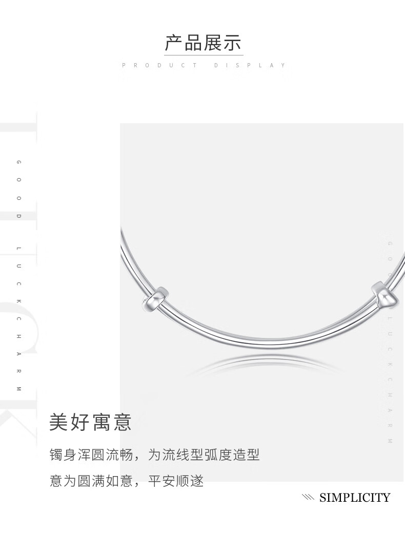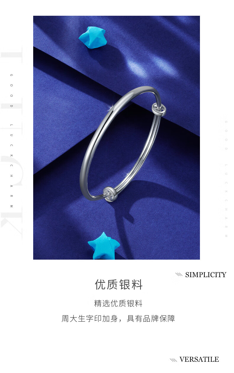 周大生足银手镯光面推拉简约银手镯生日礼物送女友