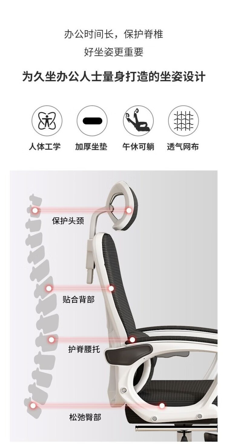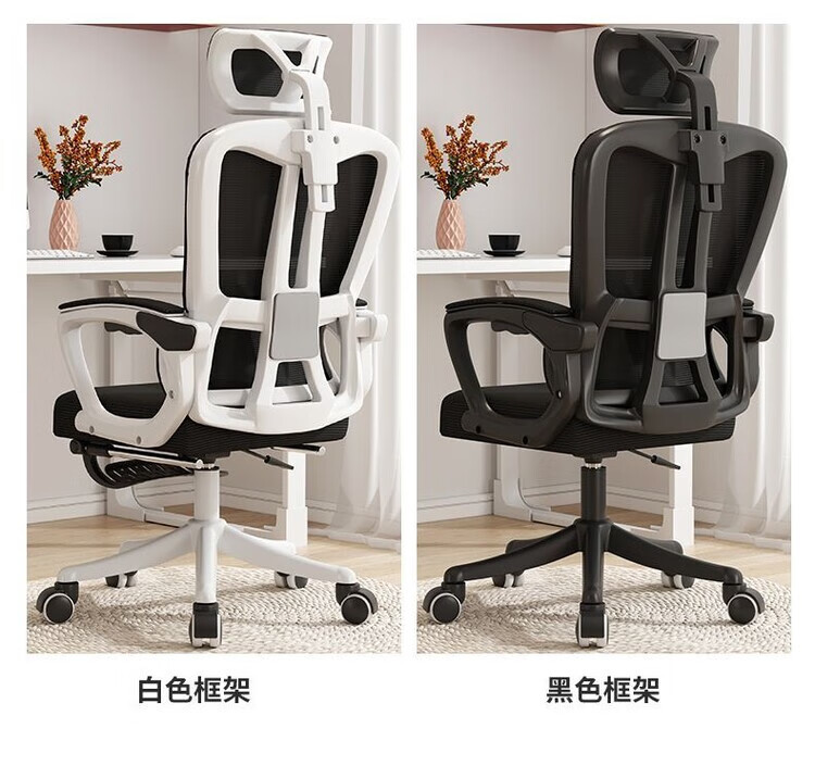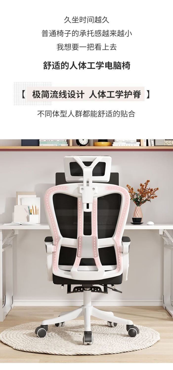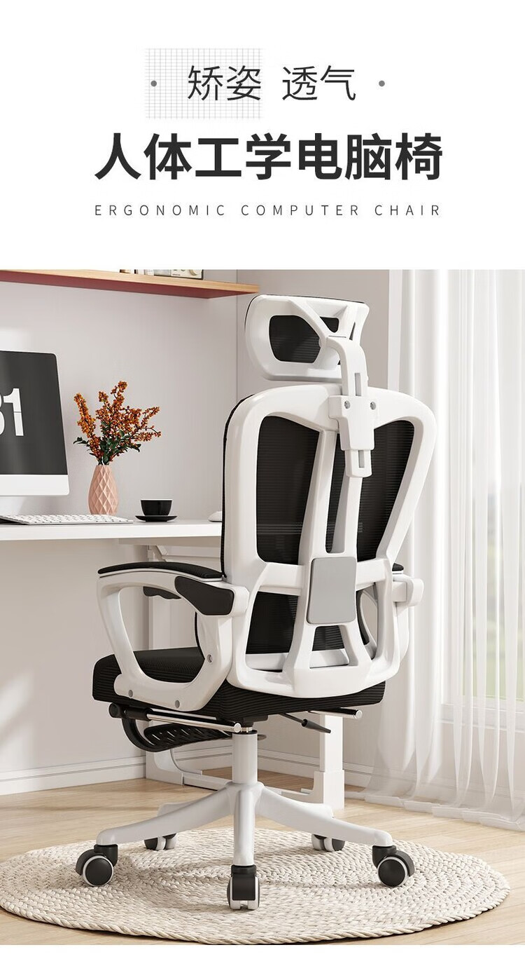 弘星隆电脑椅家用人体工学椅子靠背学习写字椅书房座椅办公椅电竞游戏椅 白框黑网可躺丨3D腰靠+3D头枕
