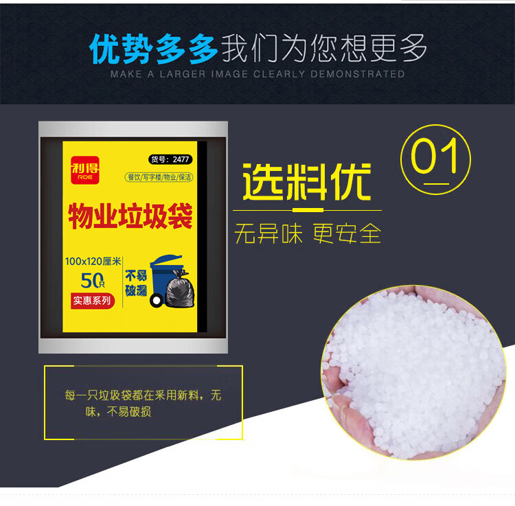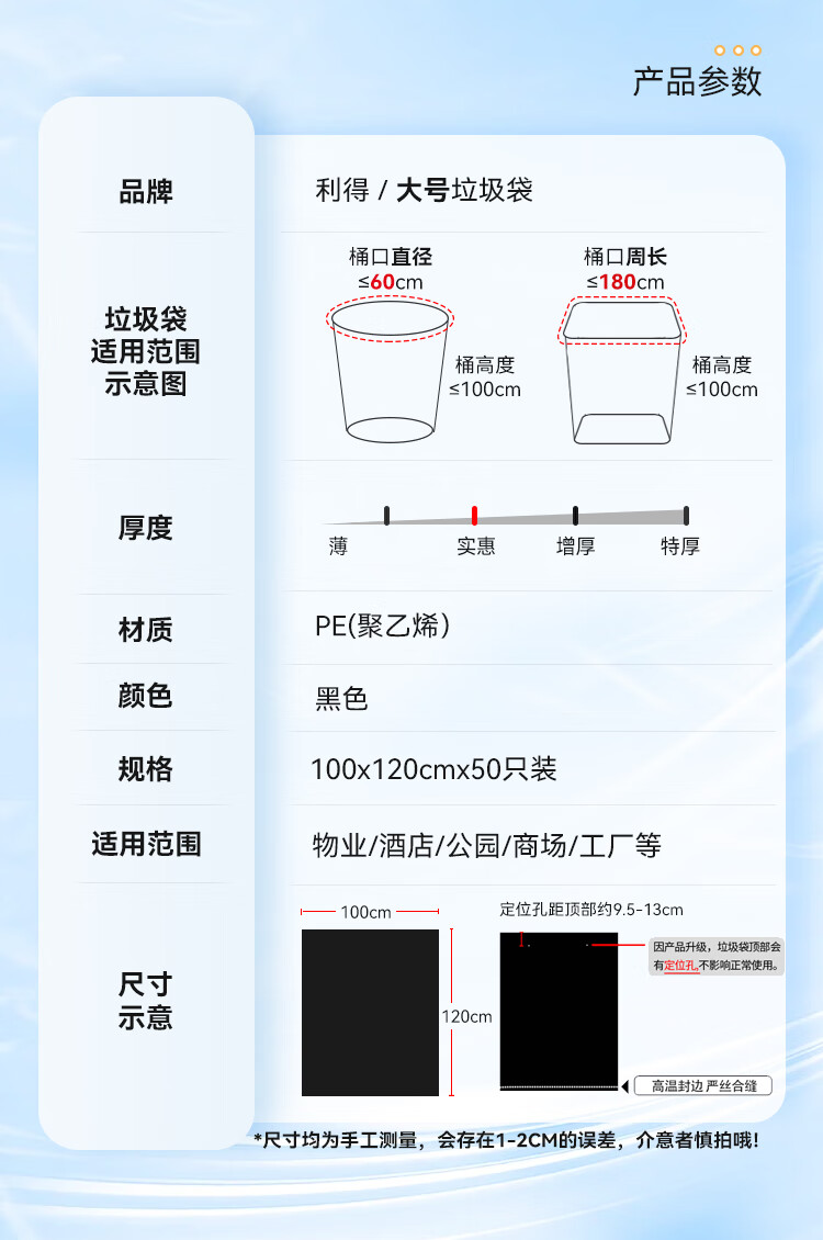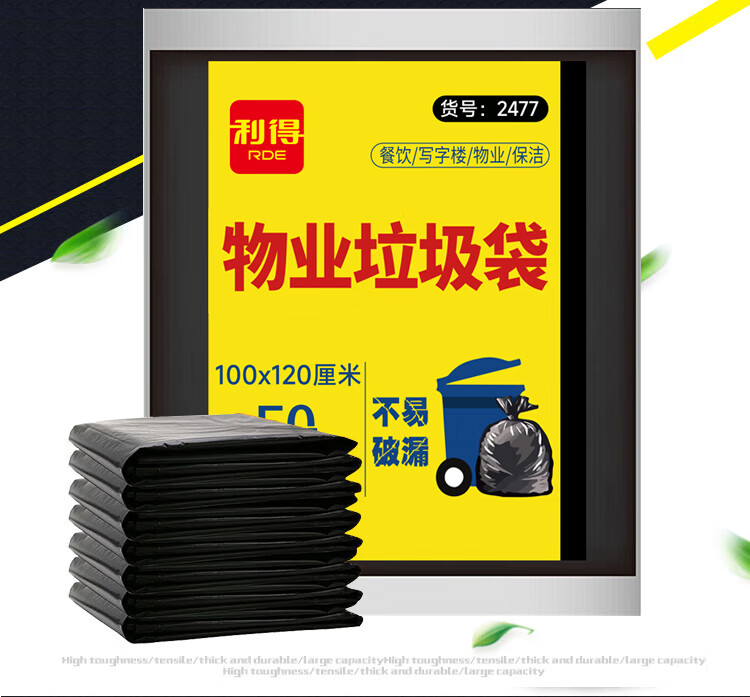利得平口垃圾袋黑色100*120cm50只单面1.5丝特大号加厚物业袋实惠装
