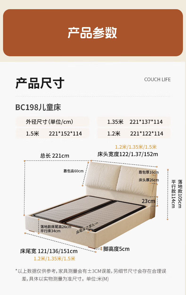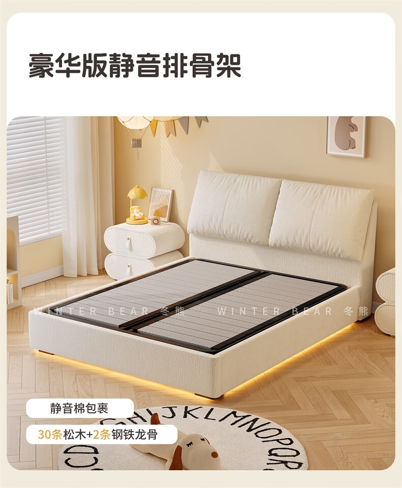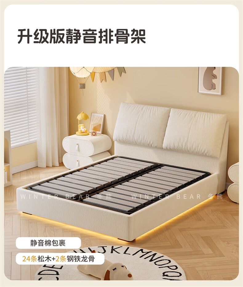 冬熊奶油风平移储物布艺儿童床现代简约男孩女孩小户型高箱单人床 猫抓布/静音排骨架 1200mm*2000mm 框架结构