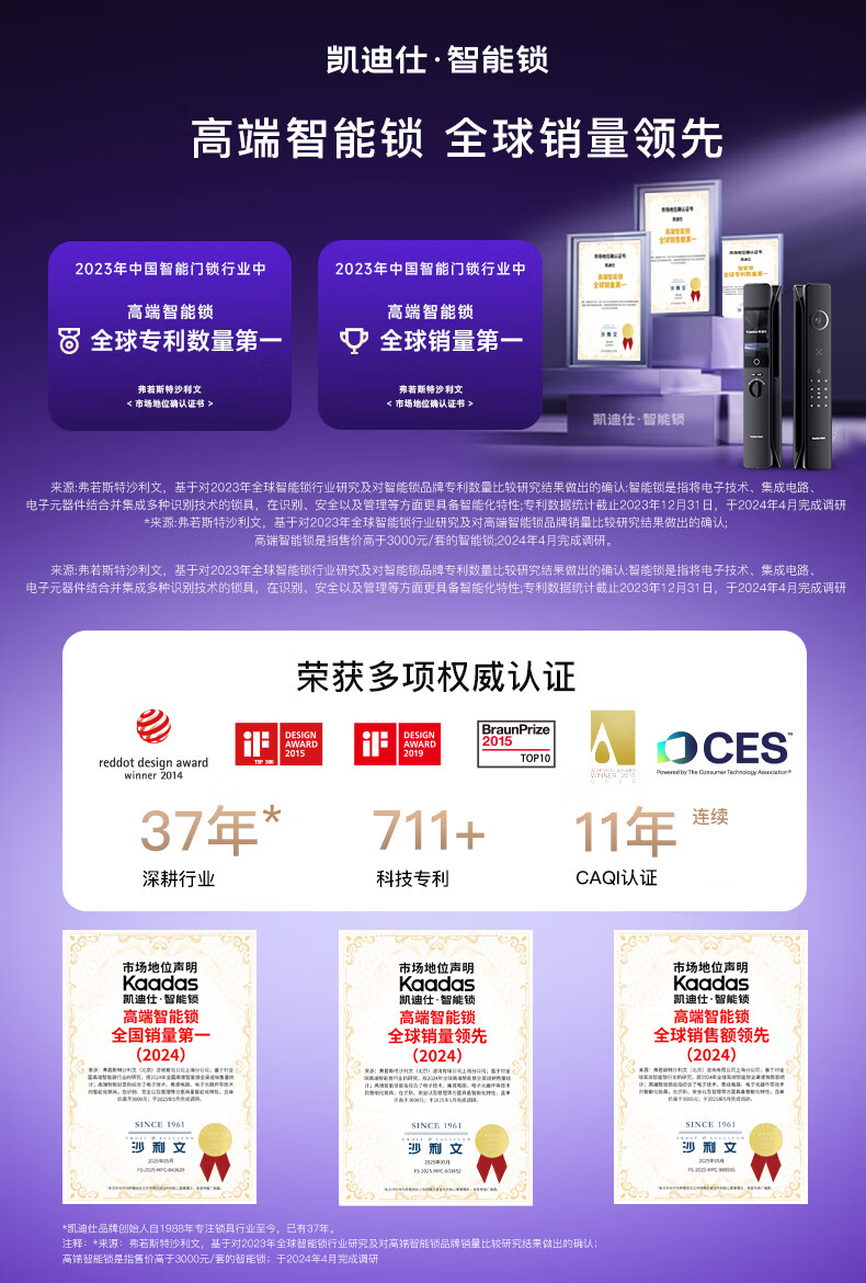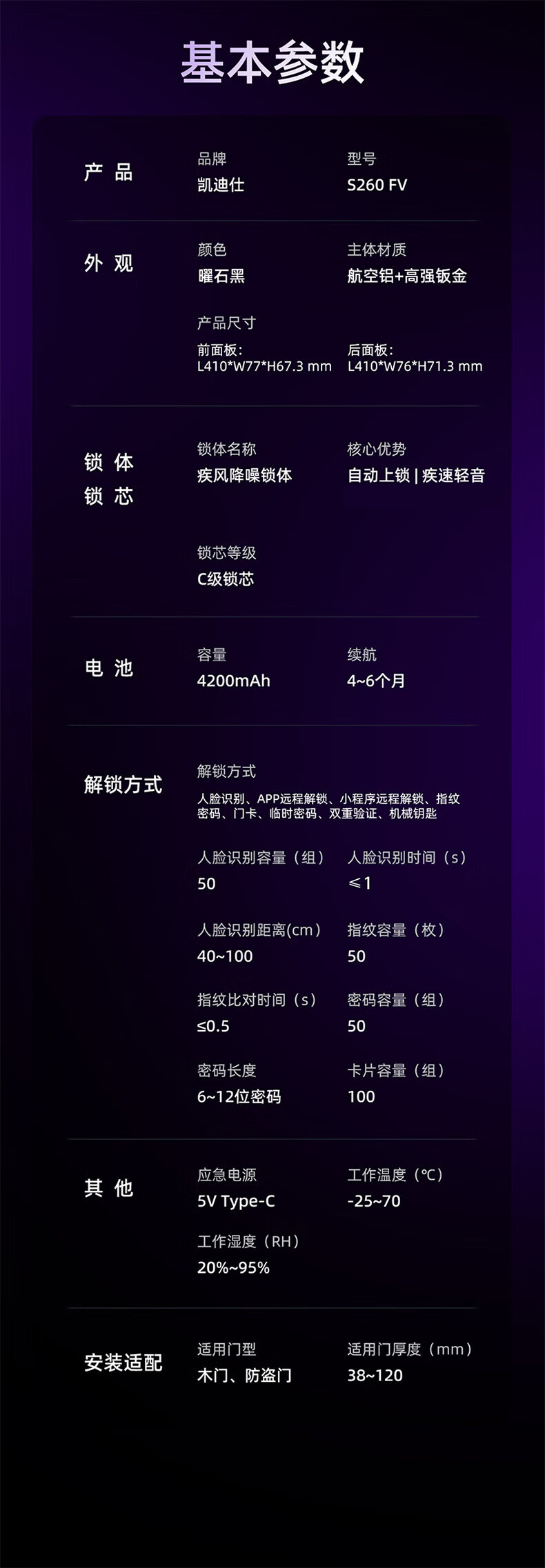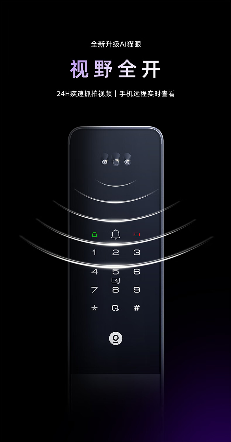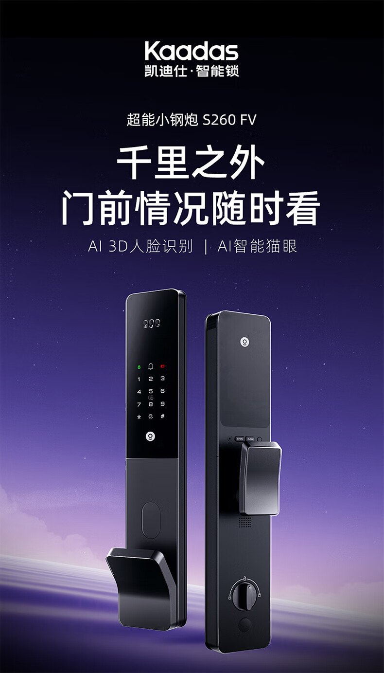 凯迪仕(kaadas)智能锁 猫眼监控摄像指纹锁 3D人脸识别智能门锁 国家补贴 S260FV