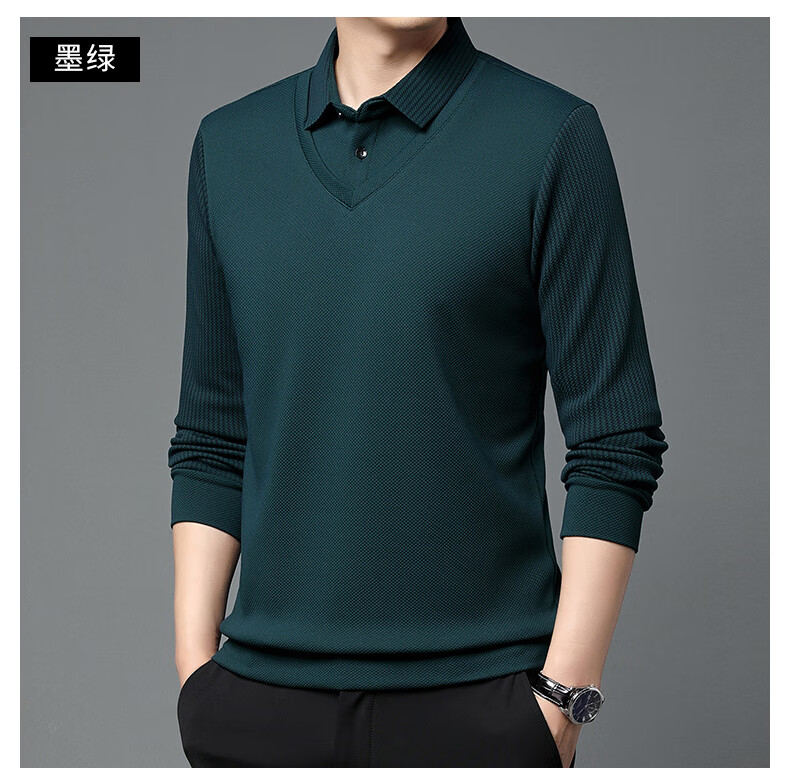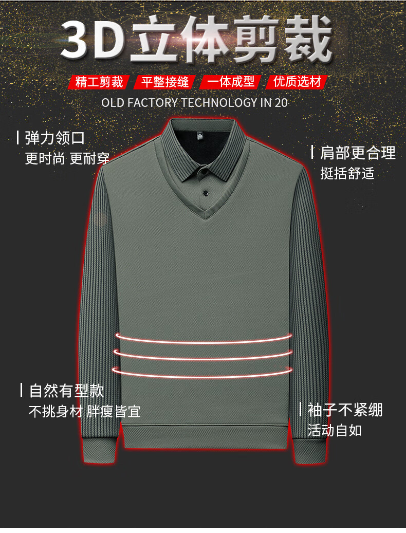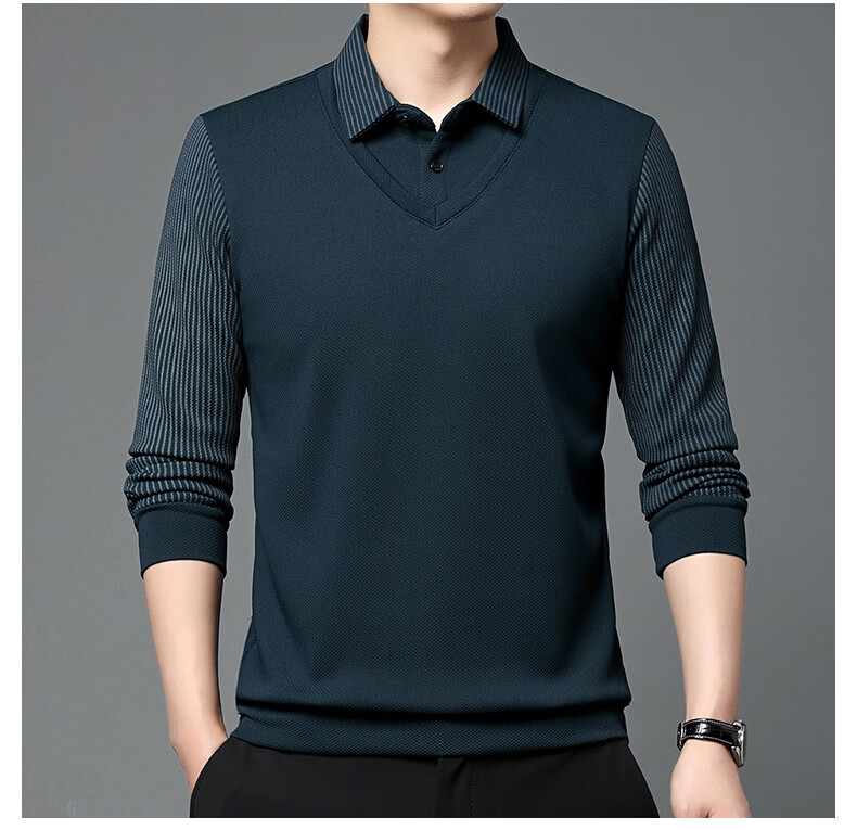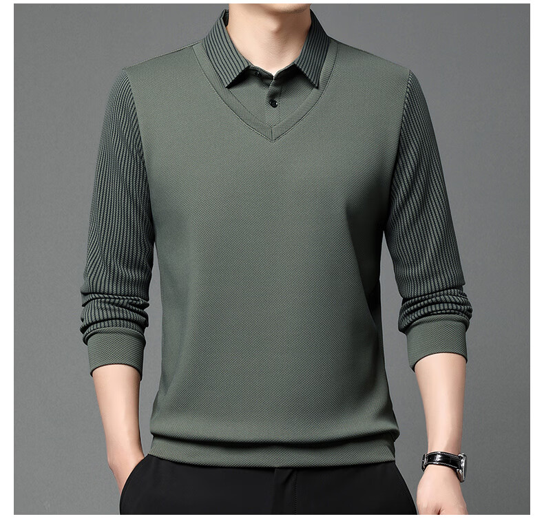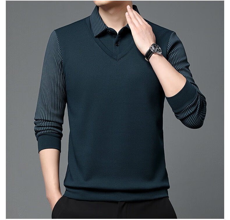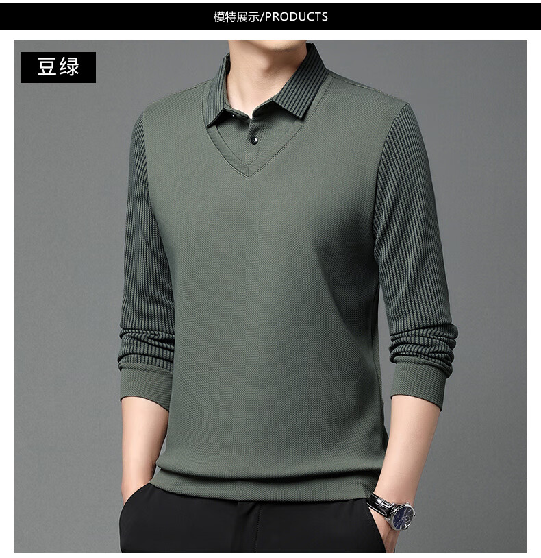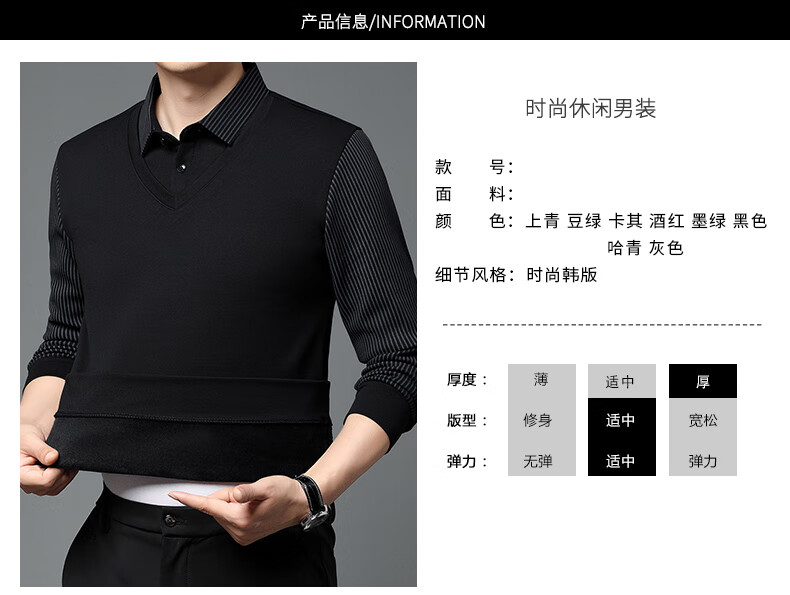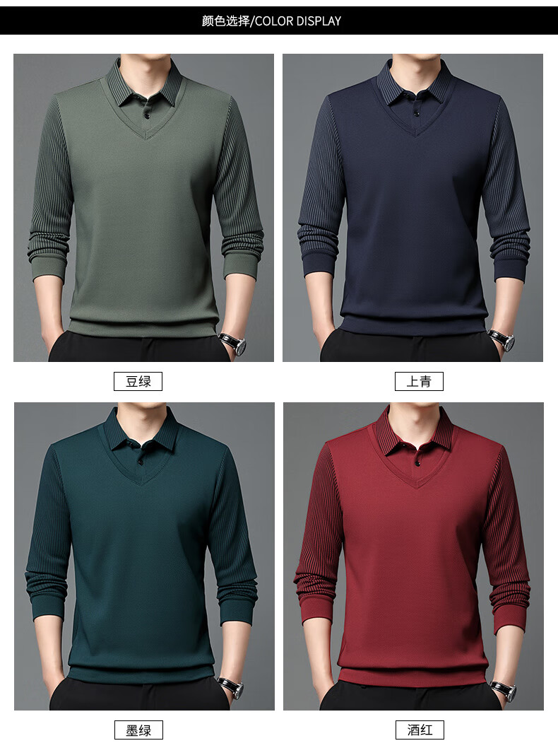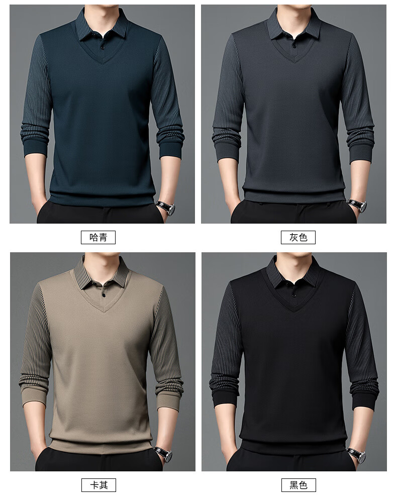 汤米芙兰可加绒加厚假两件毛衣男2025年秋冬季新款保暖休闲修身套头男士上衣 哈青常规不加绒 XL /175(建议135-150斤)
