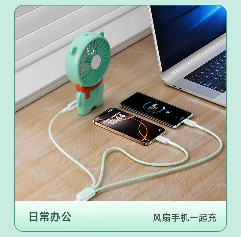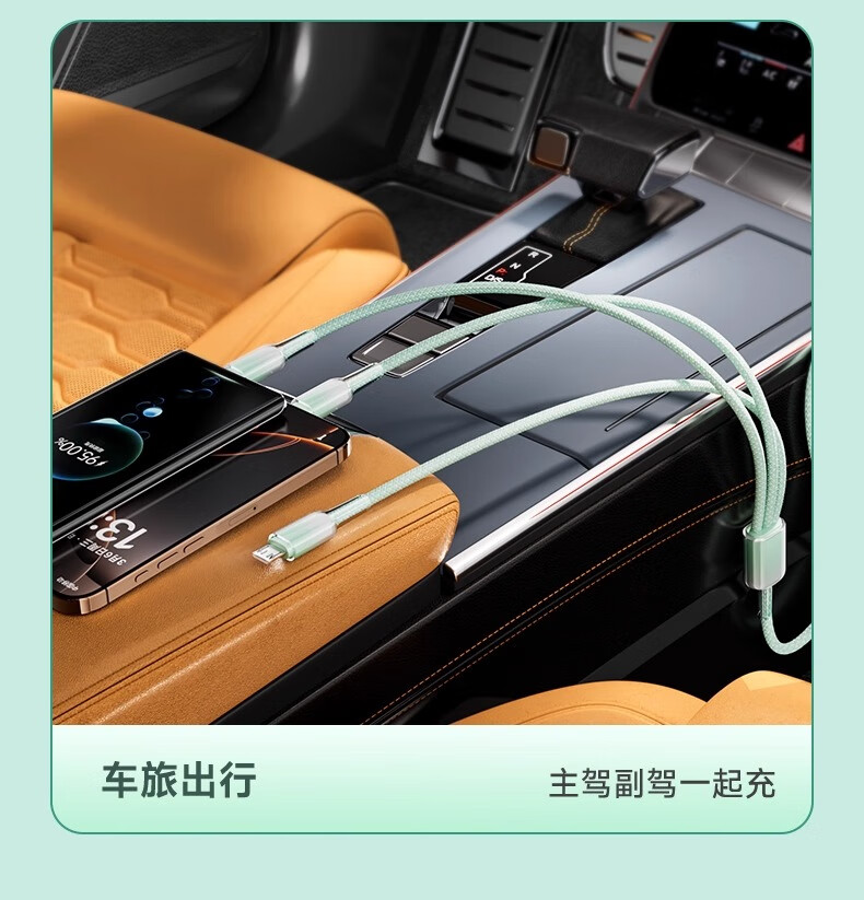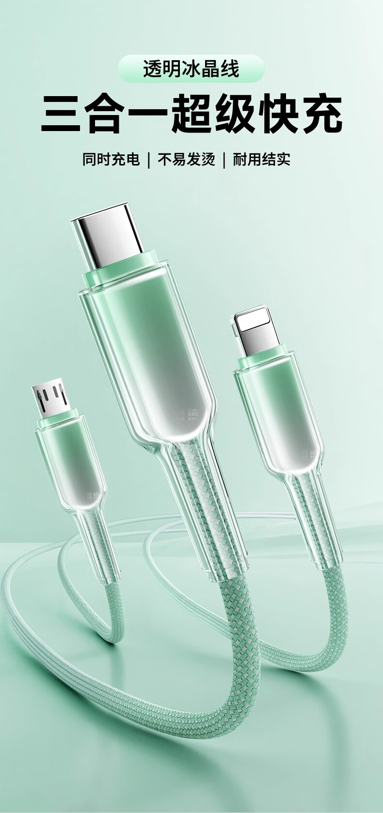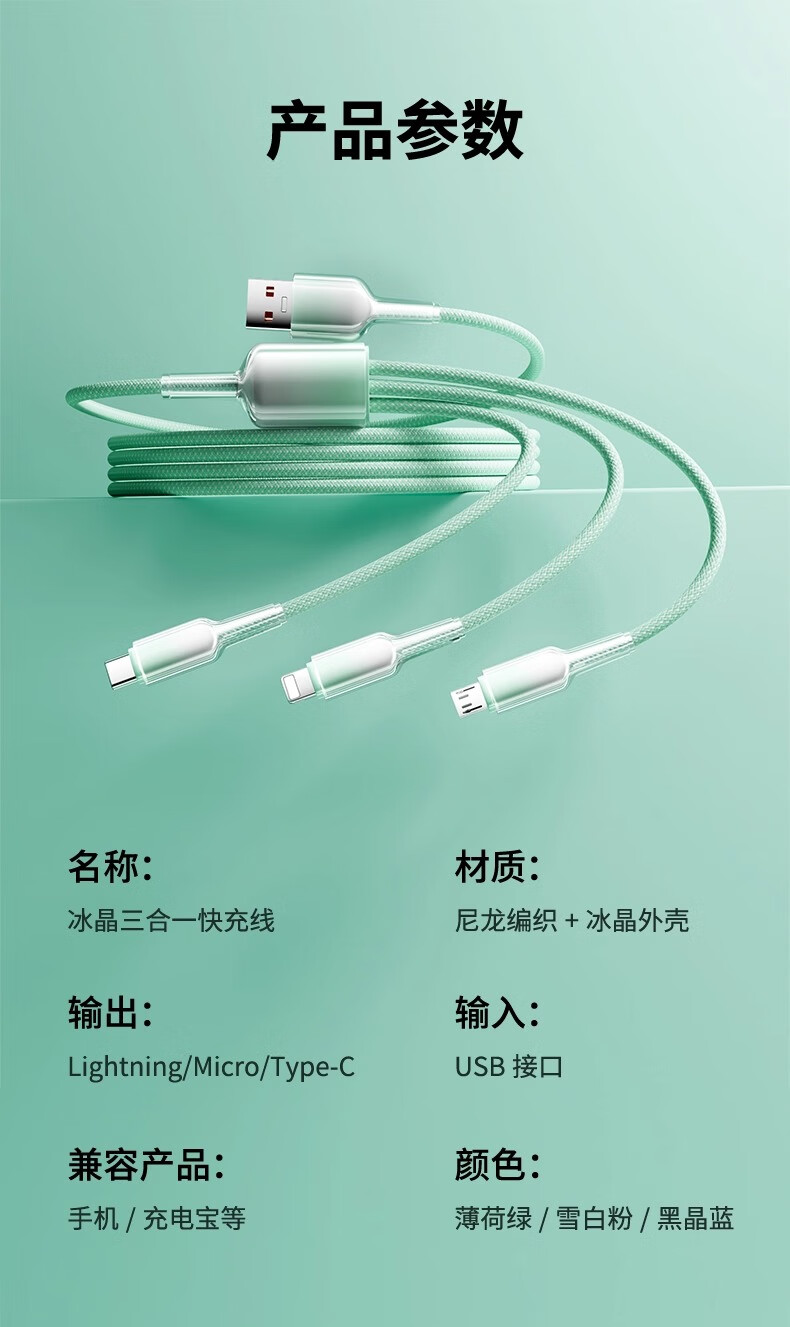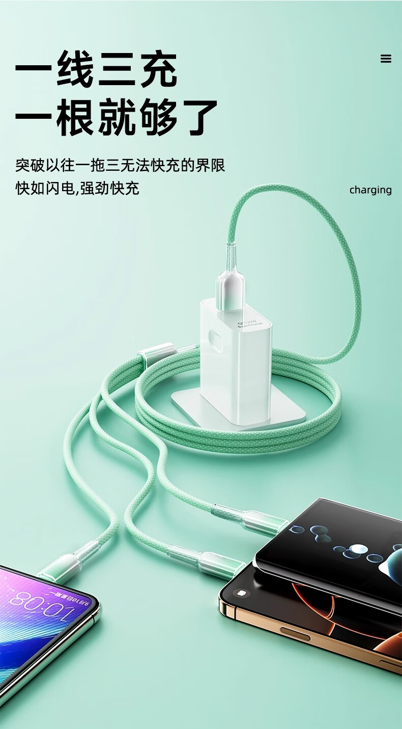 萨勒芬妮 冰晶渐变一拖三【66W超级快充】数据线三合一6A苹果安卓Type-C充电器线车载适用华为小米三星手机 1.2米【薄荷绿】冰晶渐变·颜值出众丨低温快充
