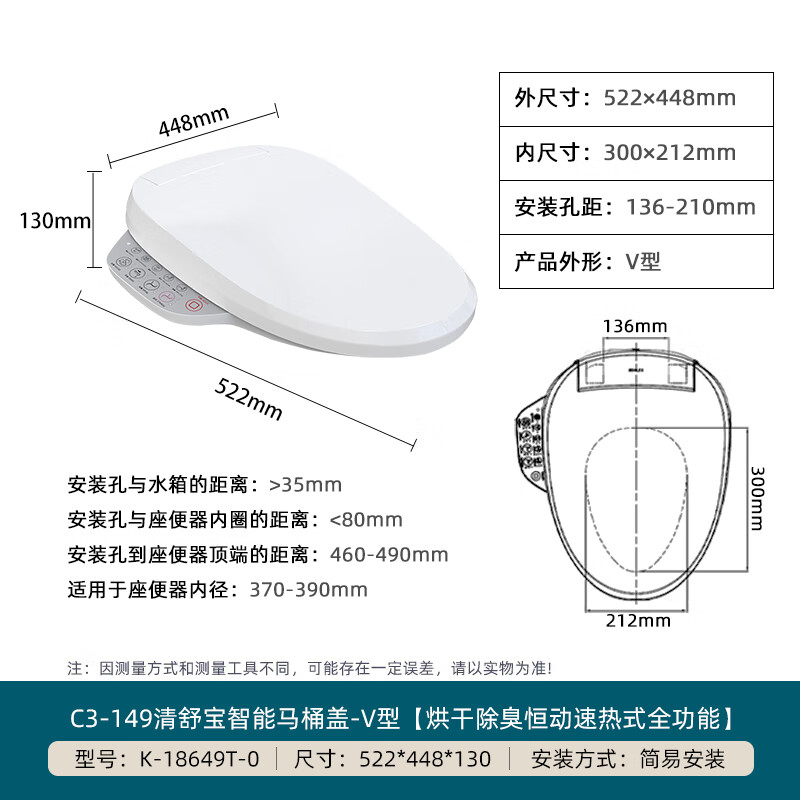 科勒(KOHLER)智能马桶盖智能坐便盖清舒宝C3-149恒动速热式全功能K-18649T-0