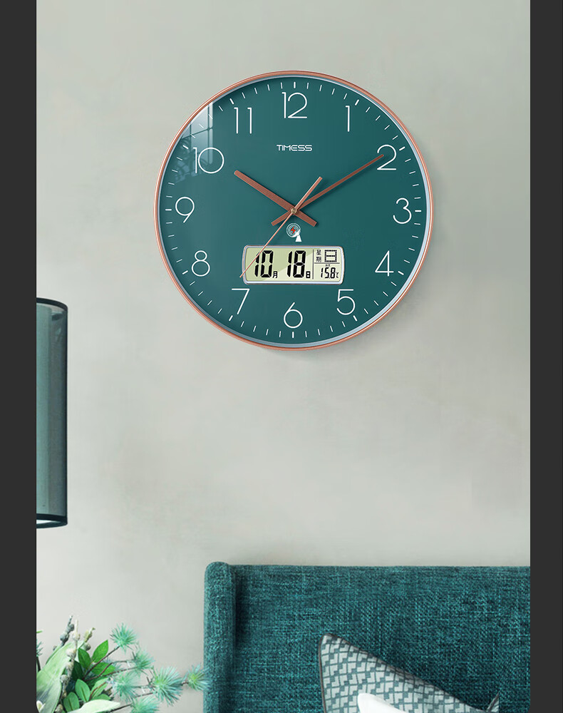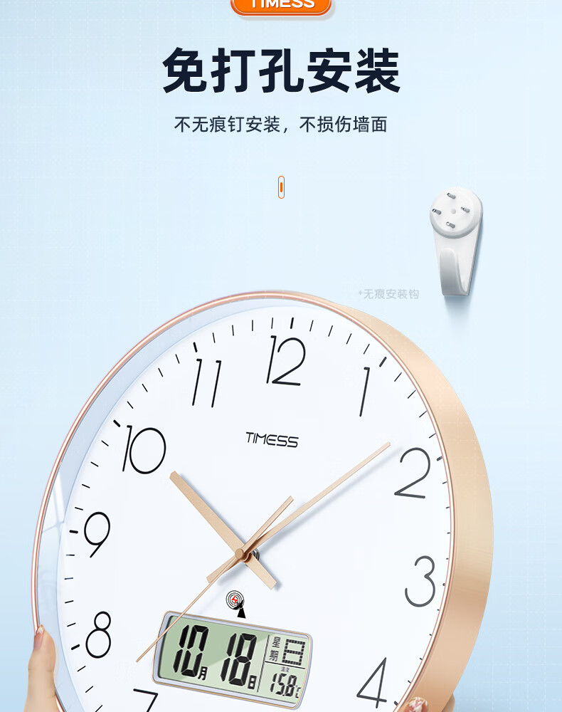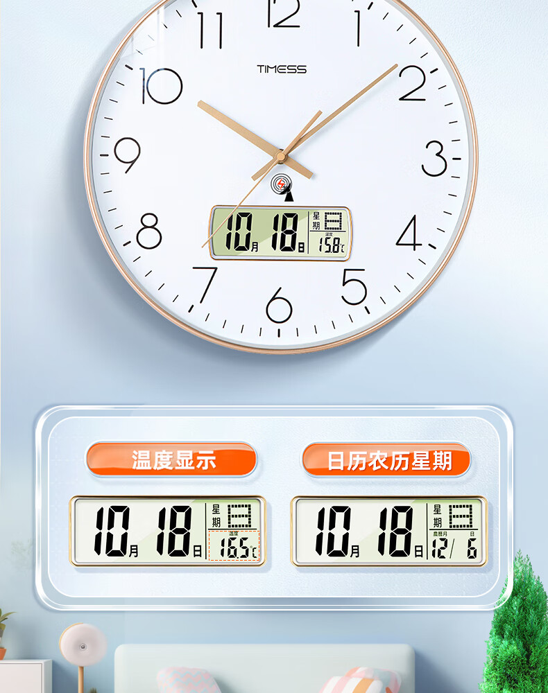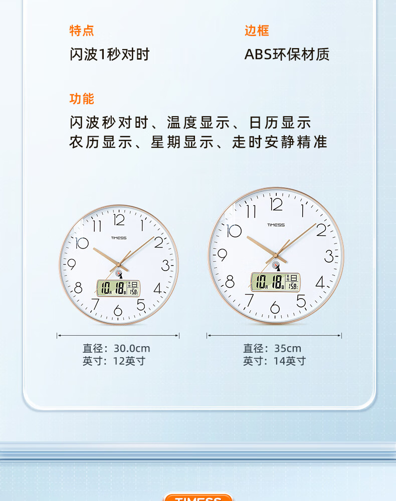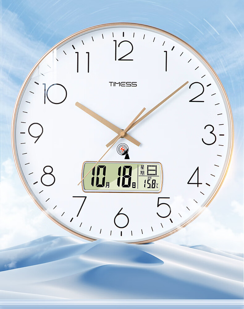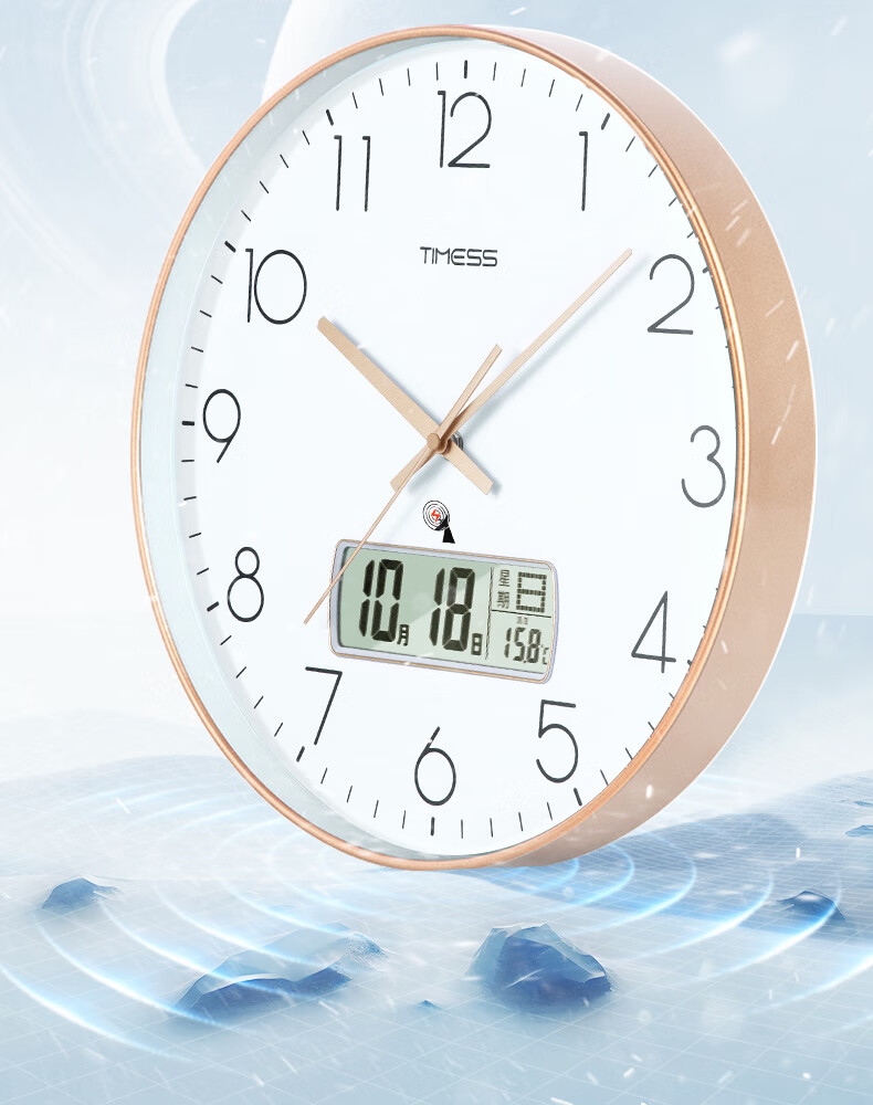 Timess电波钟自动对时挂钟客厅钟表2025新款温度日历免打孔表挂墙35cm
