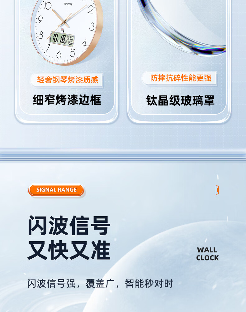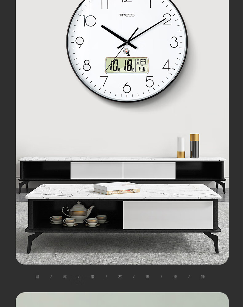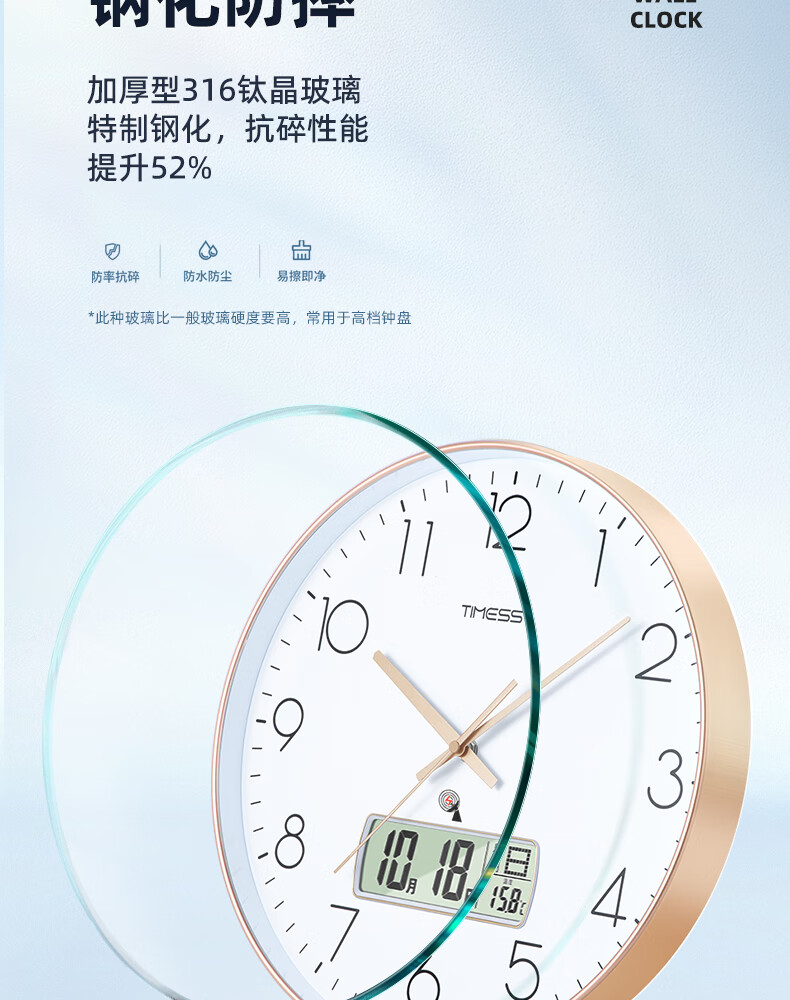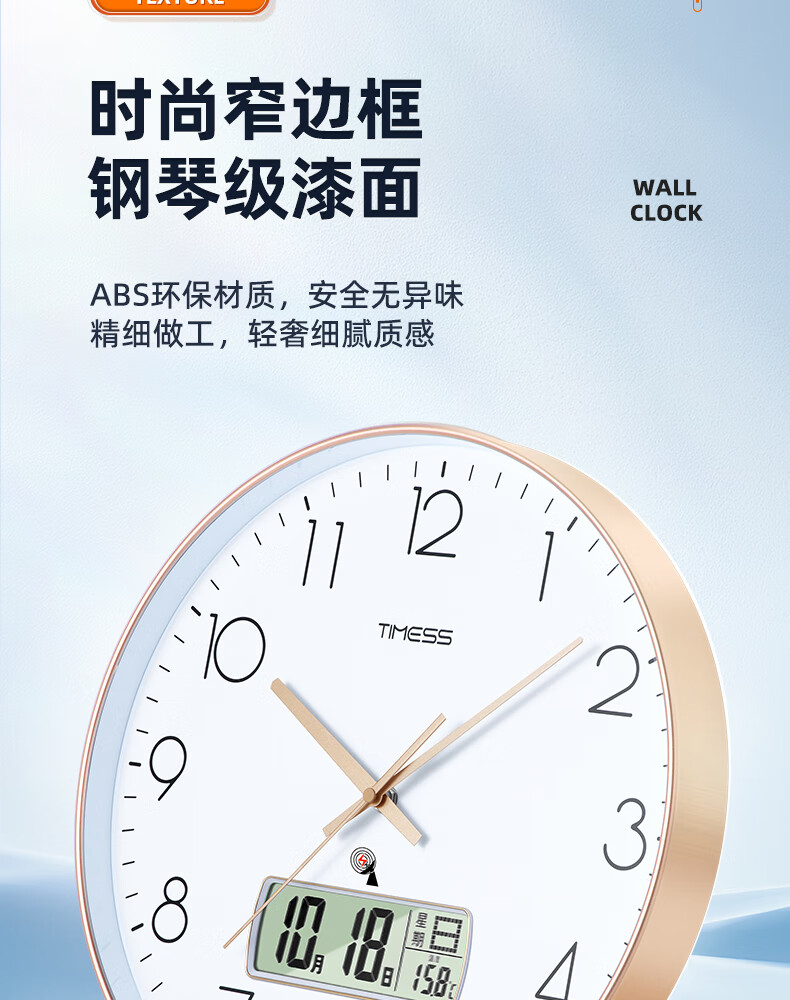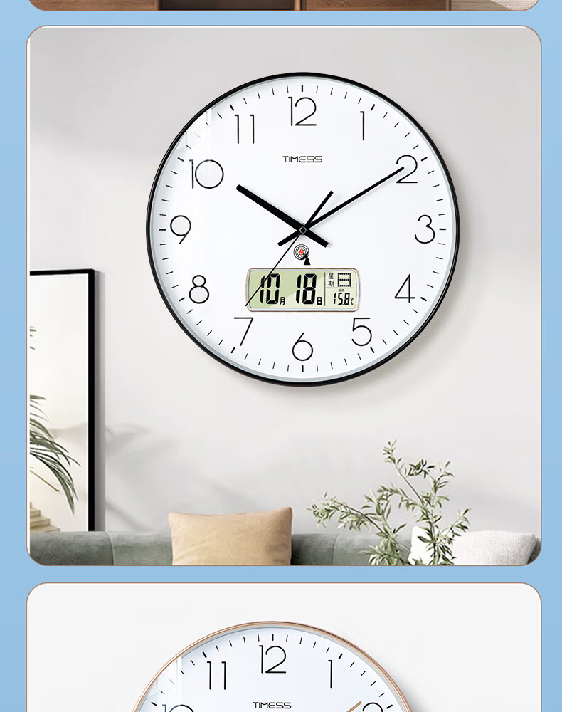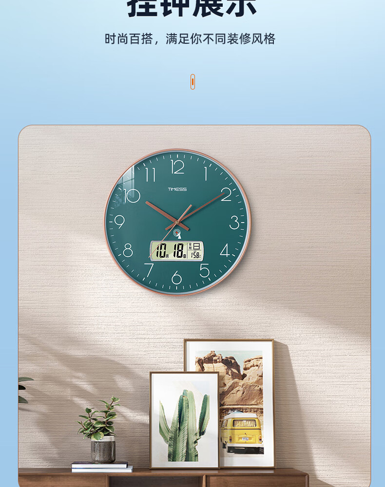 Timess电波钟自动对时挂钟客厅钟表2025新款温度日历免打孔表挂墙35cm