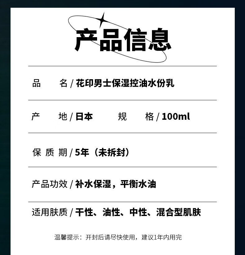 花印男士乳液水份乳100ml 补水保湿控油护肤品润肤乳男友老公生日礼物