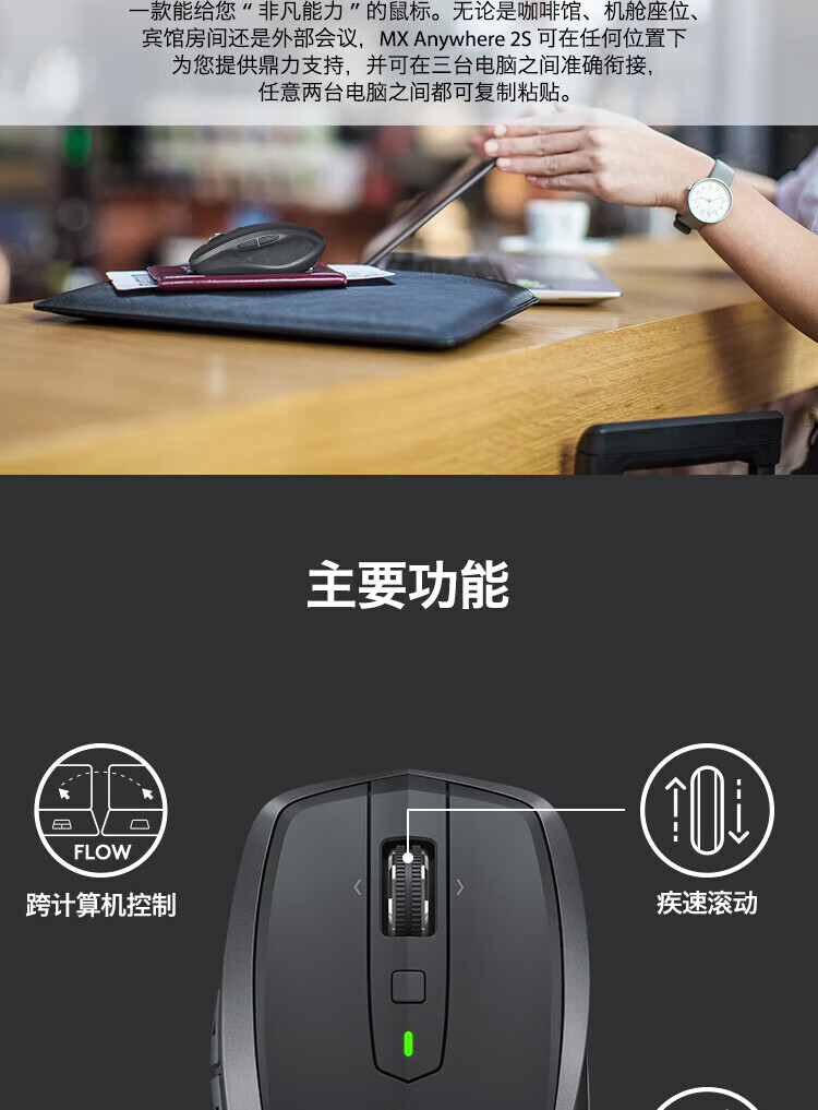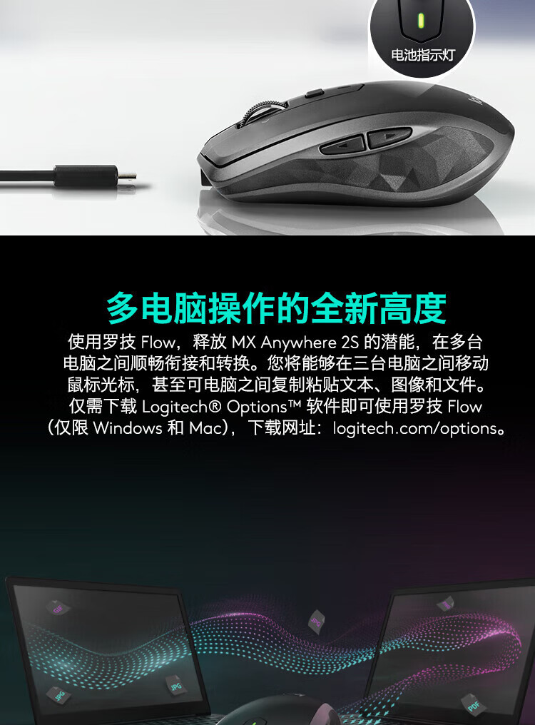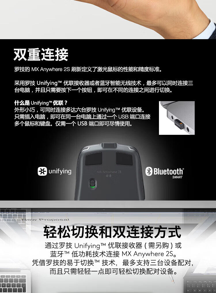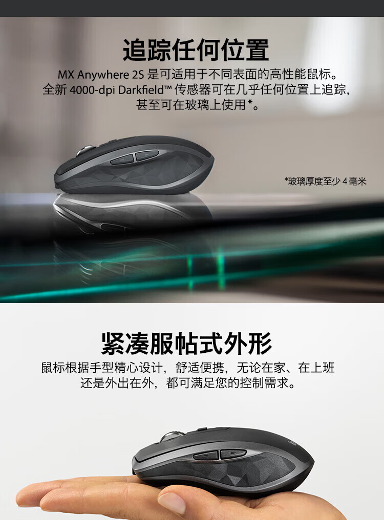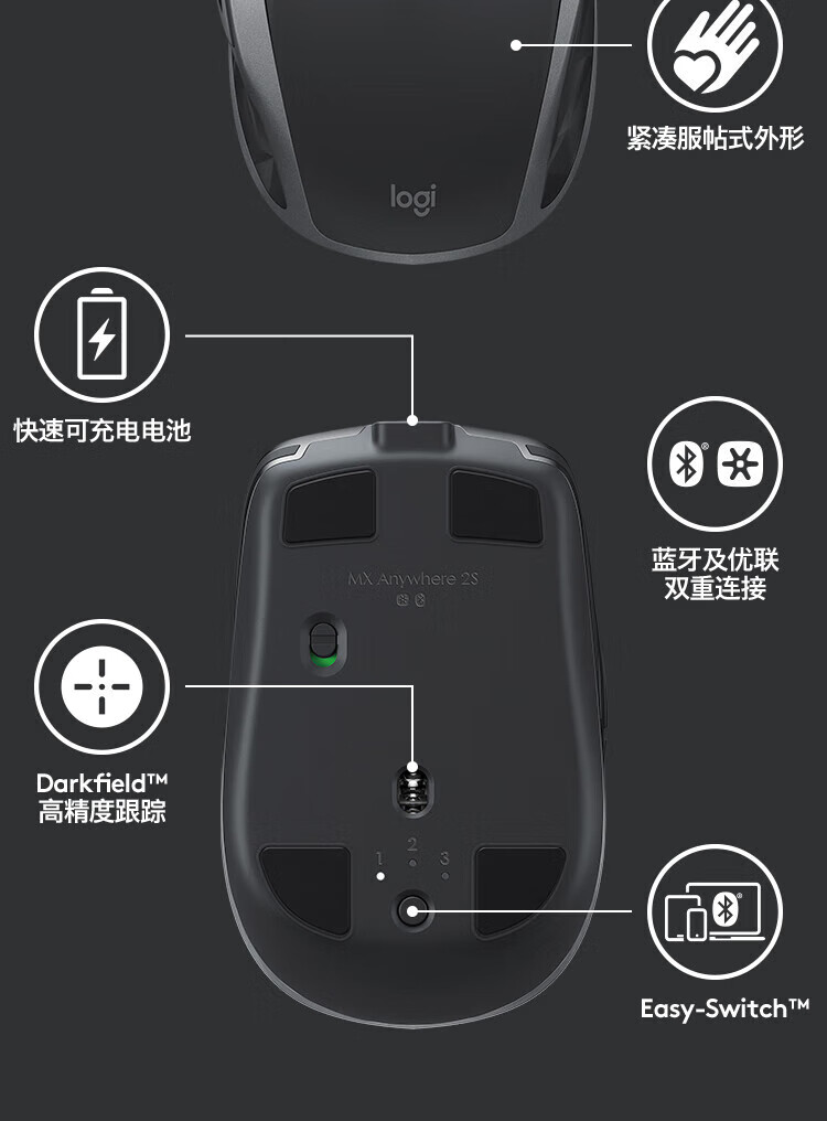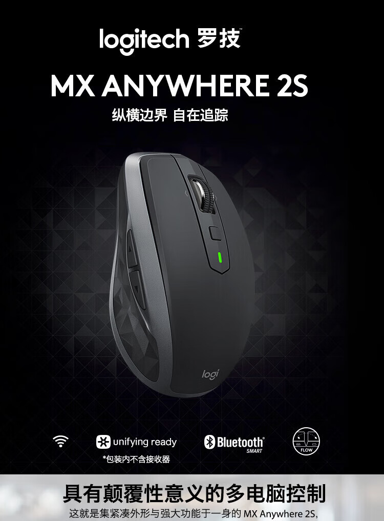 罗技(Logitech) 罗技大师系列MX Anywhere 2S无线蓝牙鼠标办公优联双模充电商务苹果MAC鼠标跨设备控制 Anywhere 2S黑