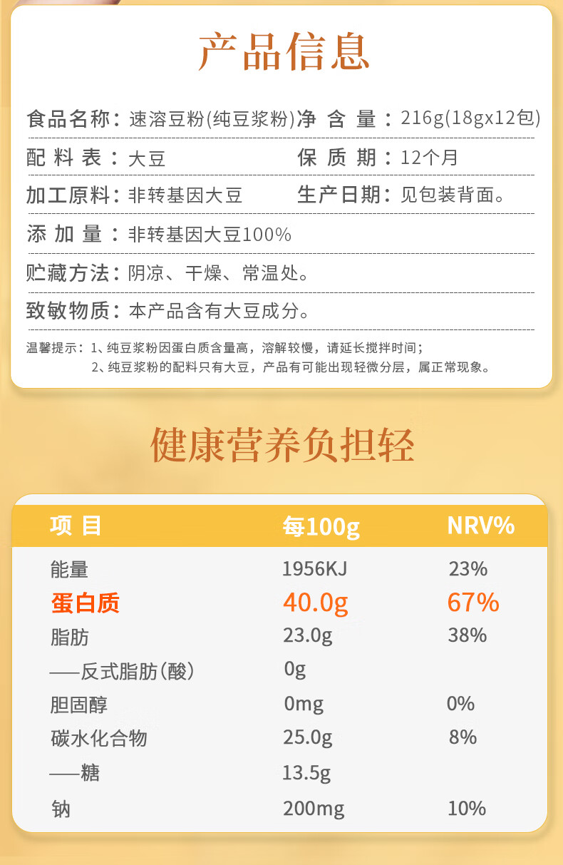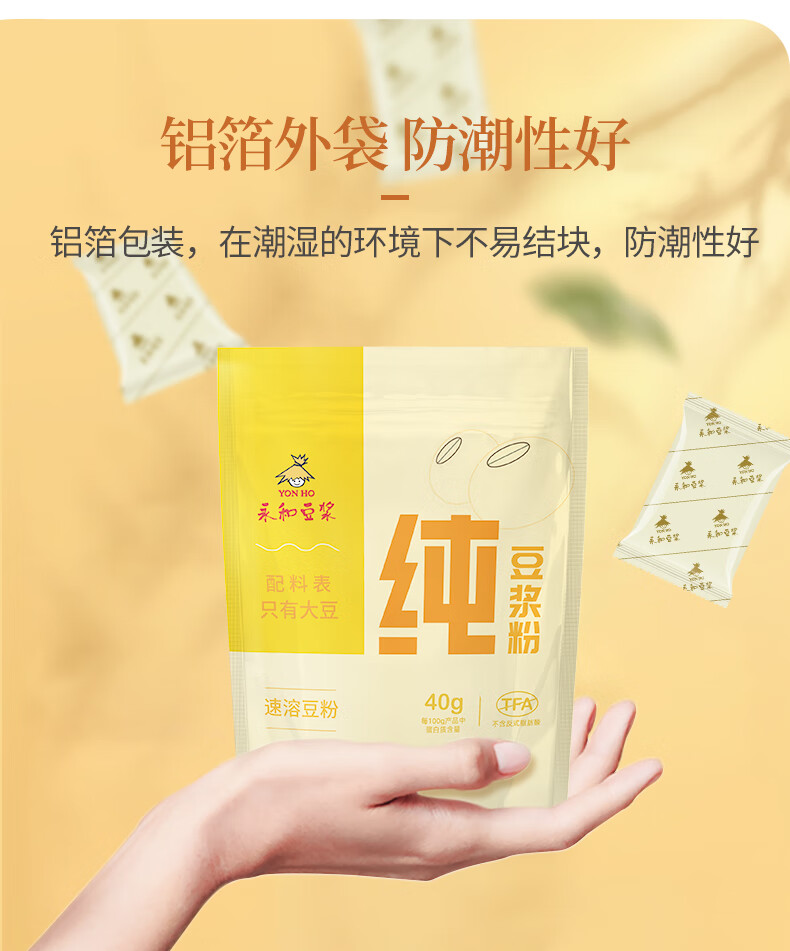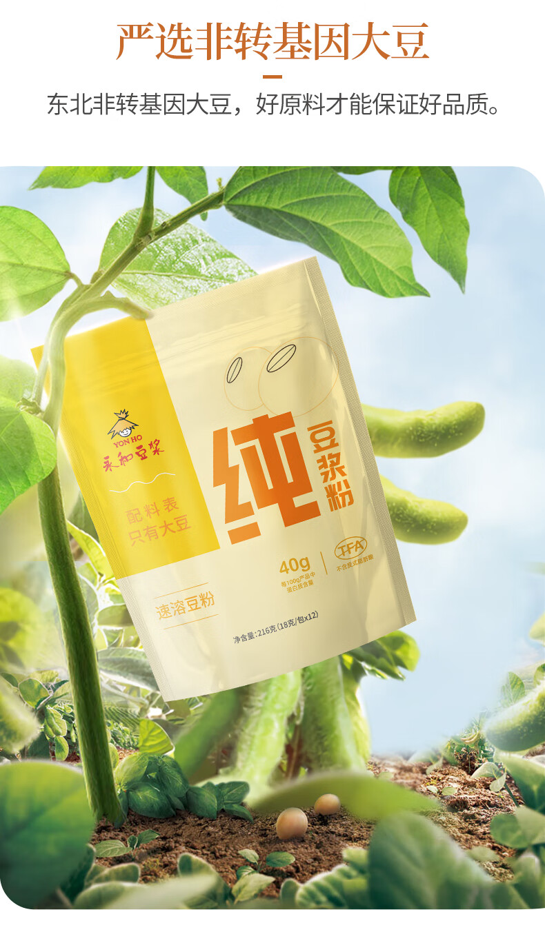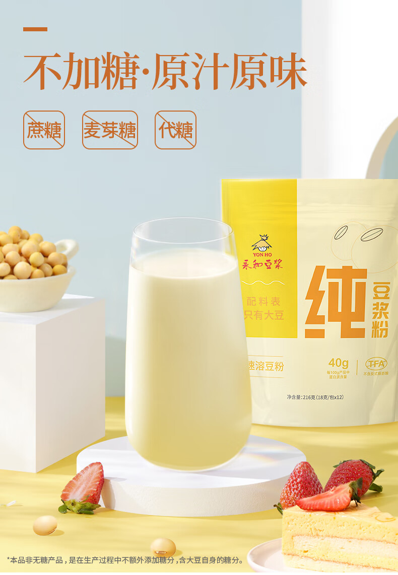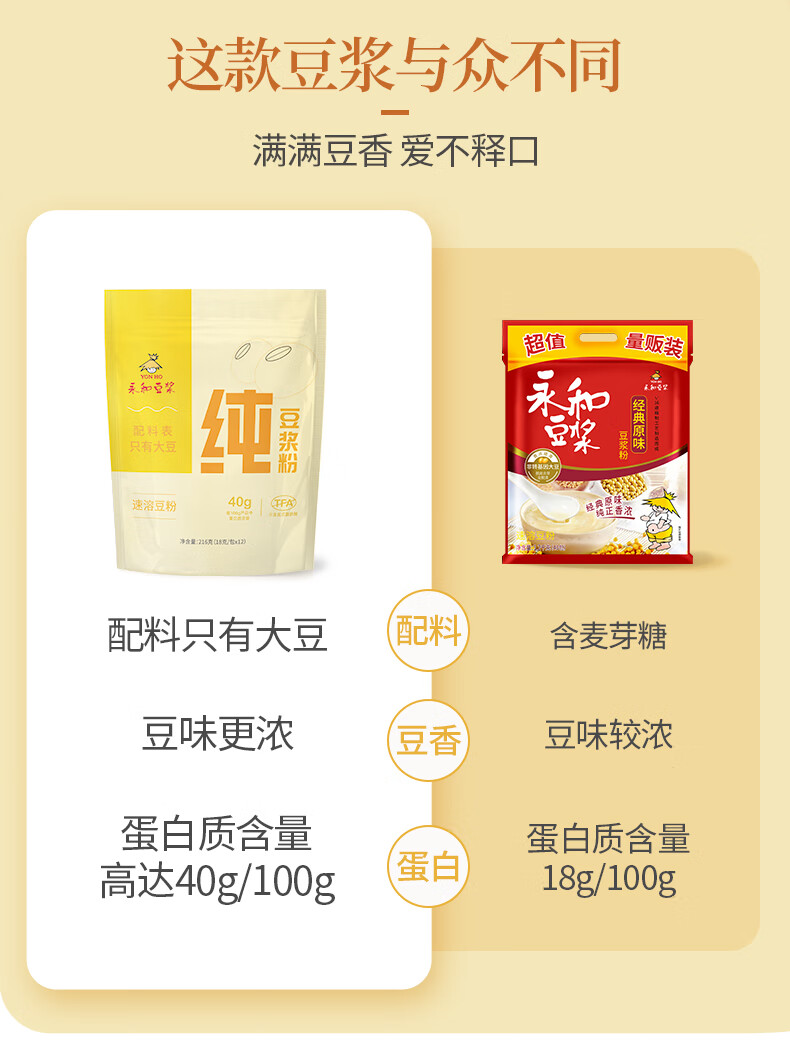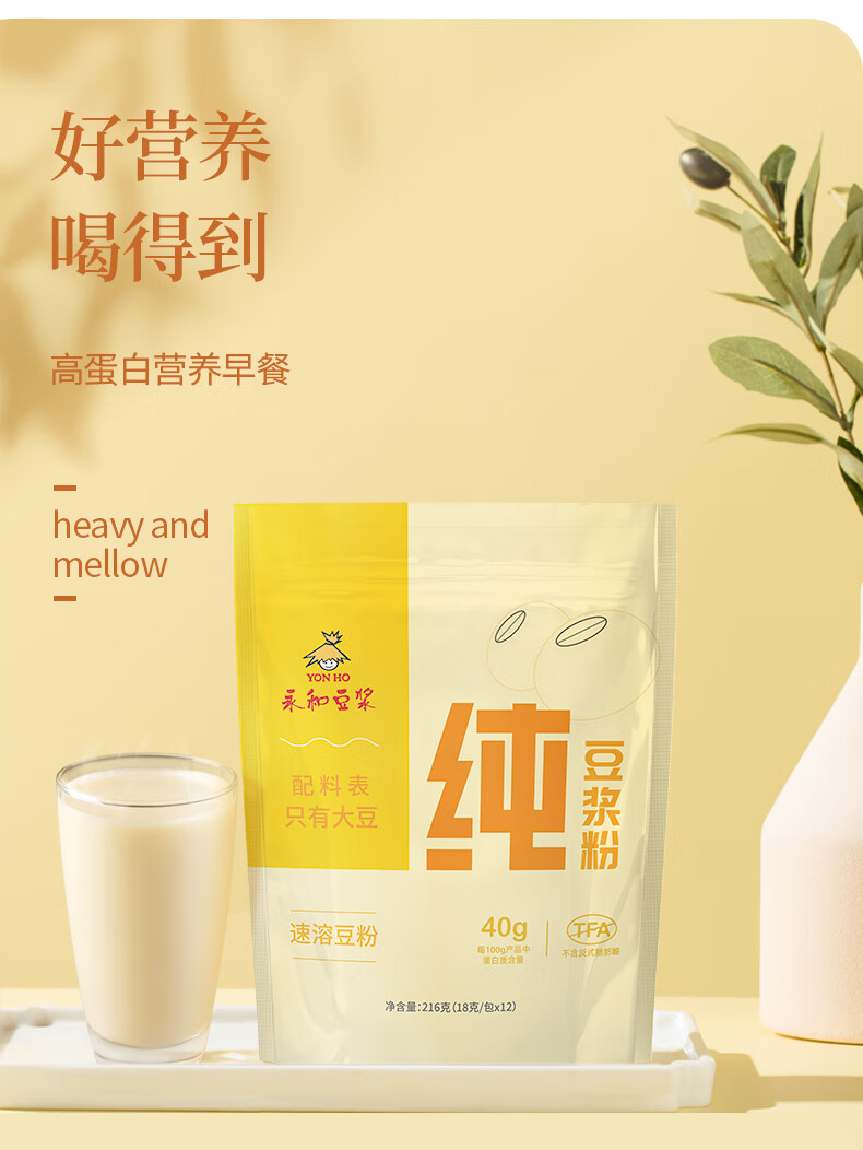 永和豆浆纯豆浆粉216g(18g*12包)0蔗糖添加 40%高蛋白即食营养早餐 纯豆浆粉18g*24包