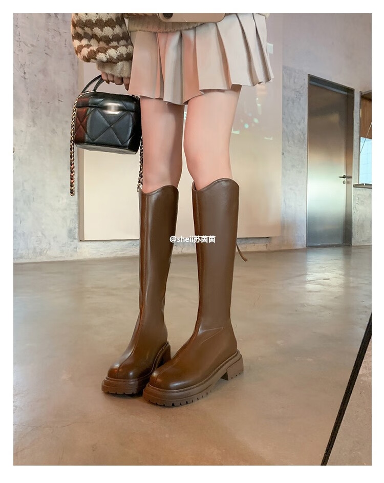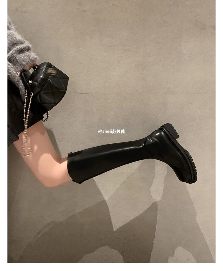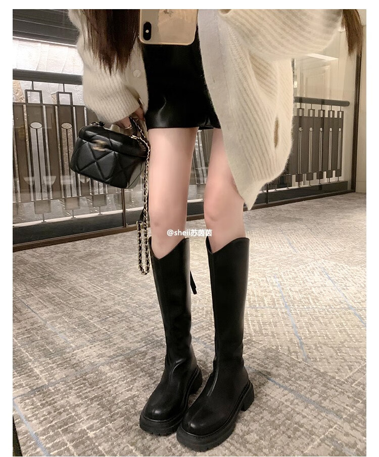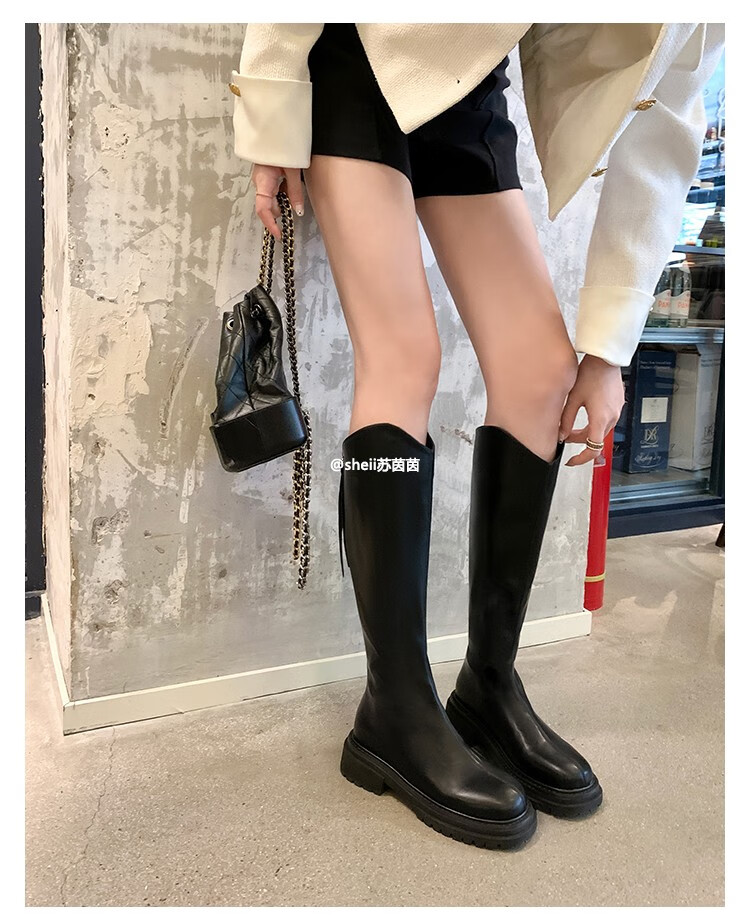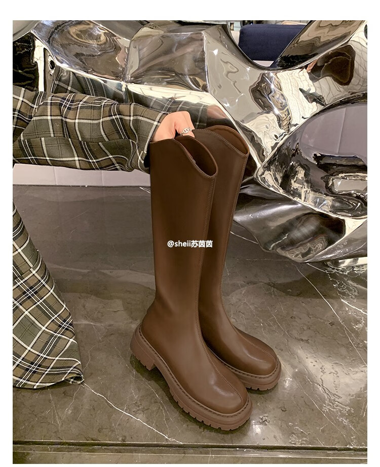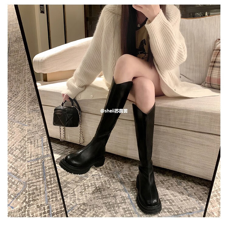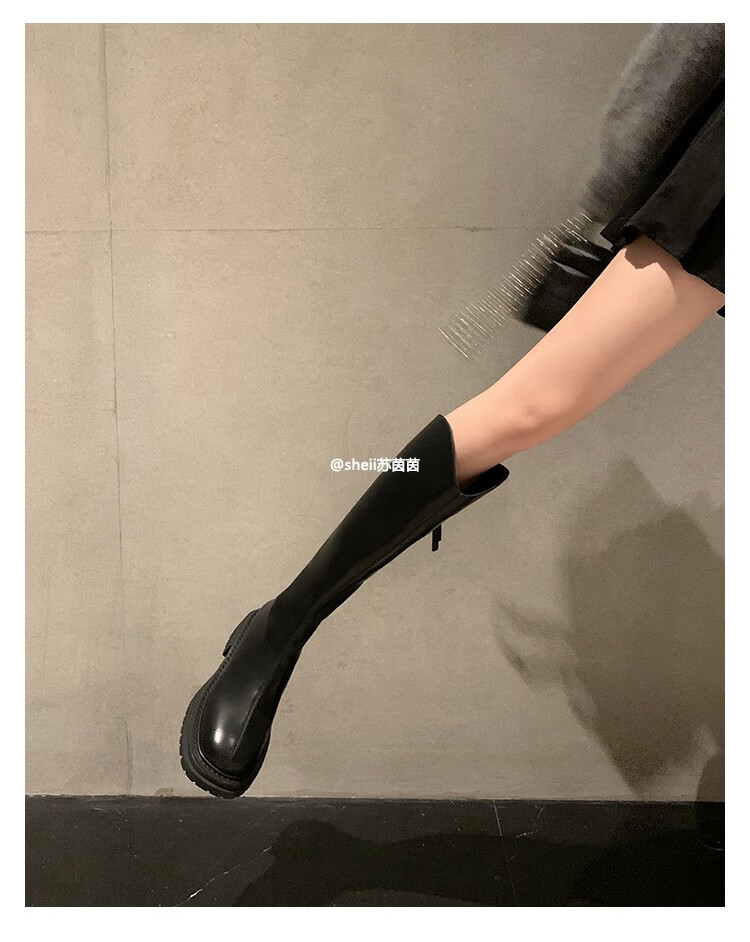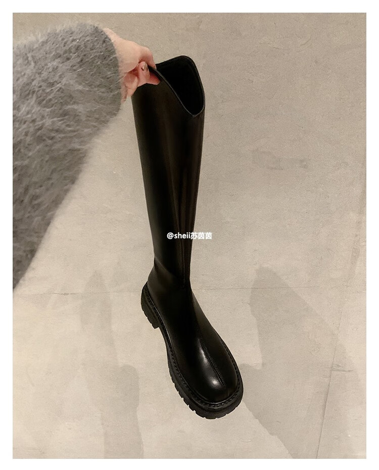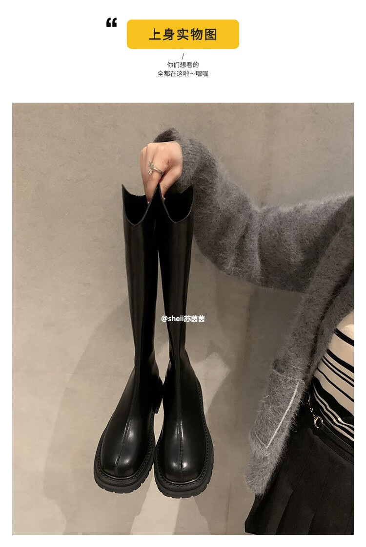苏茵茵【蒋依依同款】女靴V口长筒靴粗跟高筒骑士靴加绒靴子女长靴冬季 黑色(单里) 37