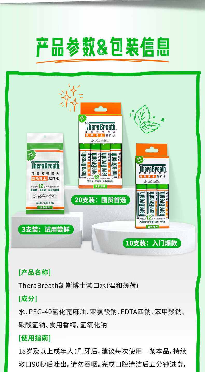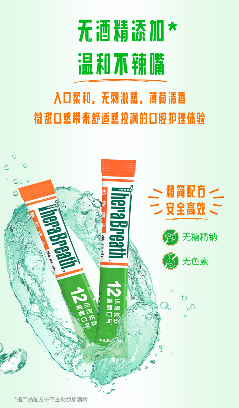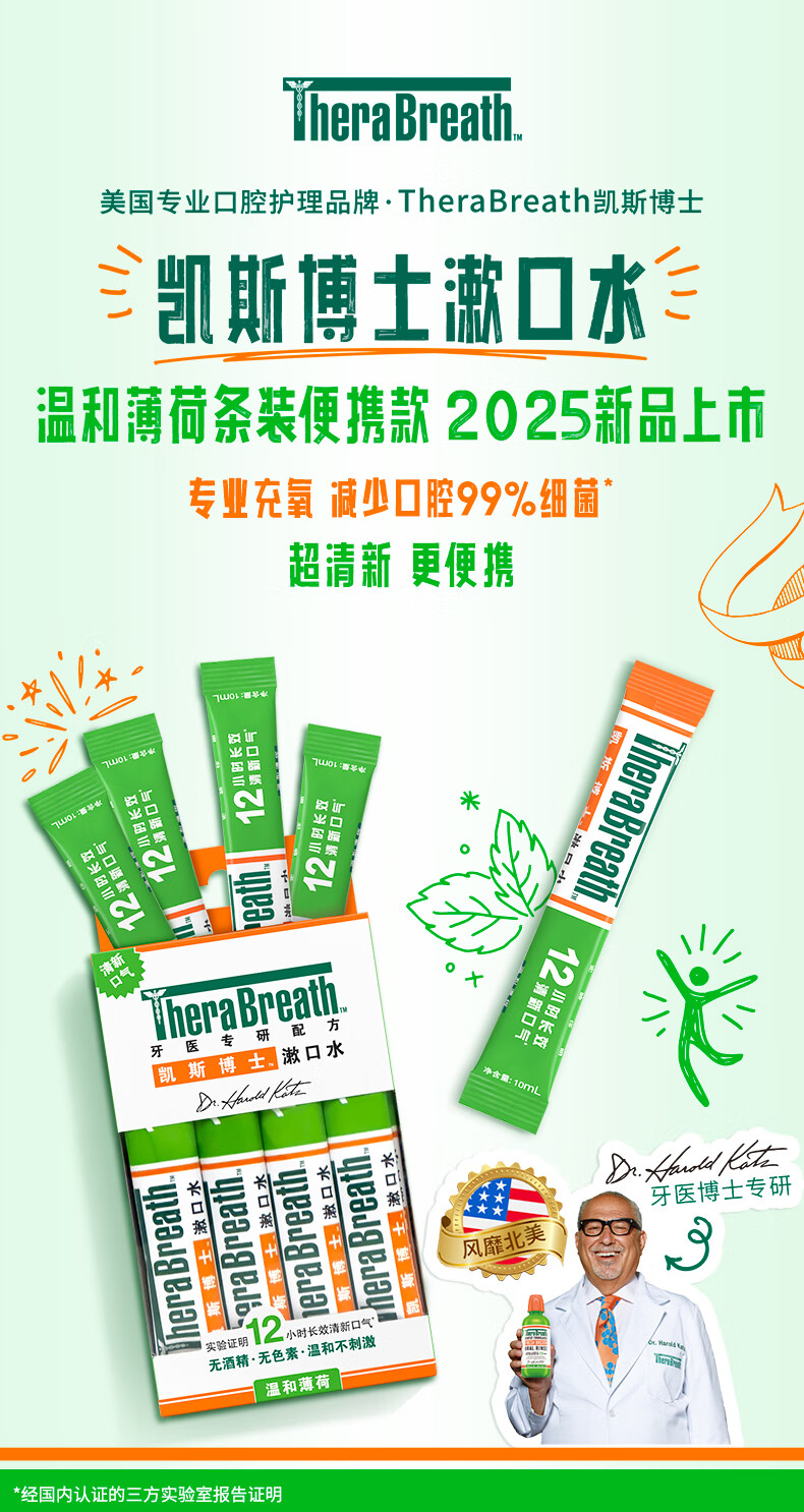 TheraBreath凯斯博士条状漱口水便携旅行装 温和薄荷10ml*3条长效清新口气