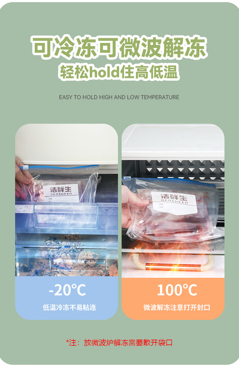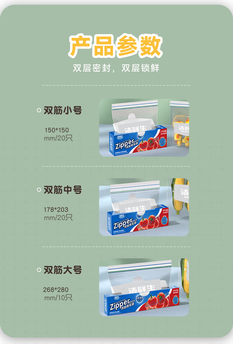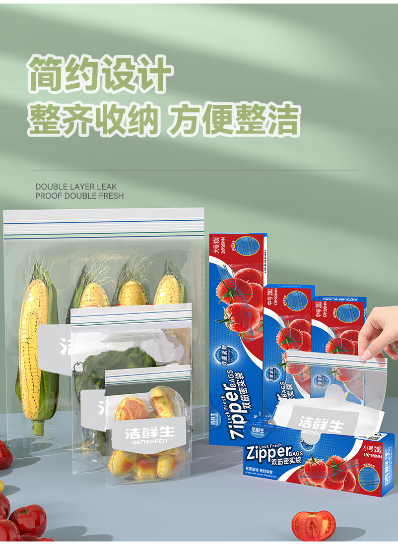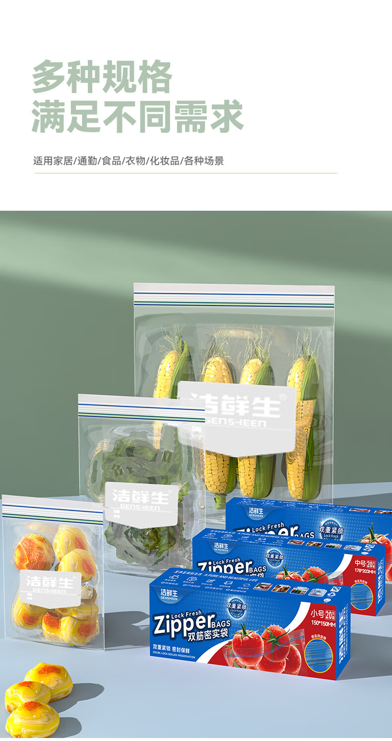 洁鲜生双筋密封袋食品级收纳袋保鲜储物辅食分装袋自封袋子塑料袋密实袋 大中小各2盒共100只