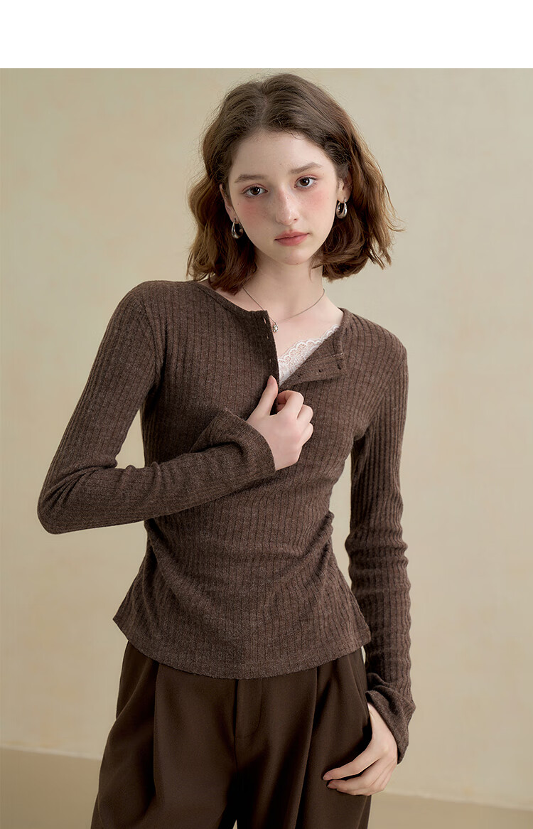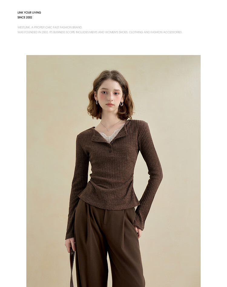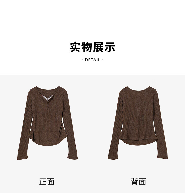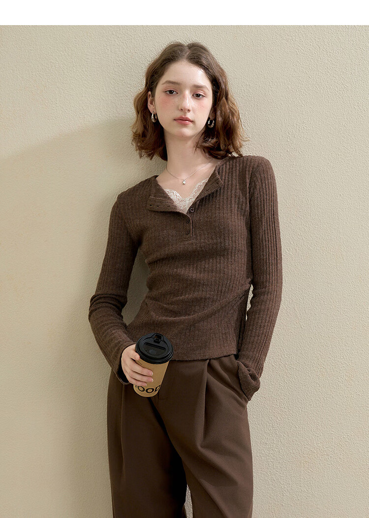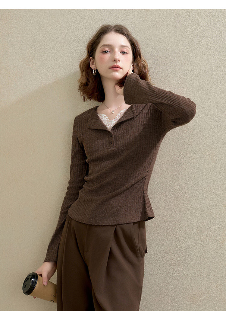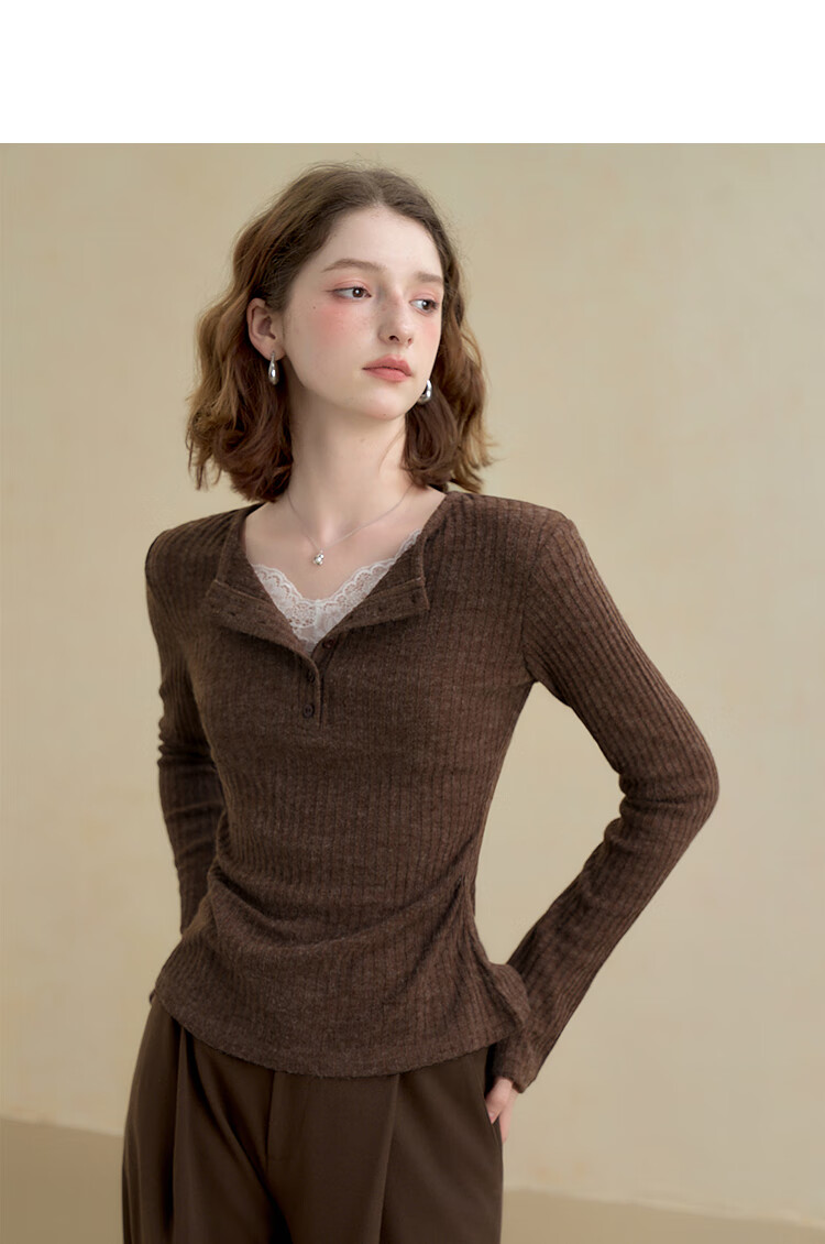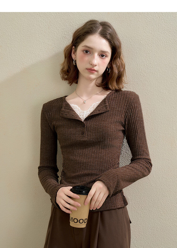 西遇蕾丝拼接假两件V领长袖针织衫女2025秋季修身显瘦软糯T恤上衣 咖色 (L/XL预售15天) L (165)