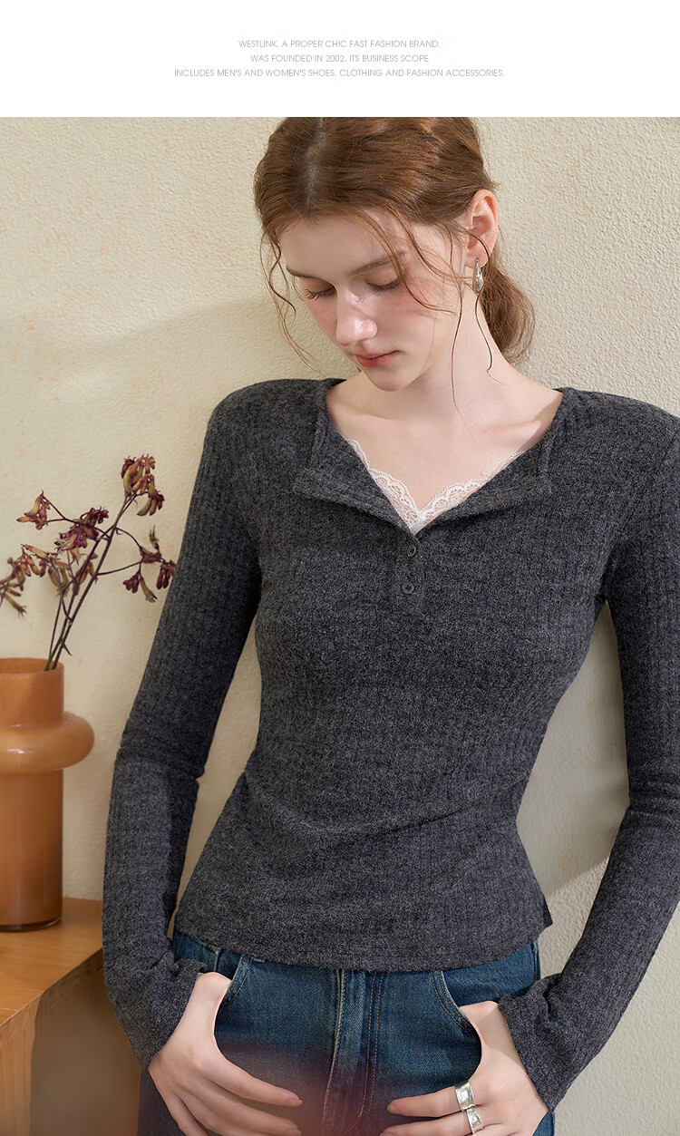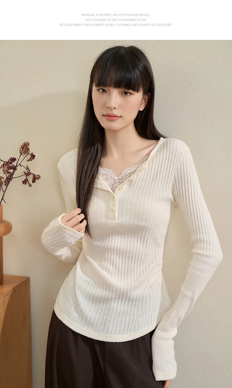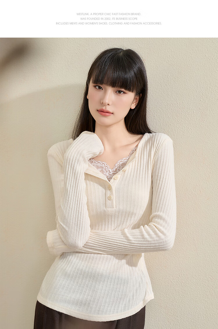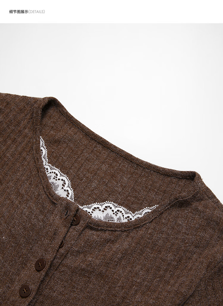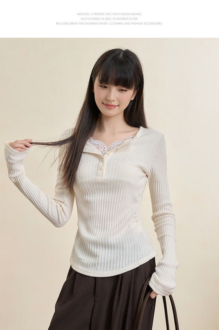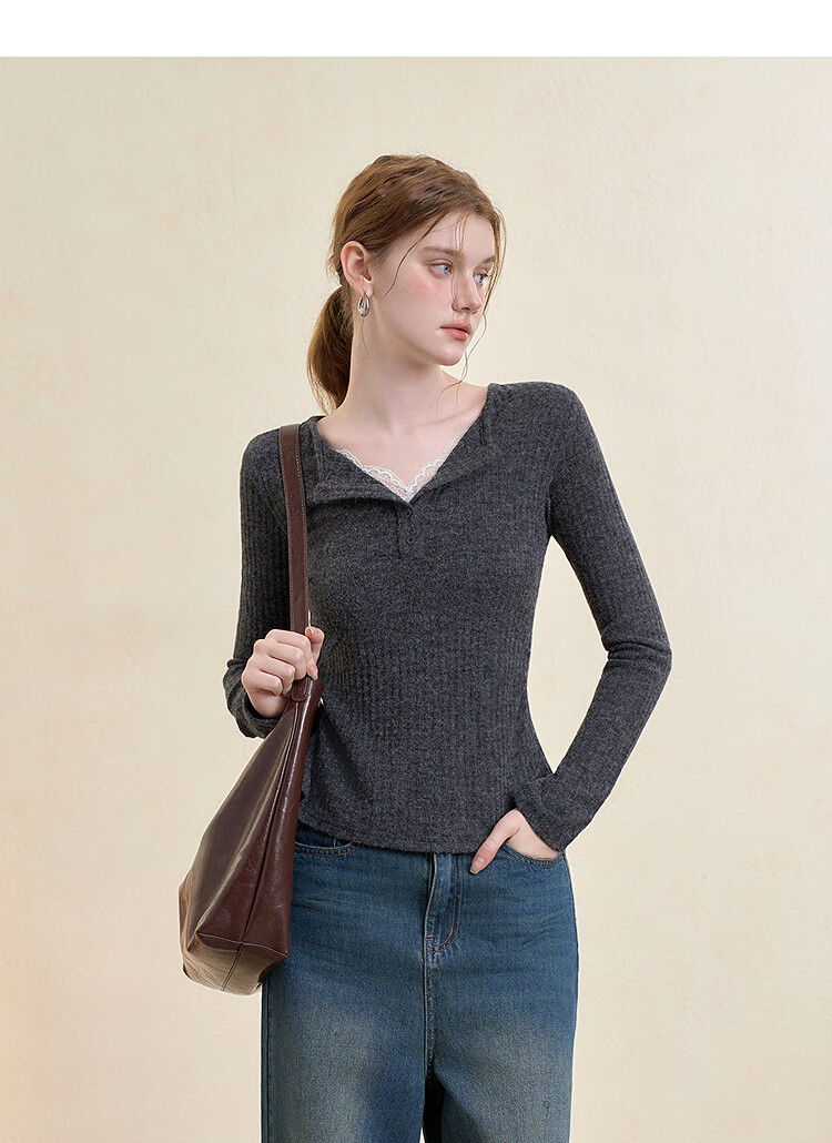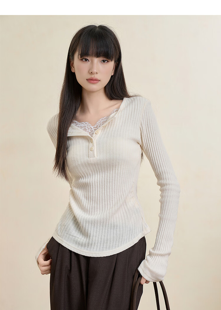 西遇蕾丝拼接假两件V领长袖针织衫女2025秋季修身显瘦软糯T恤上衣 咖色 (L/XL预售15天) L (165)