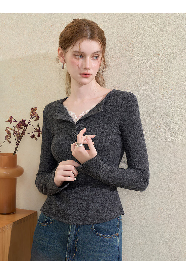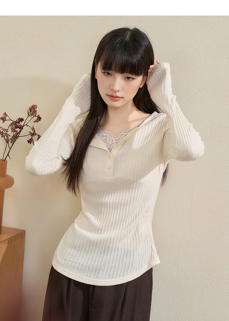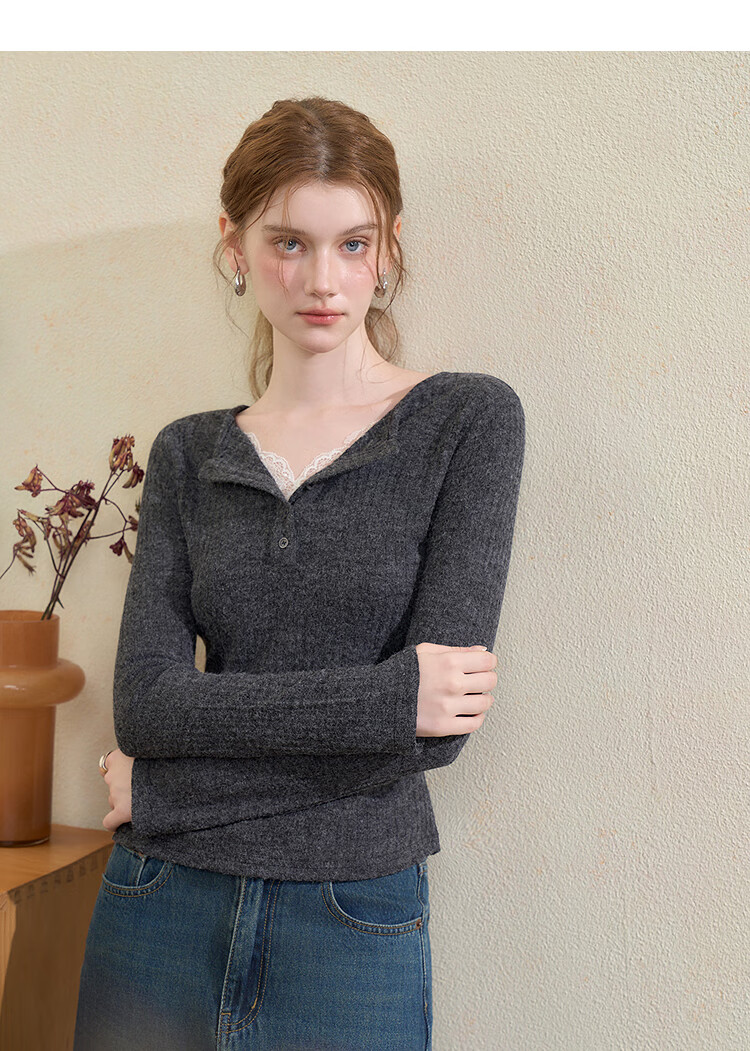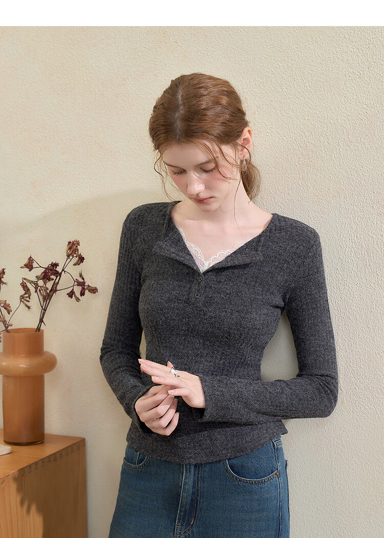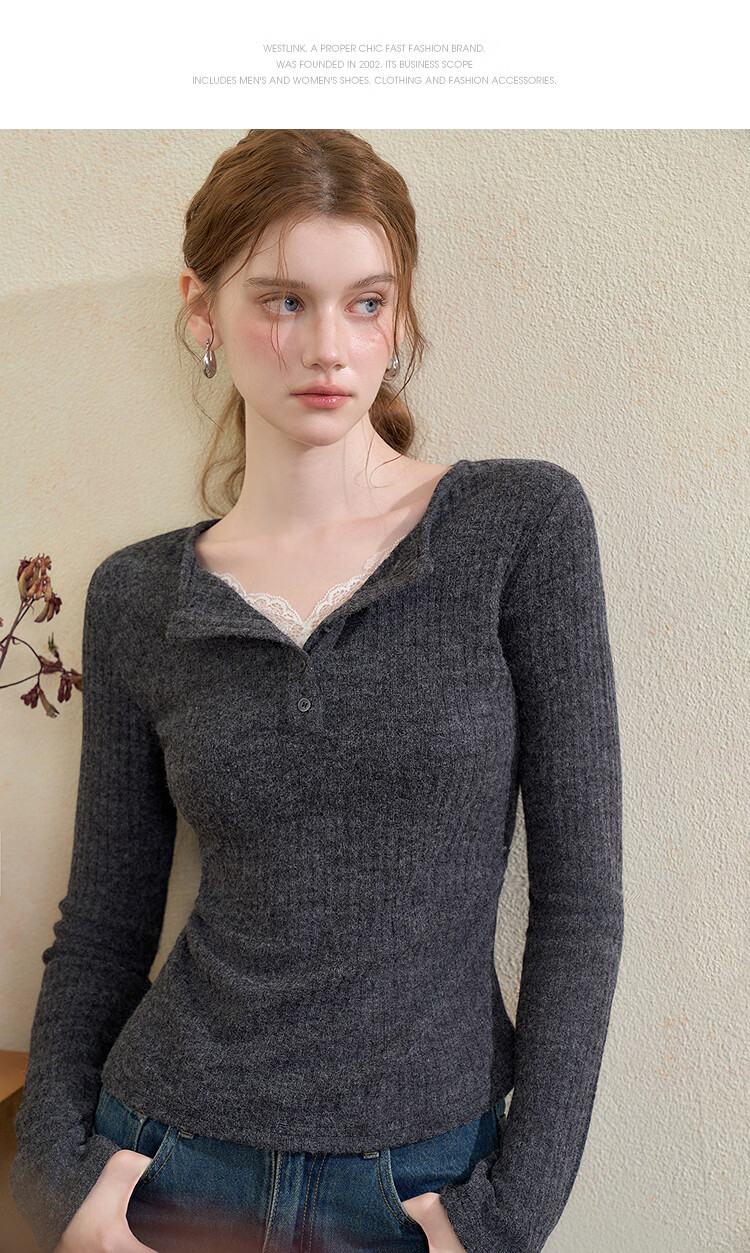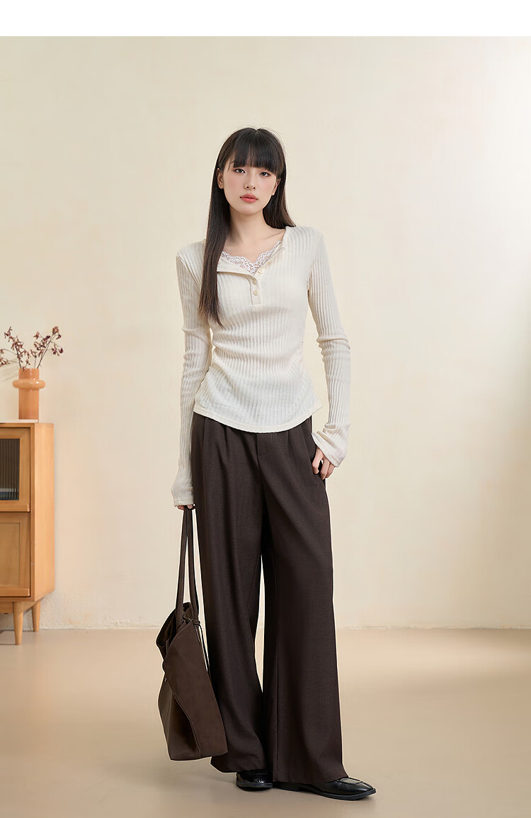 西遇蕾丝拼接假两件V领长袖针织衫女2025秋季修身显瘦软糯T恤上衣 咖色 (L/XL预售15天) L (165)