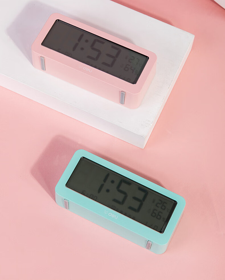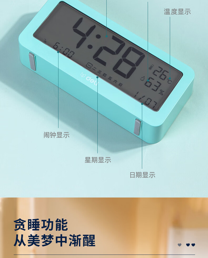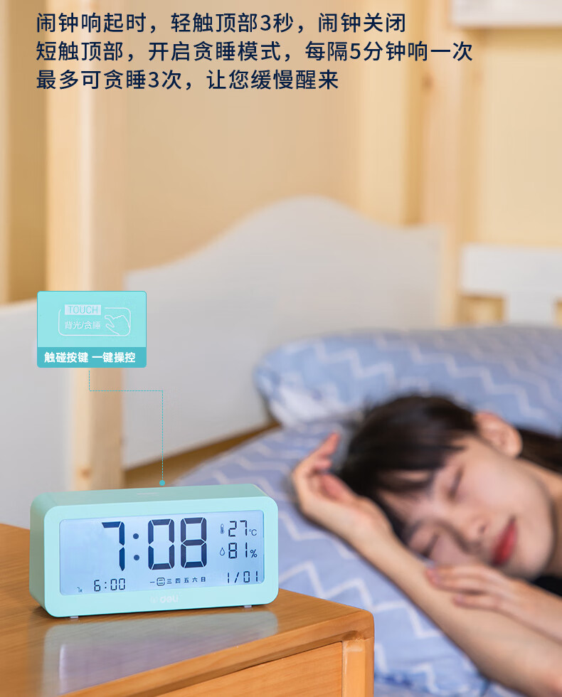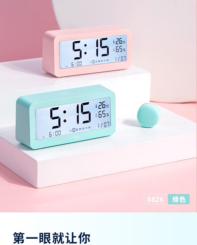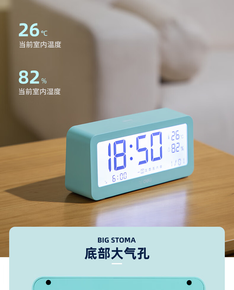 得力(deli)多功能电子闹钟 学生儿童专用起床神器背光床头钟时钟时间管理温湿度计 绿色开学必备礼物开学季