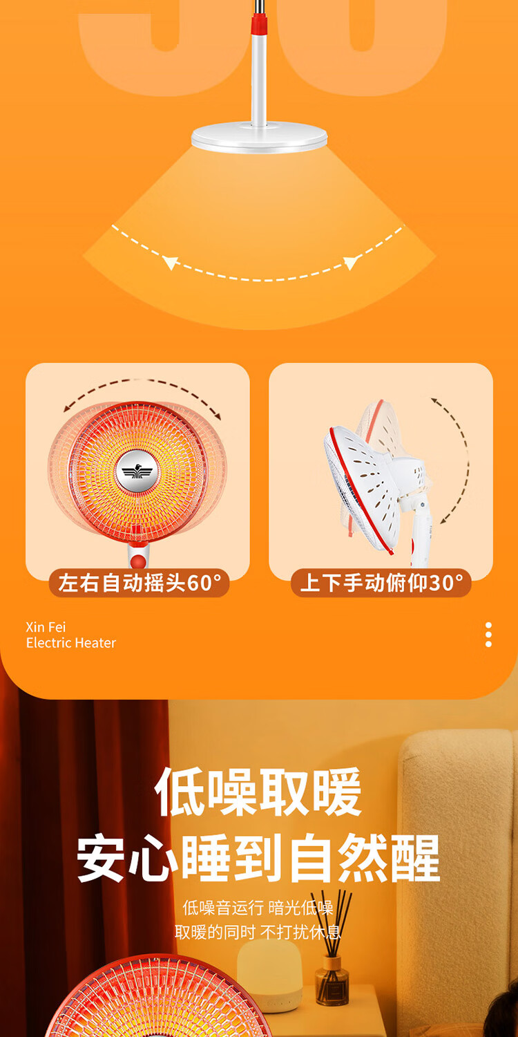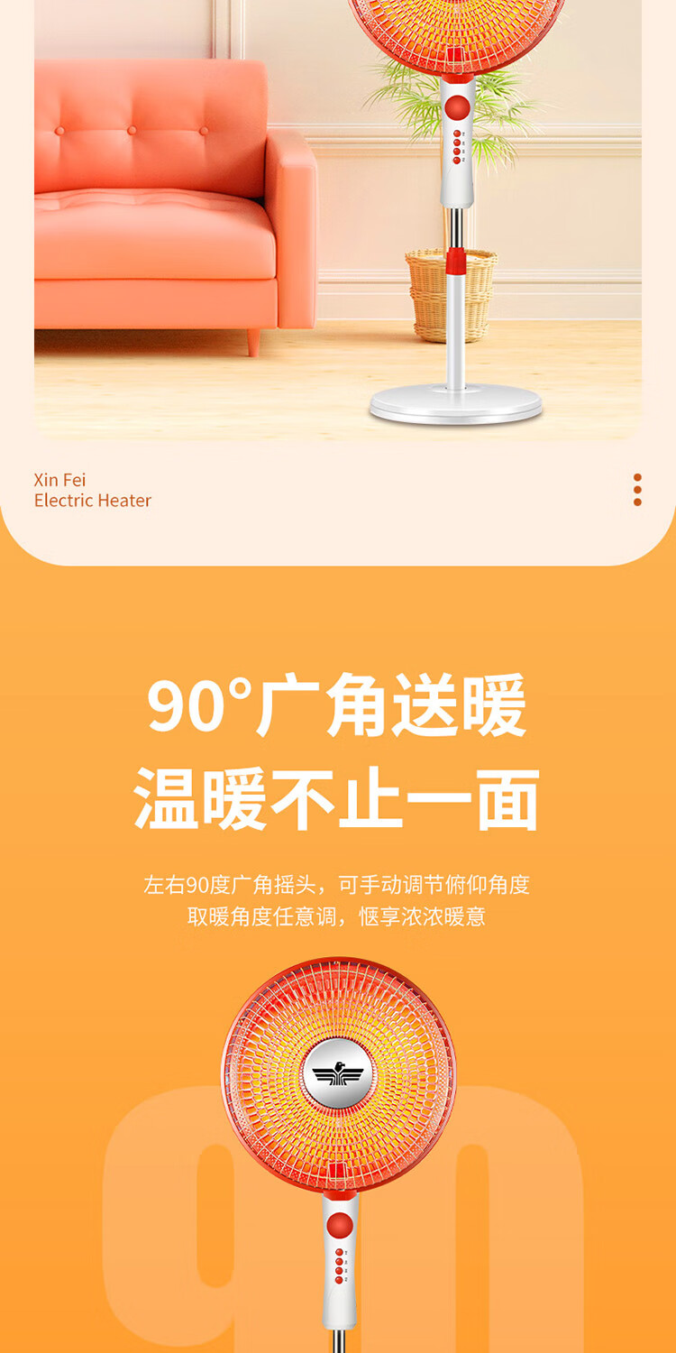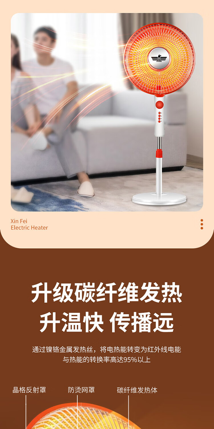 新飞落地小太阳取暖器家用立式电暖气办公室烤火炉卧室取暖扇节能省电落地暖气扇碳纤维加热 超大号顶配款【可摇头 加重底板 加强高热+延长线】 评价晒图返10元