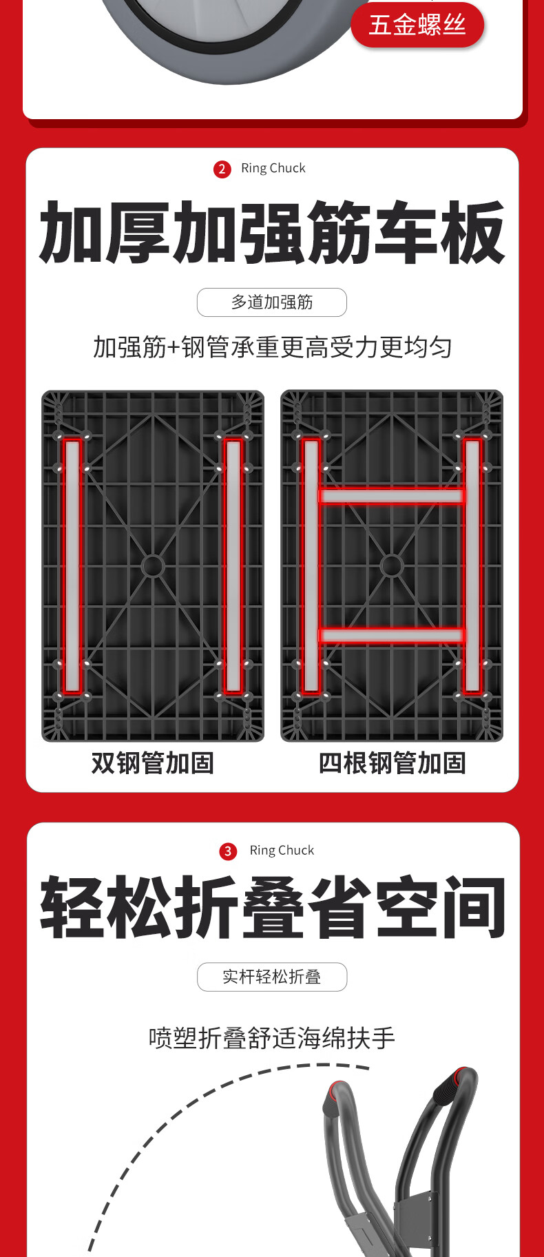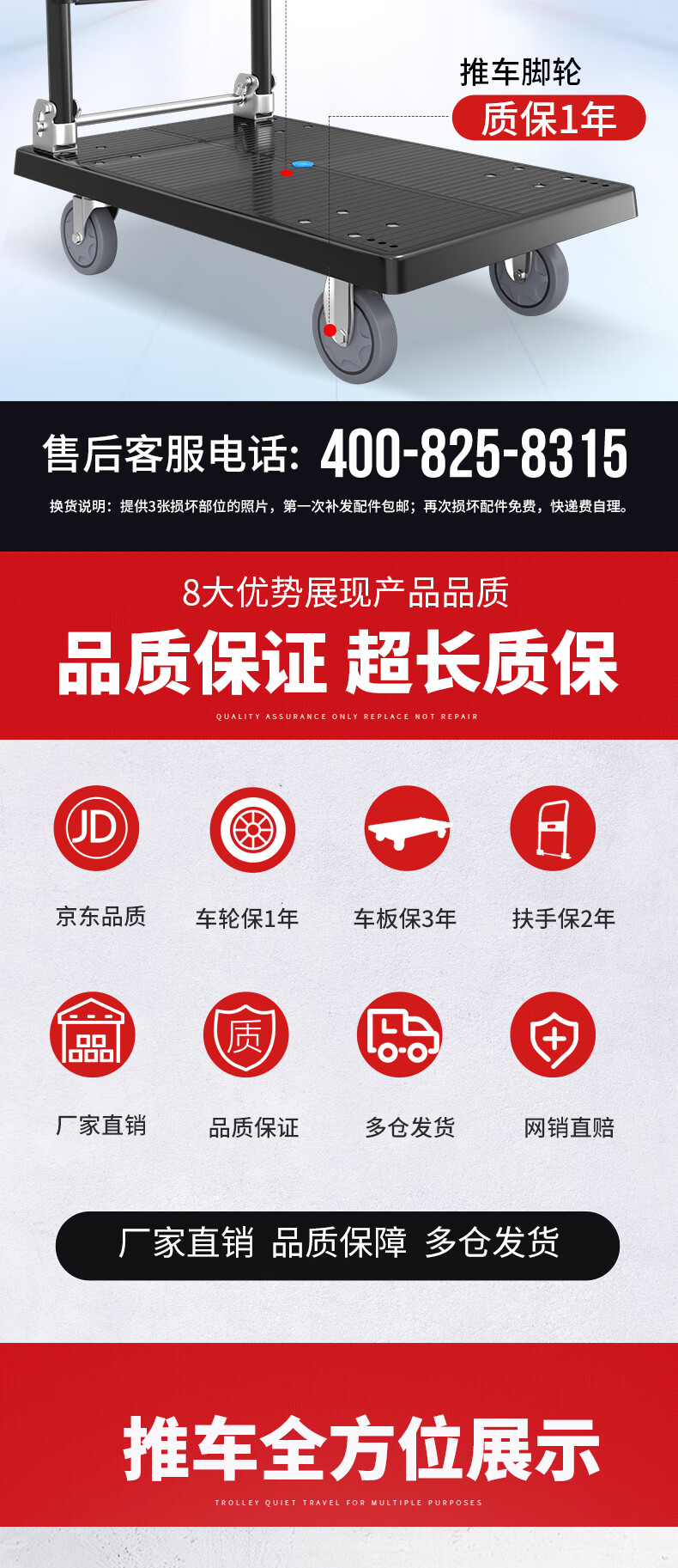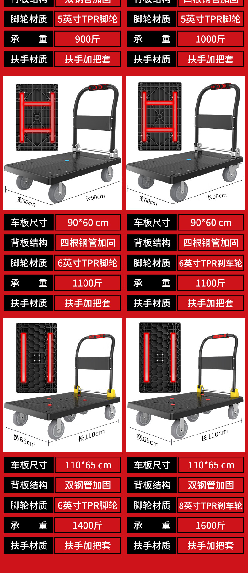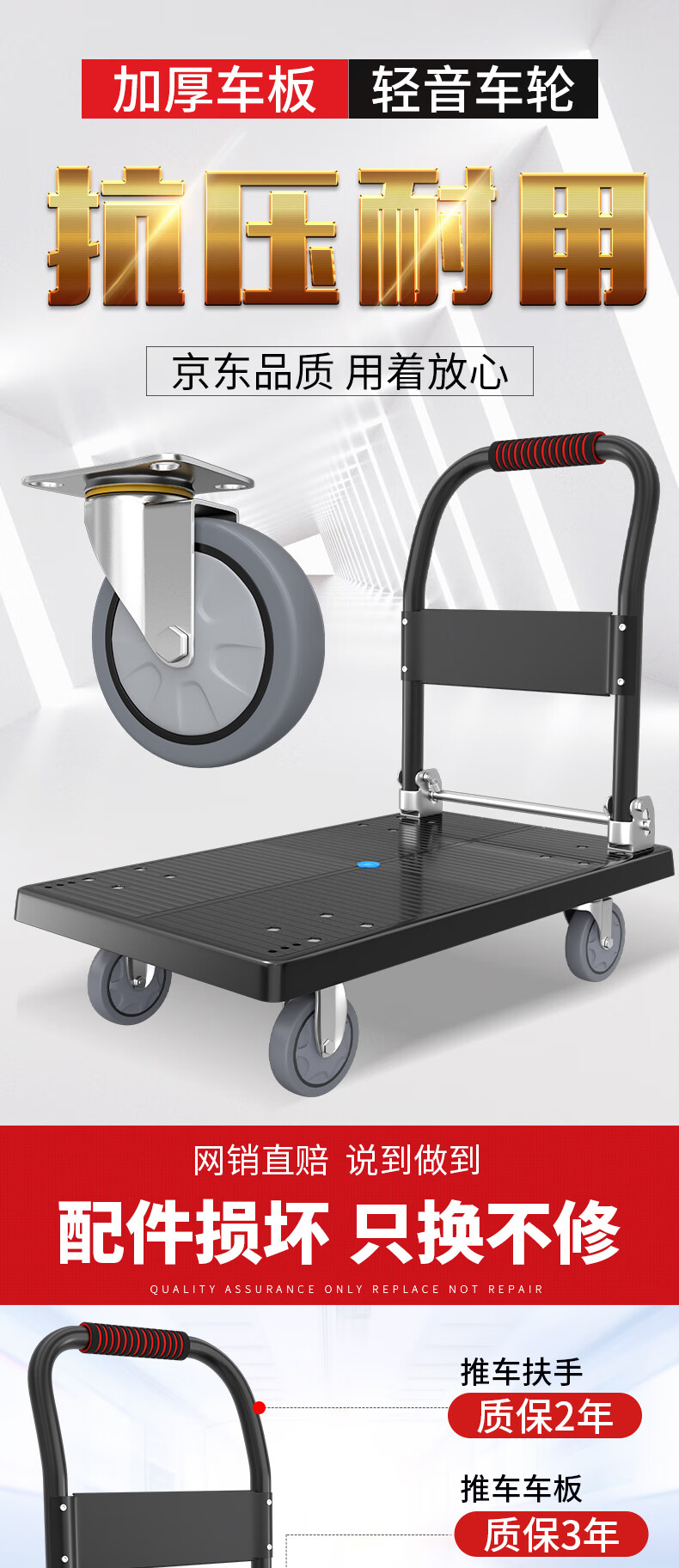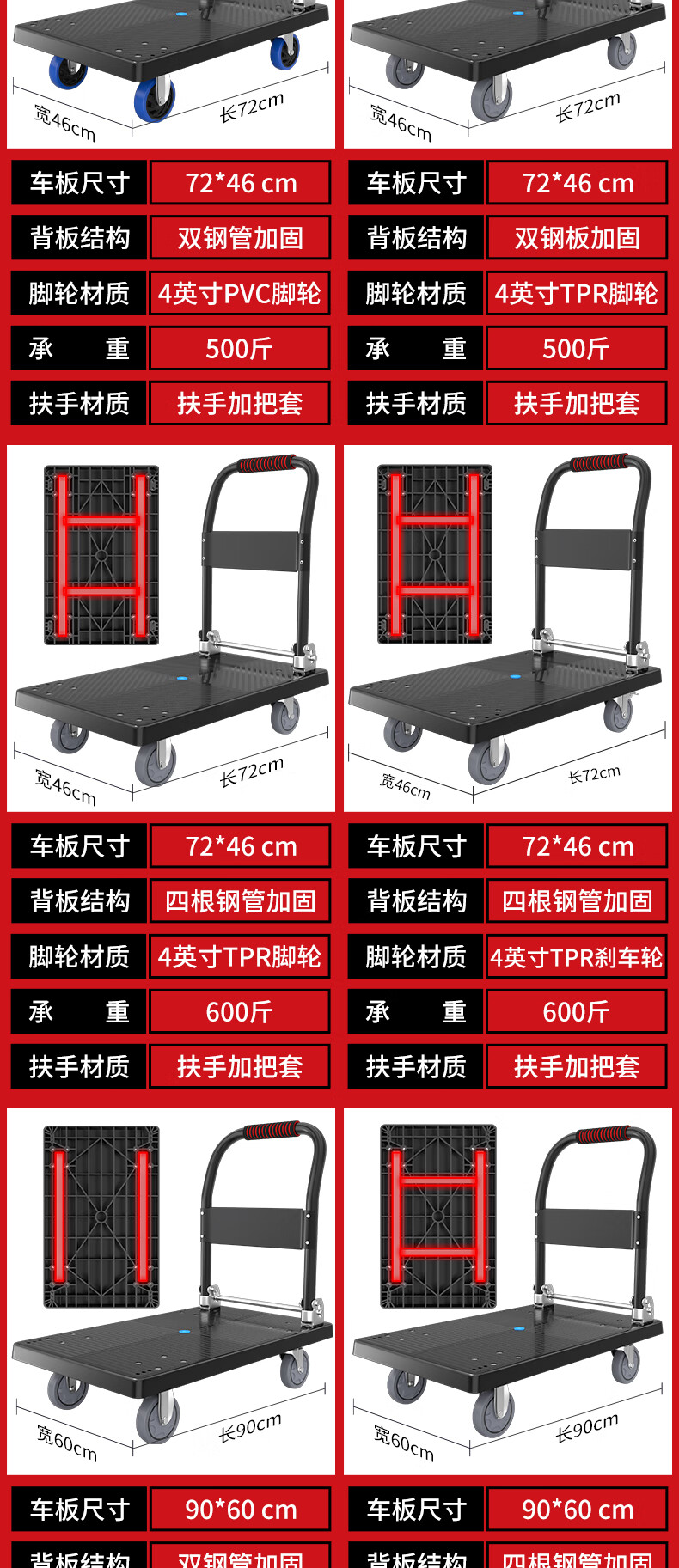好嘉居 小推车手推车 仓库免安装 4/5/6/7轮拖车 折叠平板车拉车手推拉货搬运小拖车装修工厂 72*46丨双管加固丨500斤丨4寸黑色轻音轮