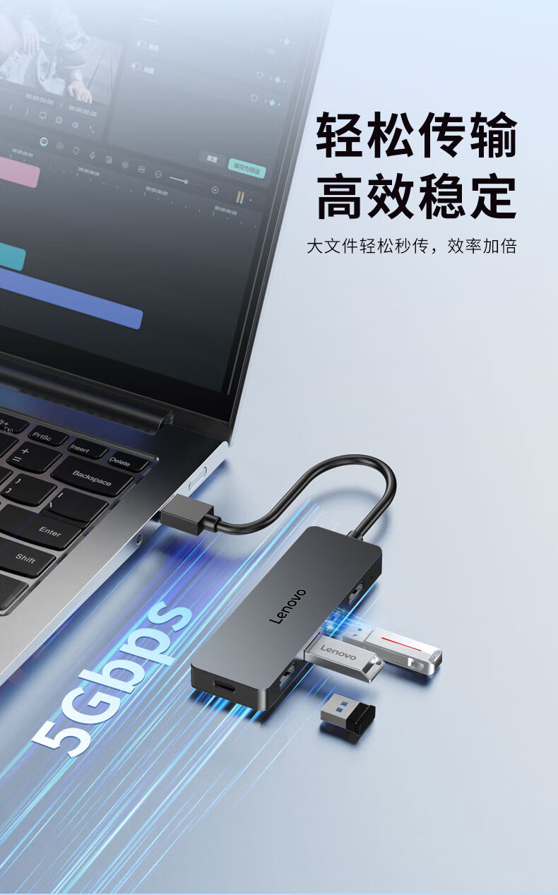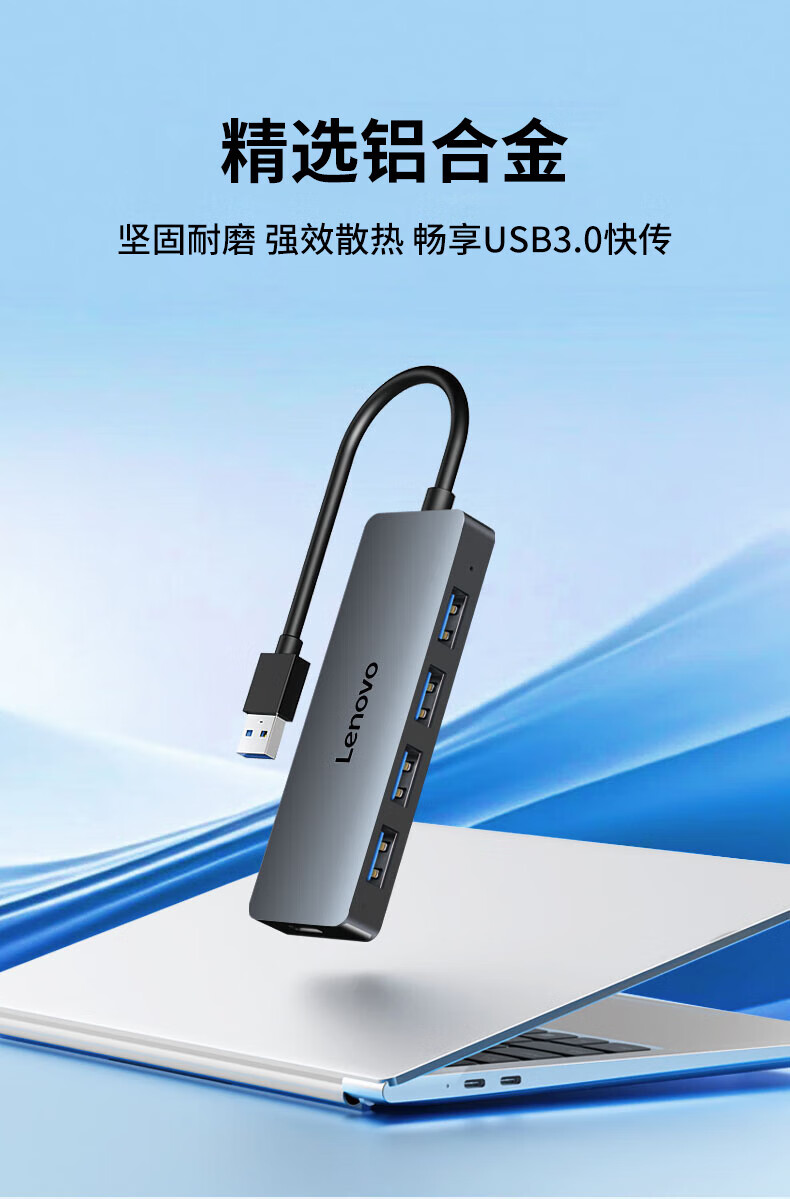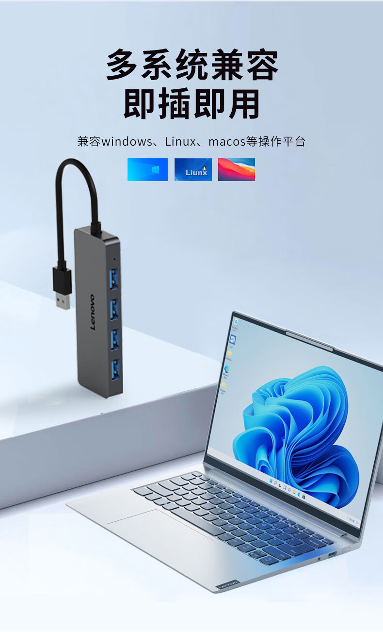 联想(Lenovo)USB3.0分线器4口高速扩展坞笔记本电脑拓展坞延长线四合一集线器转换器扩展器转换头通用1.5M