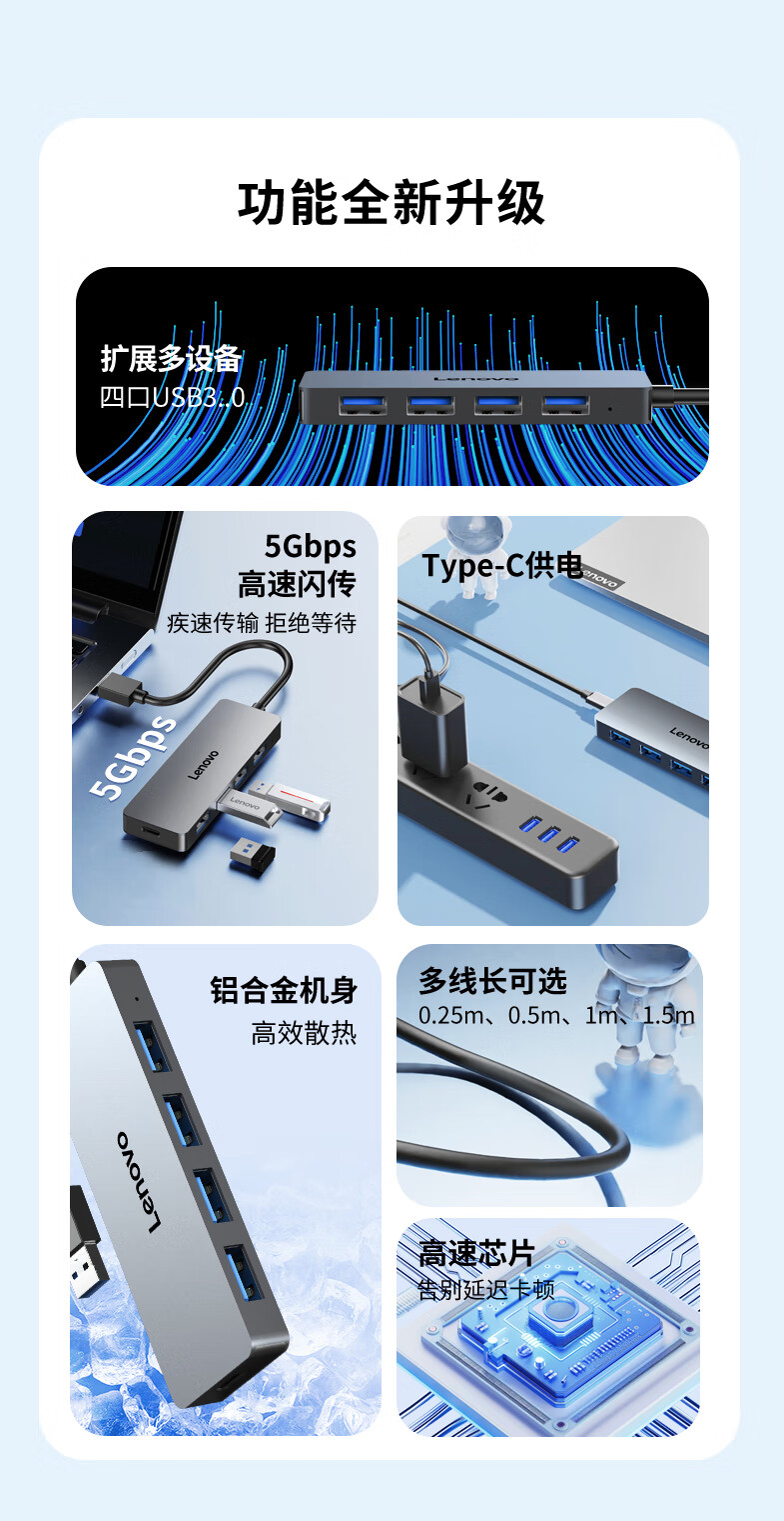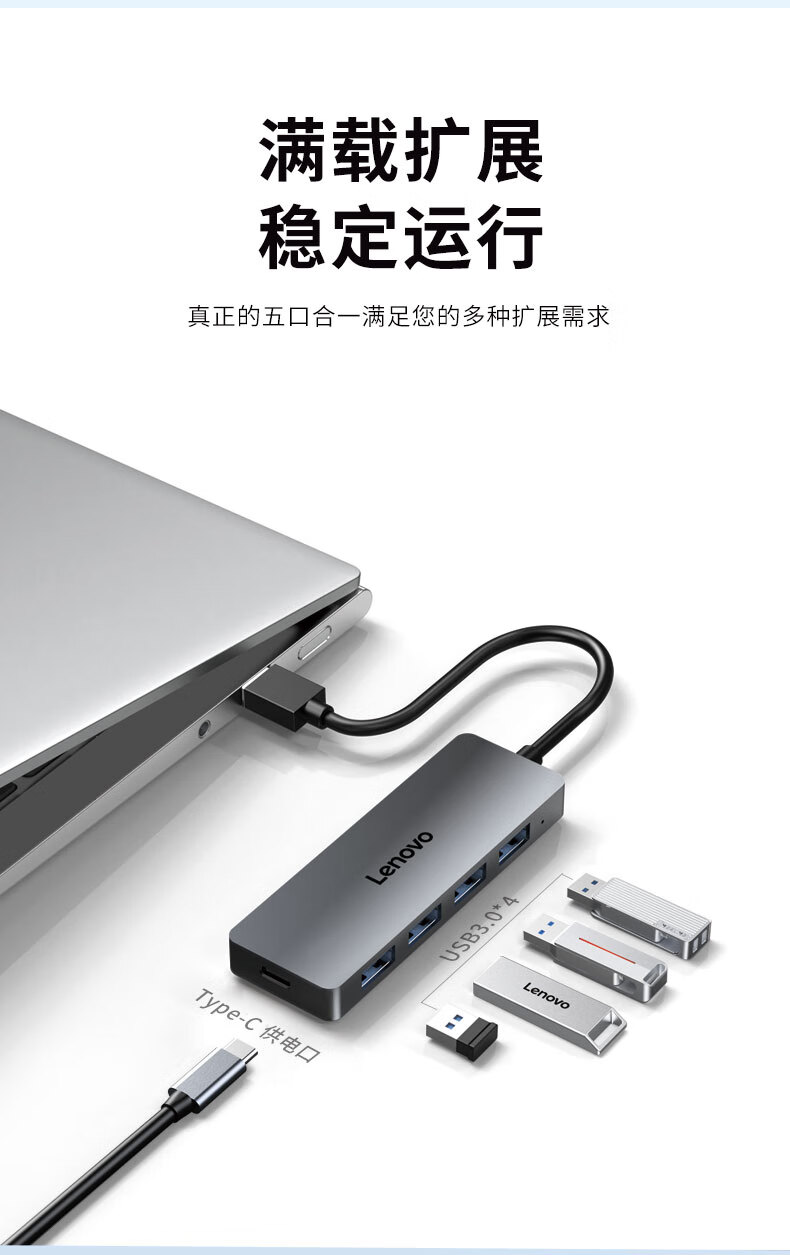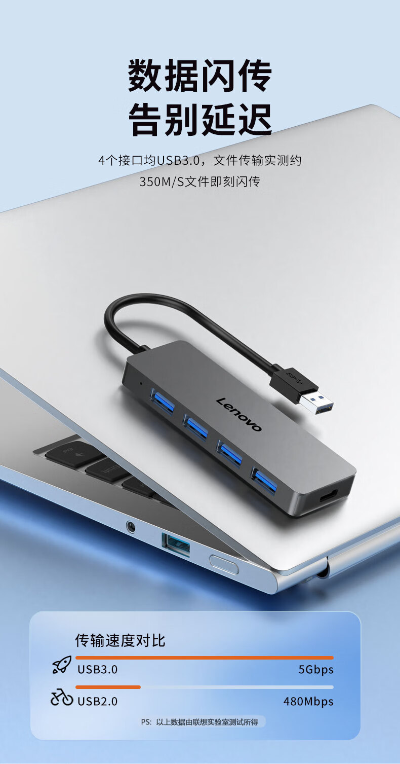 联想(Lenovo)USB3.0分线器4口高速扩展坞笔记本电脑拓展坞延长线四合一集线器转换器扩展器转换头通用1.5M