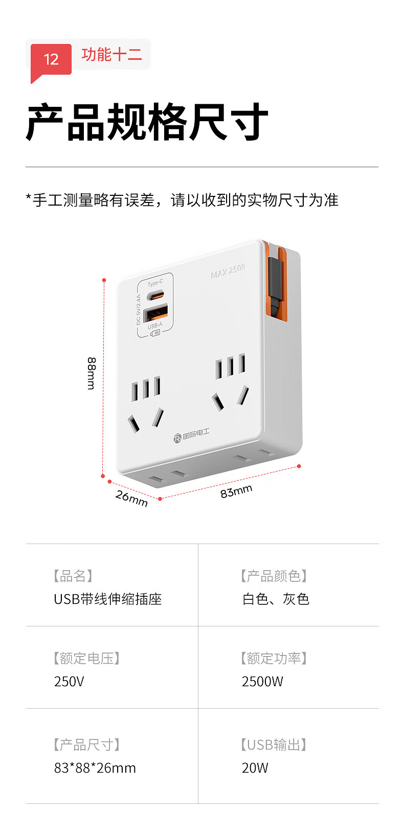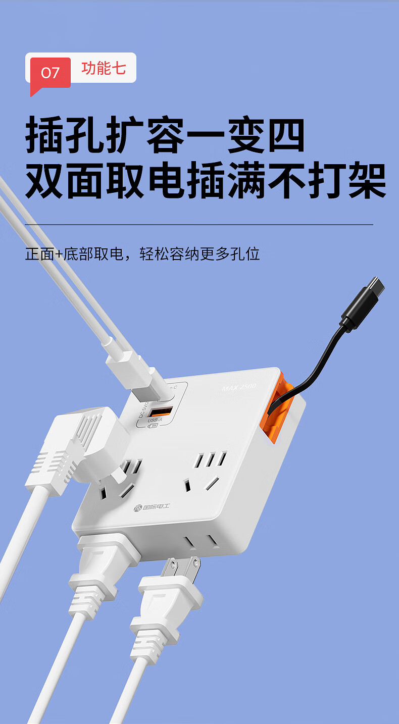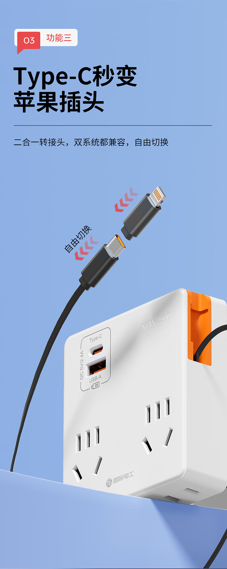 FDD国际电工20W快充带伸缩线86型直插转换器插座多功能一转四插板二合一接口 带C伸缩线一转四【A+C】白色
