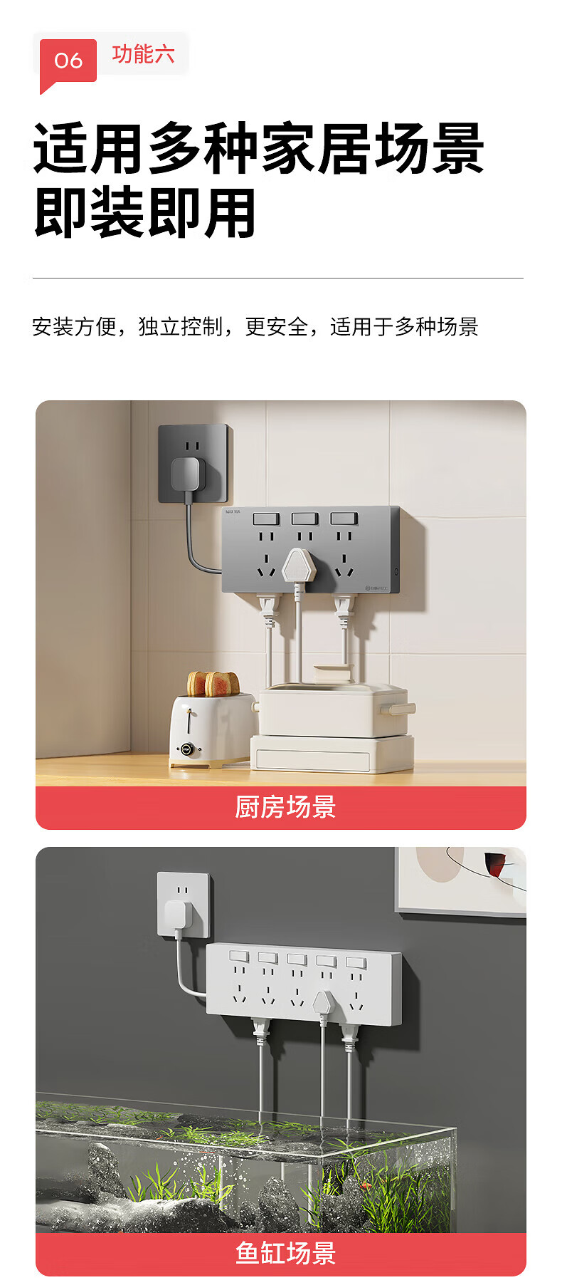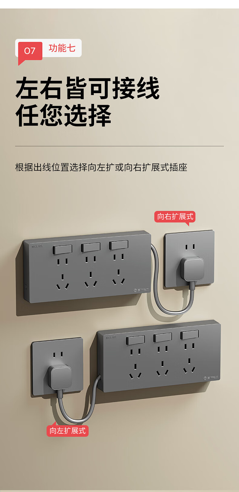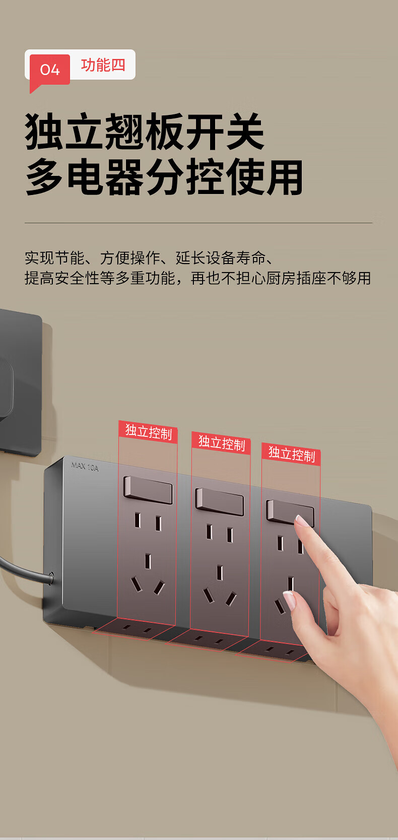 国际电工(FDD)厨房扩展插座多功能明装带线插板墙壁免打孔分控开关电源插排 白色三开21孔-向左扩展-带电源线