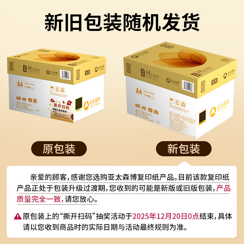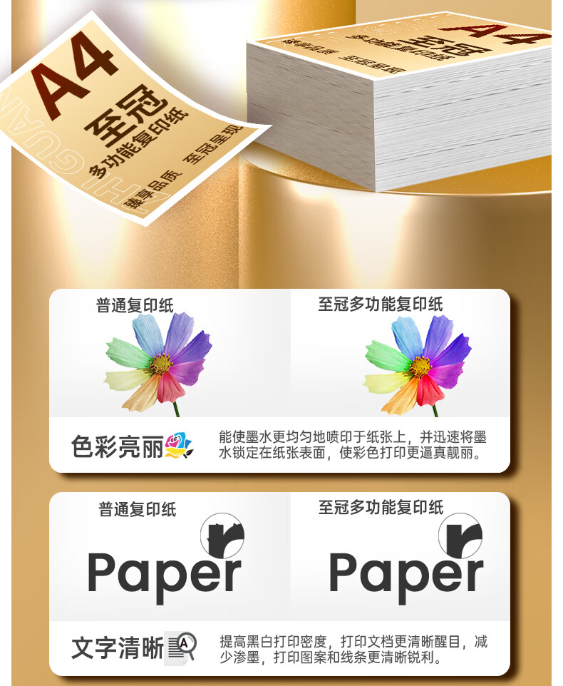 亚太森博至冠(金典)A4打印纸 75g500张*5包一箱 办公用纸 高清影印 双面不透印复印纸 整箱2500张