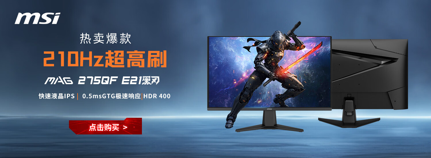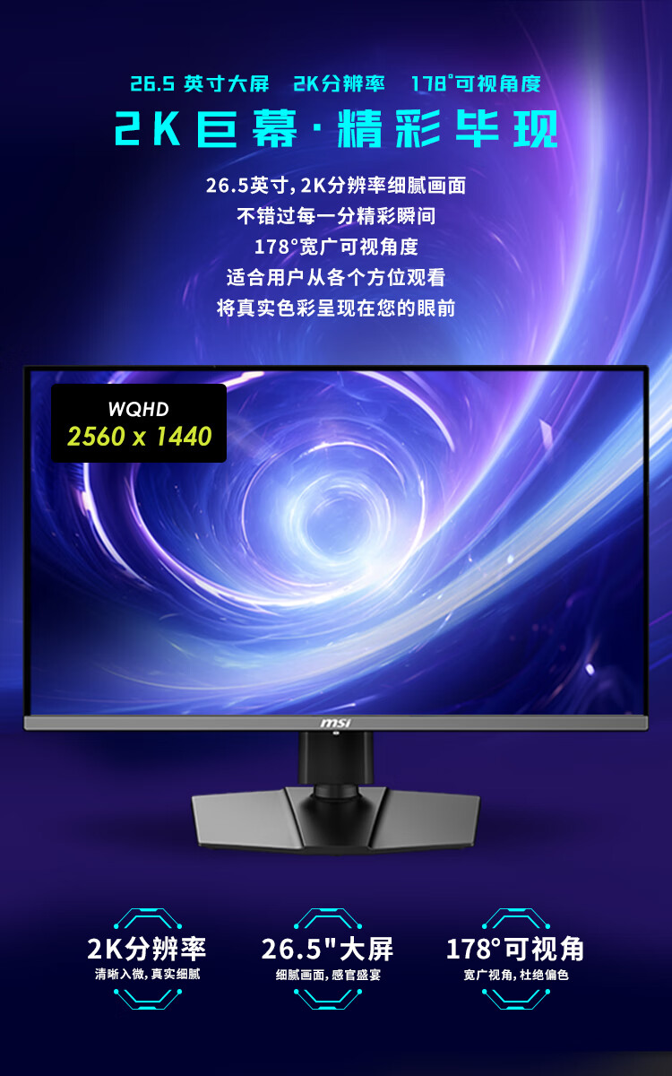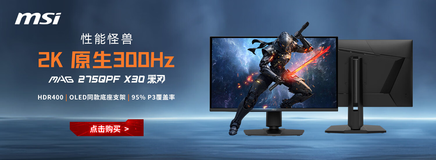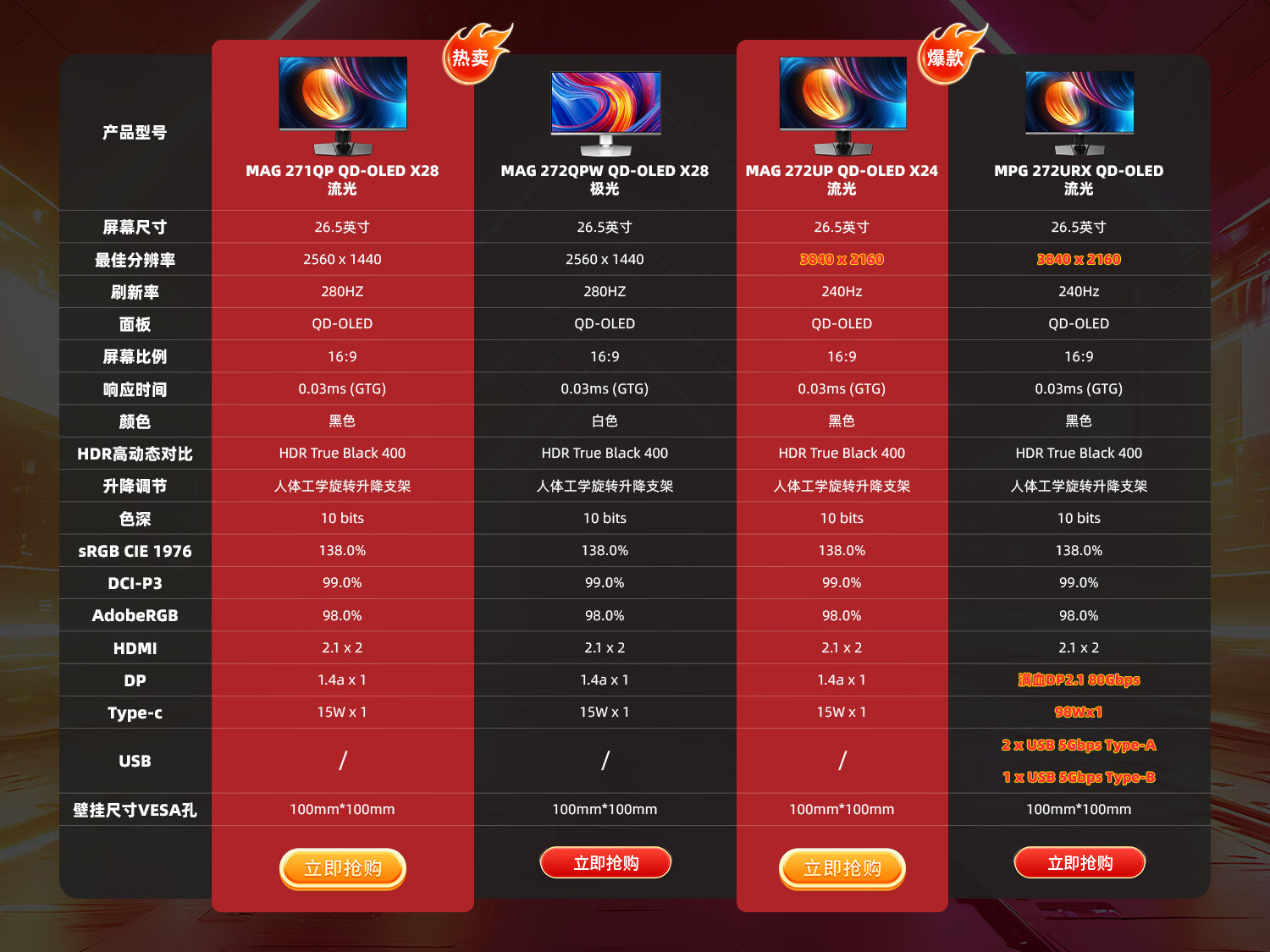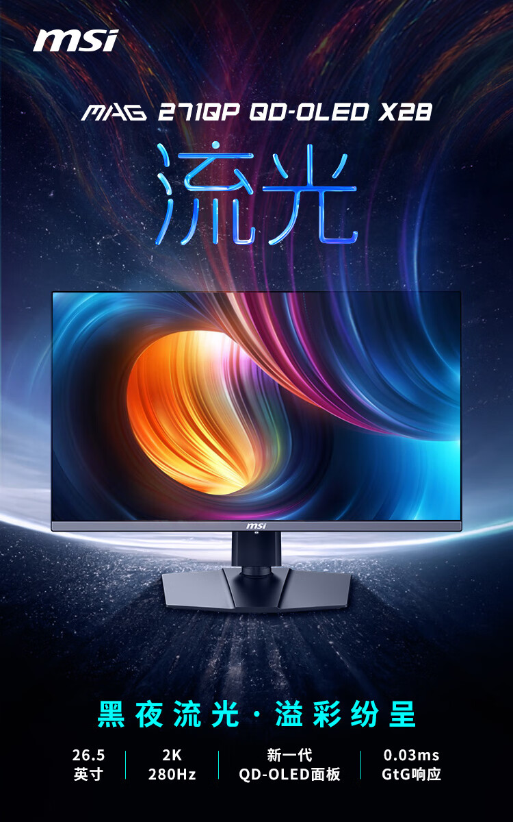 微星(MSI)27英寸2K280Hz 量子点OLED显示器 0.03ms(GTG) HDR400游戏电竞显示屏MAG 271QP QD-OLED X28流光