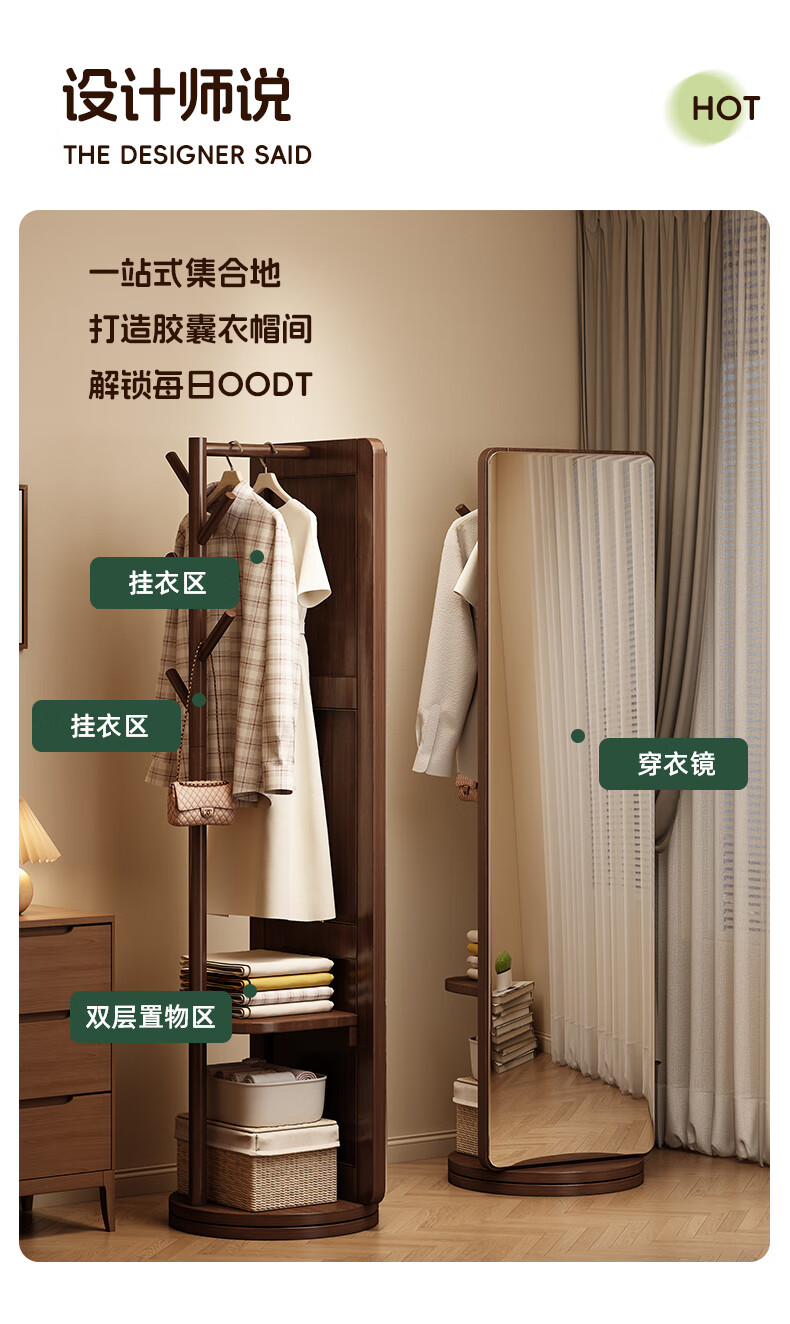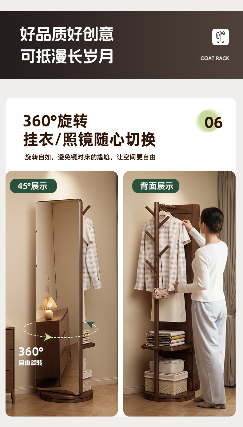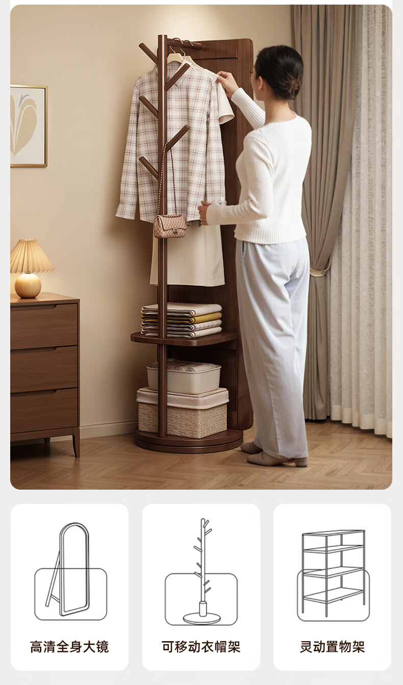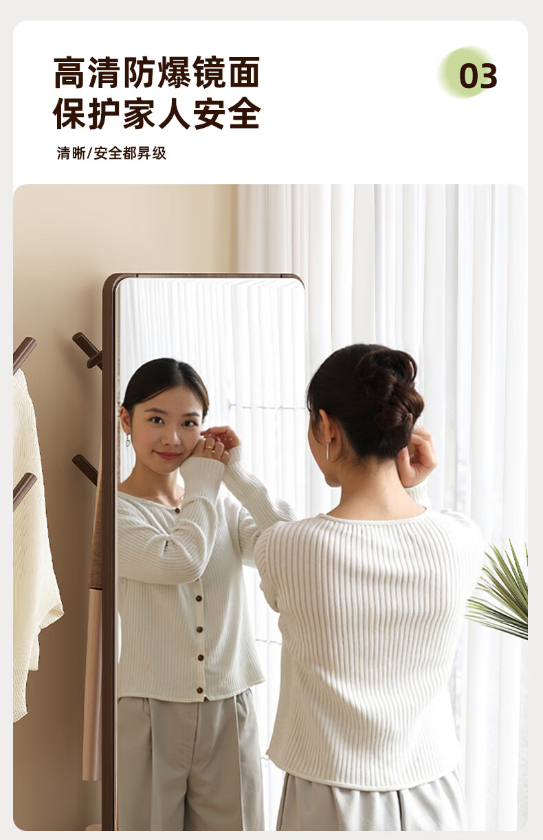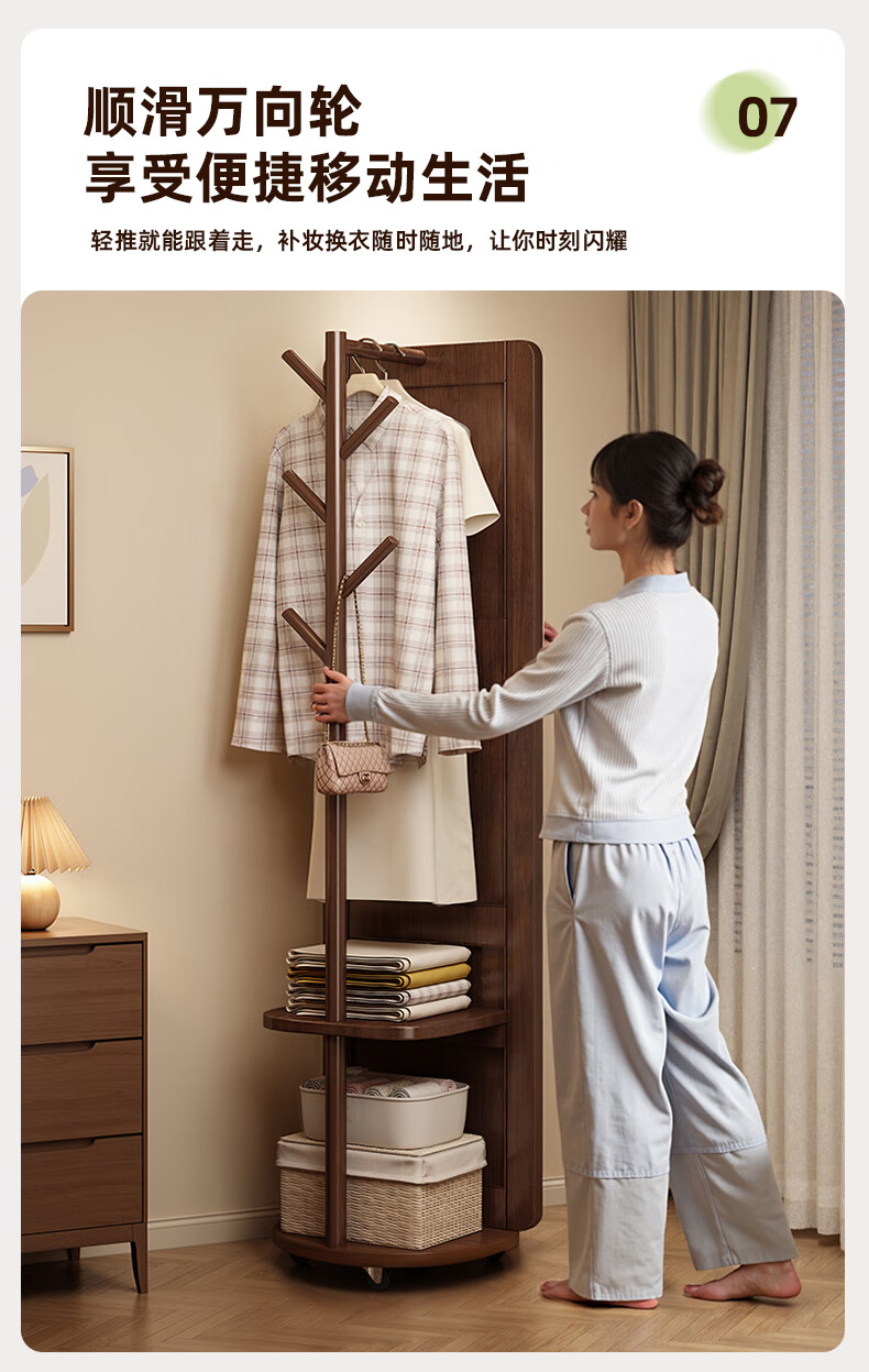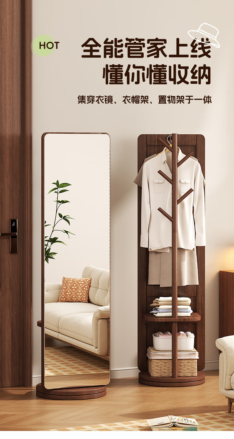 顾家家居镜子全身镜落地镜穿衣镜挂衣架衣帽架一体可移动可旋转试衣镜 【实木双层旋转款】胡桃色 【免费送货上门】