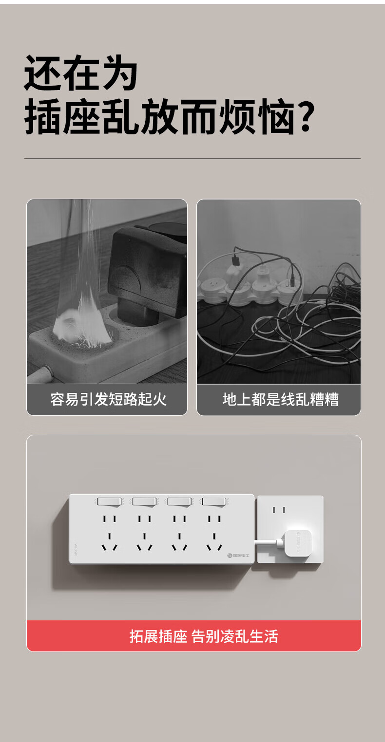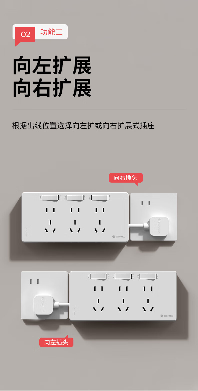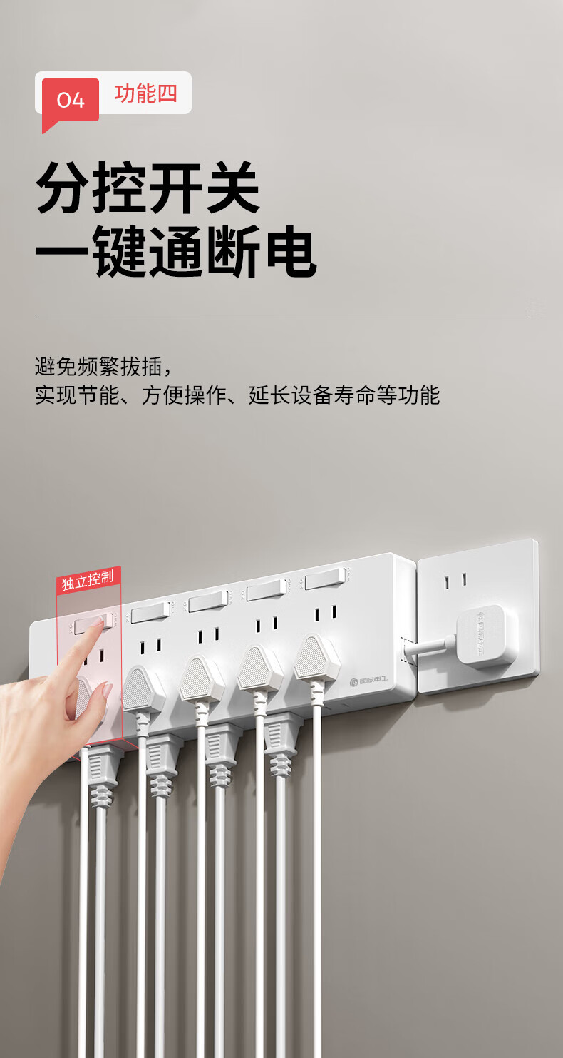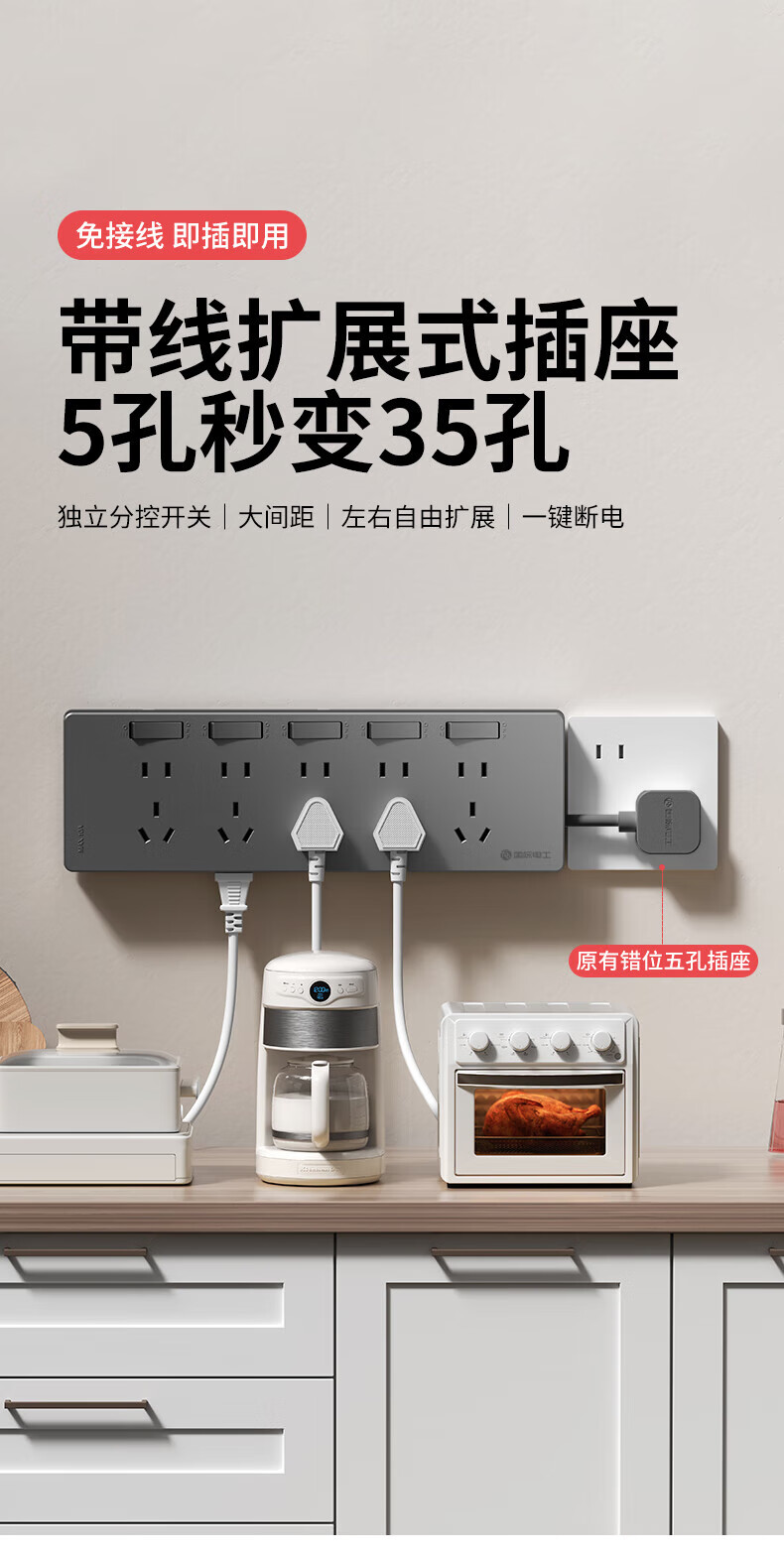 国际电工带短线拓展插座免打孔厨房专用排插转换器插头插座床头多功能面板 白色向右扩展-三开21孔【自带电源线 即插即用】